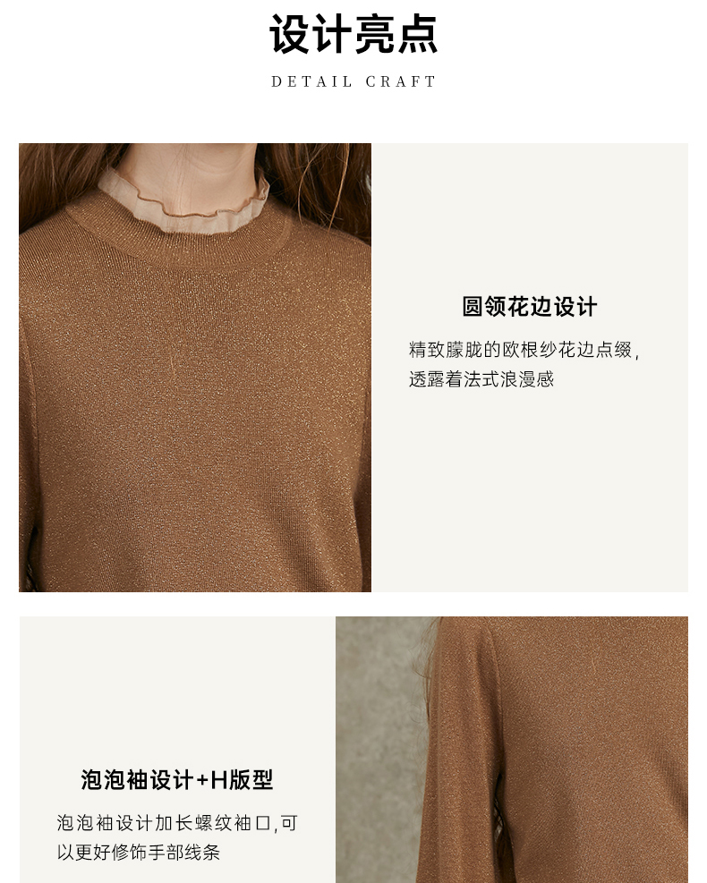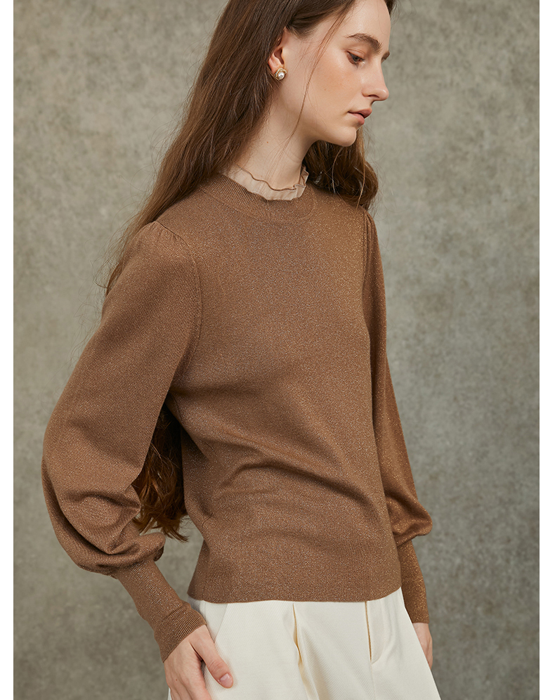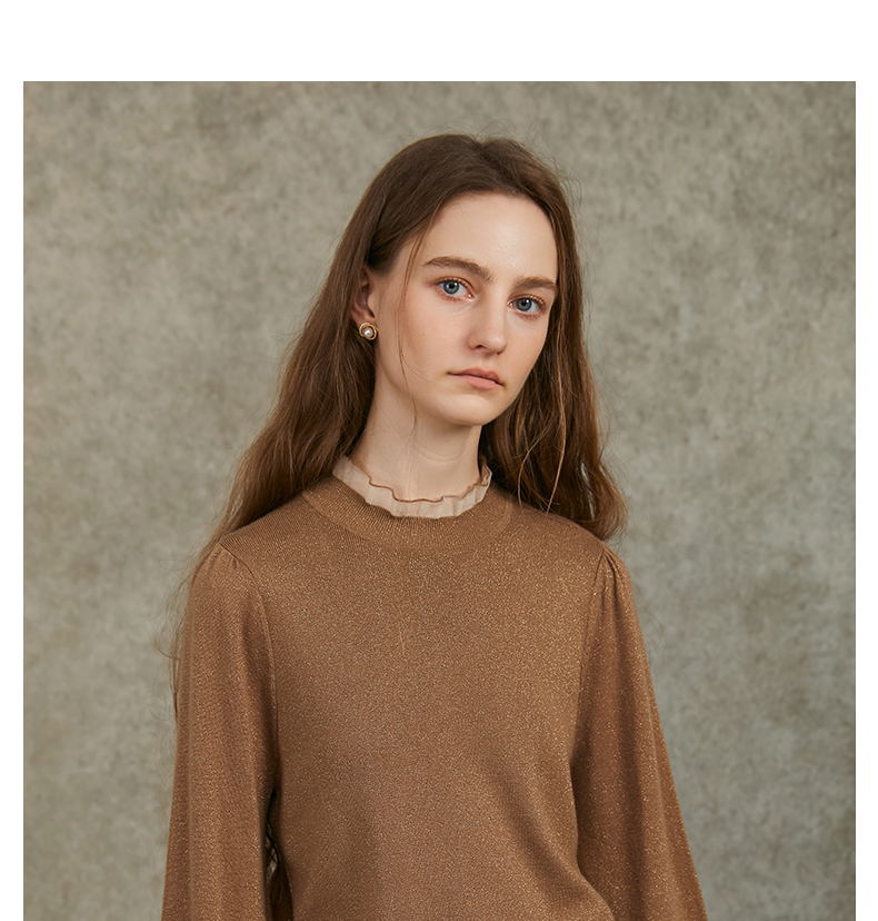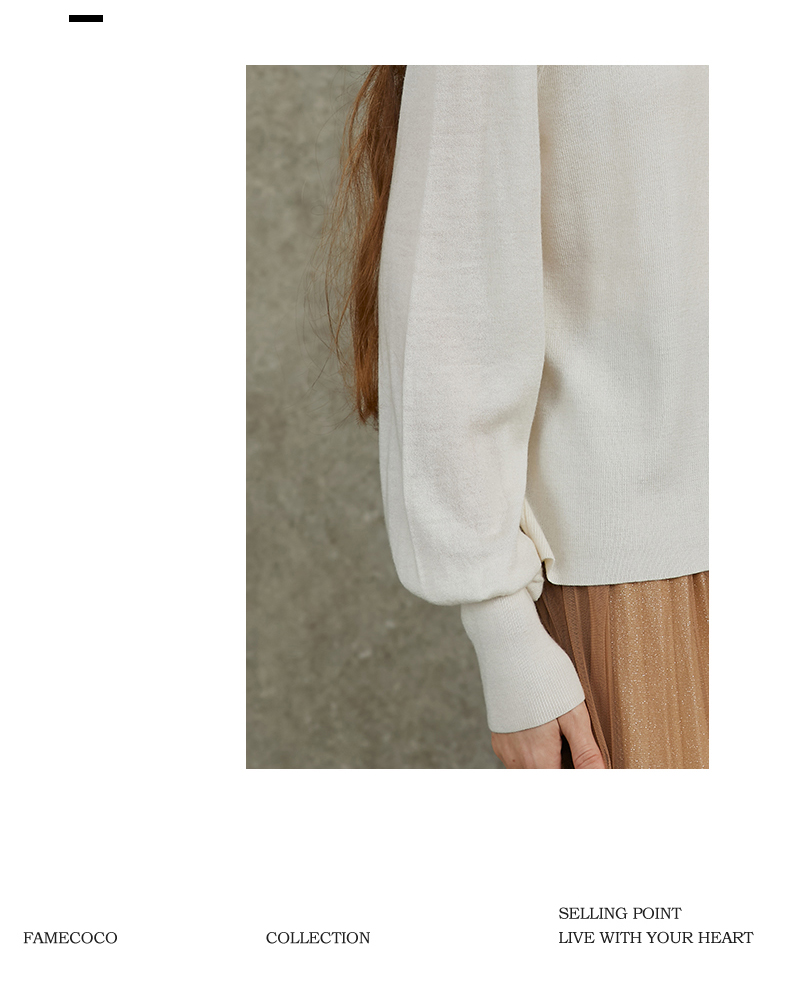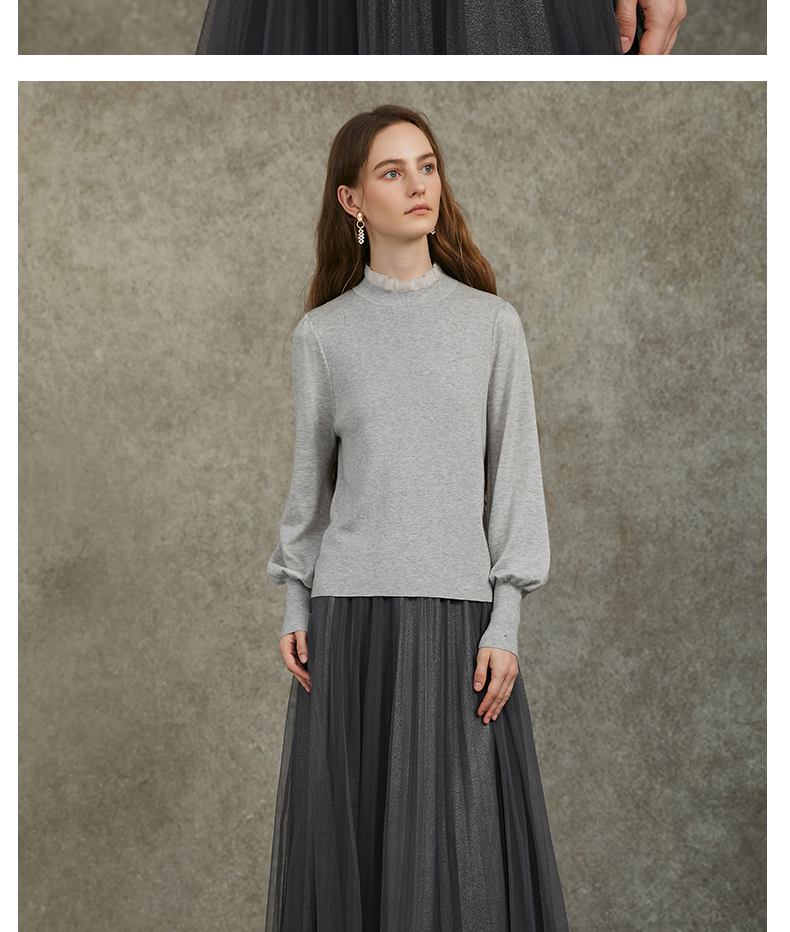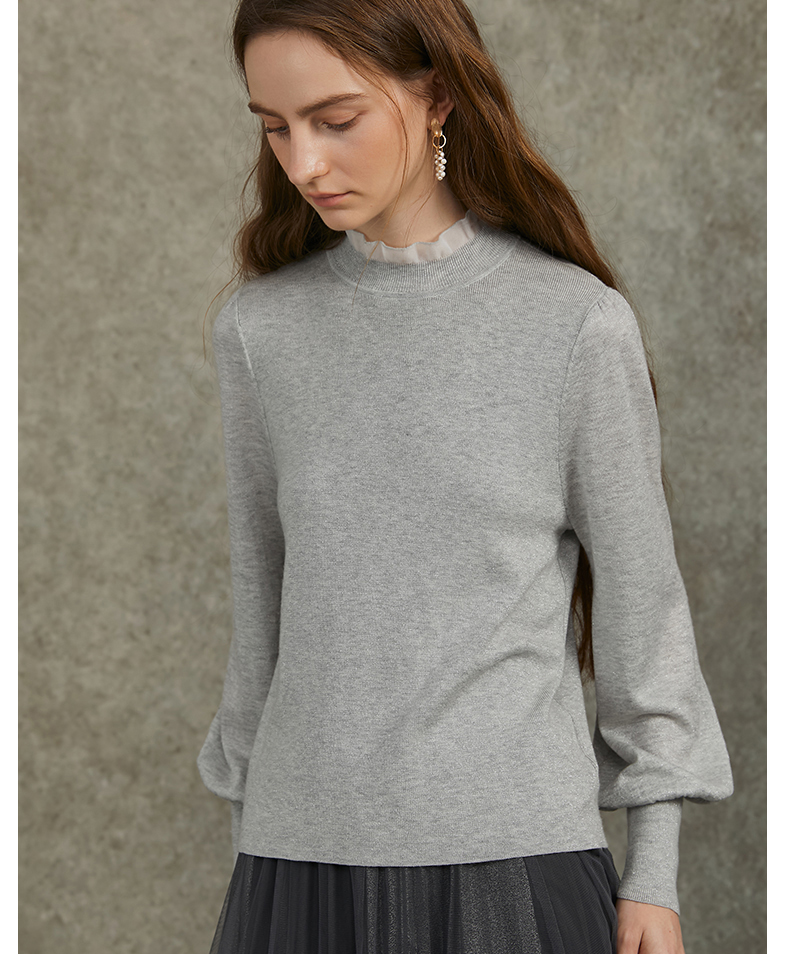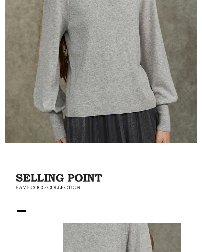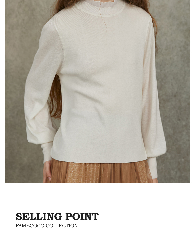 Famecoco范可儿泡泡袖羊毛针织衫欧根纱拼接圆领毛衫FAC6DC003