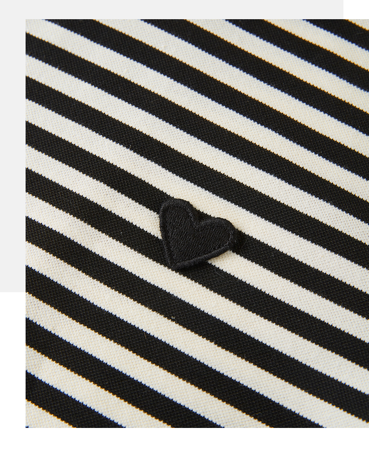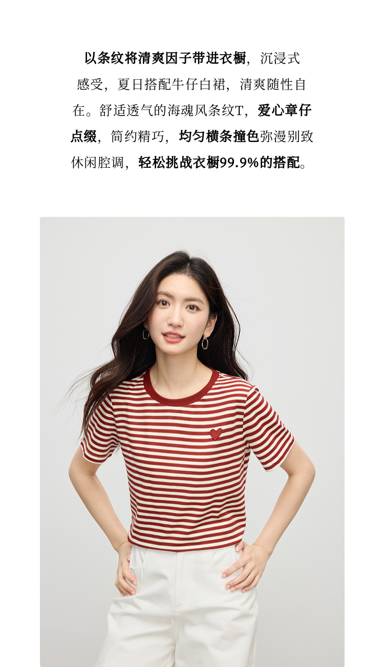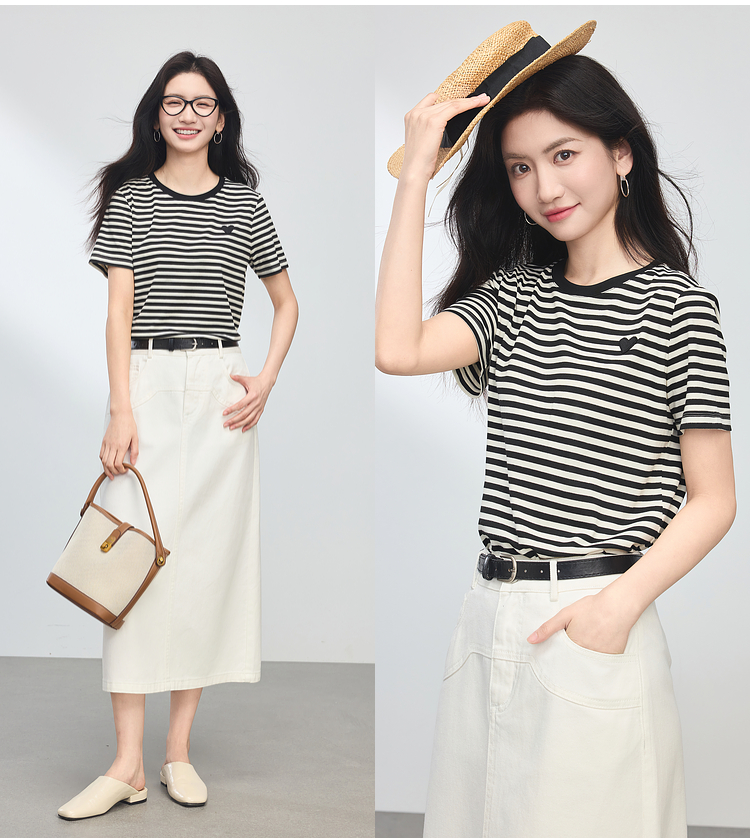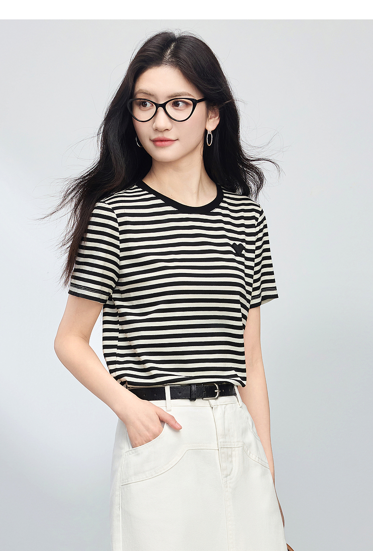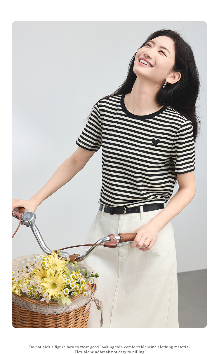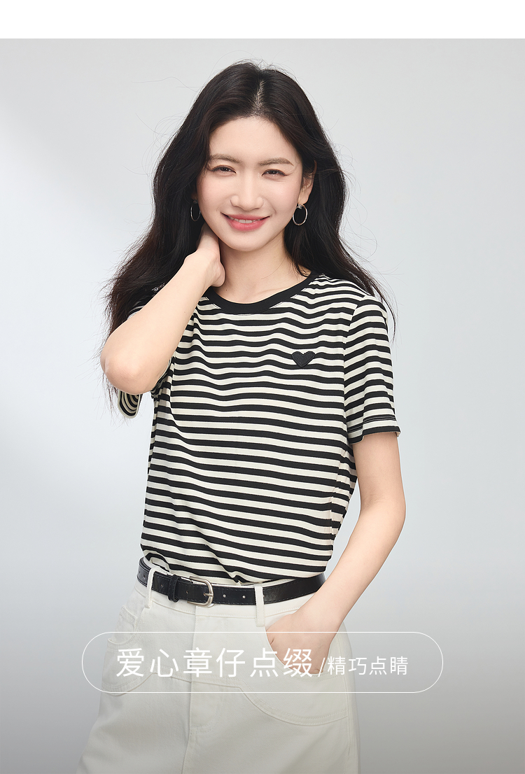 【周四狂欢价】熙世界黑白条纹t恤女短袖2025夏季新款休闲爱心刺绣圆领正肩上衣