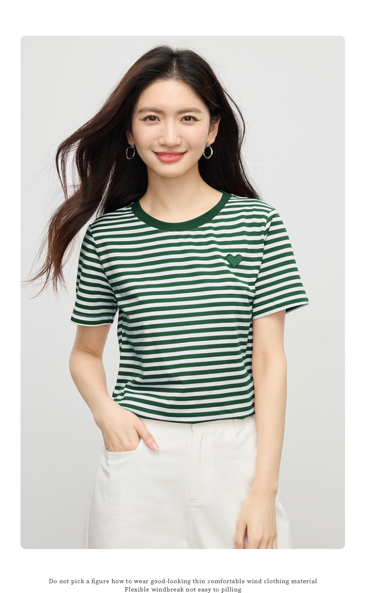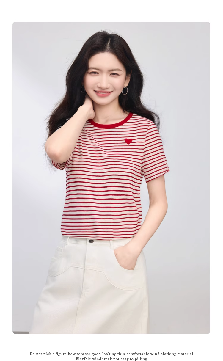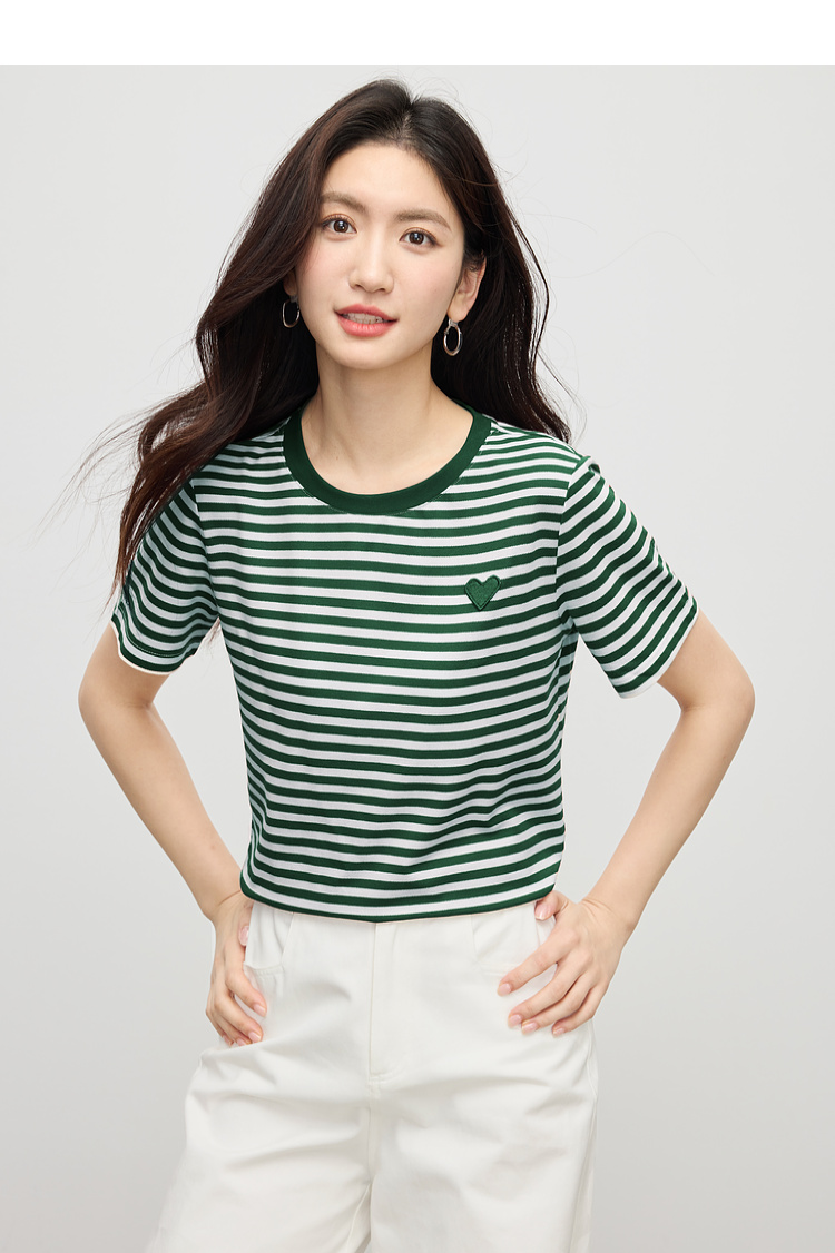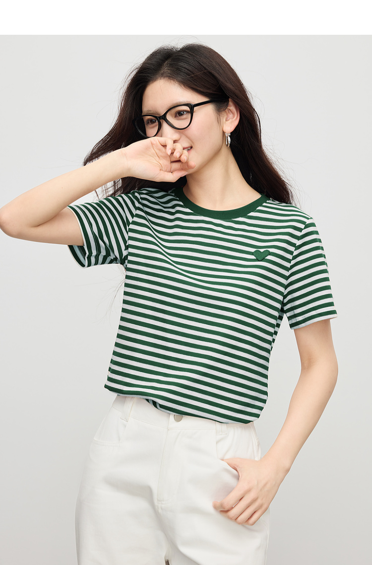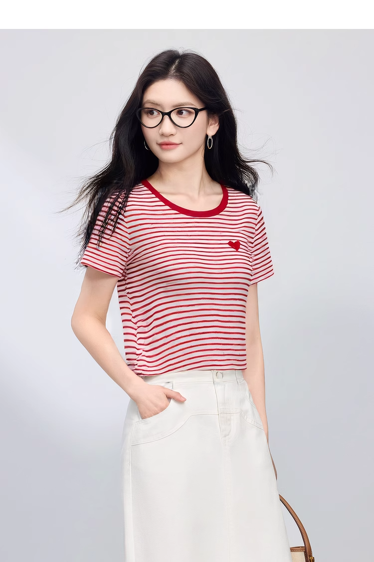 【周四狂欢价】熙世界黑白条纹t恤女短袖2025夏季新款休闲爱心刺绣圆领正肩上衣
