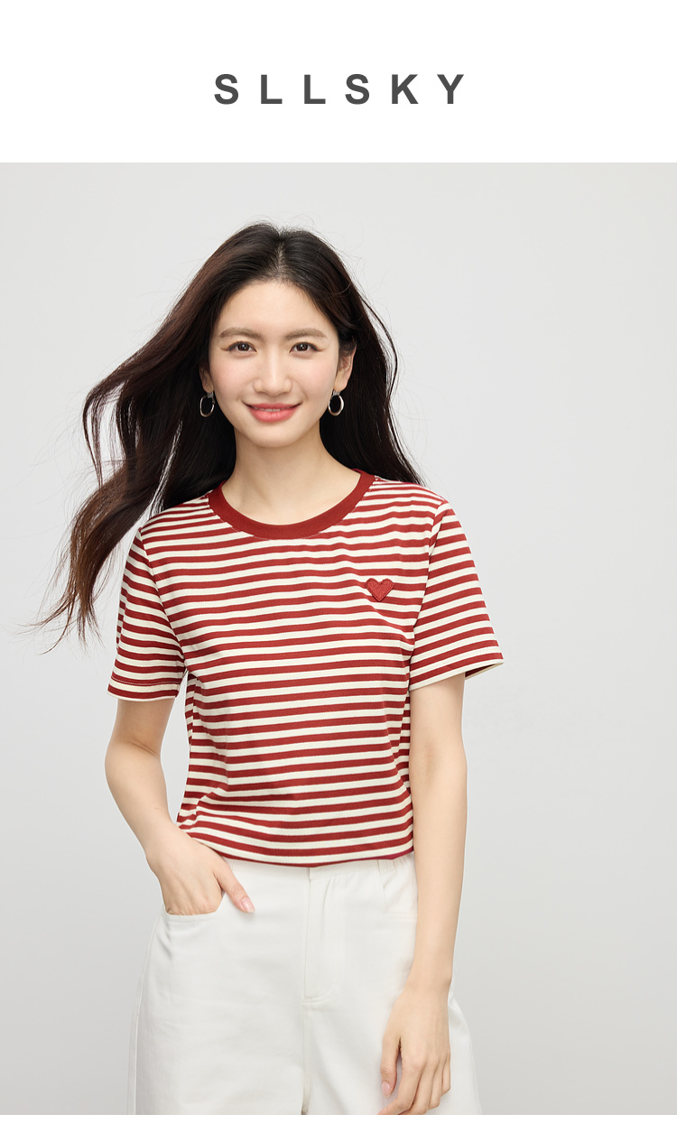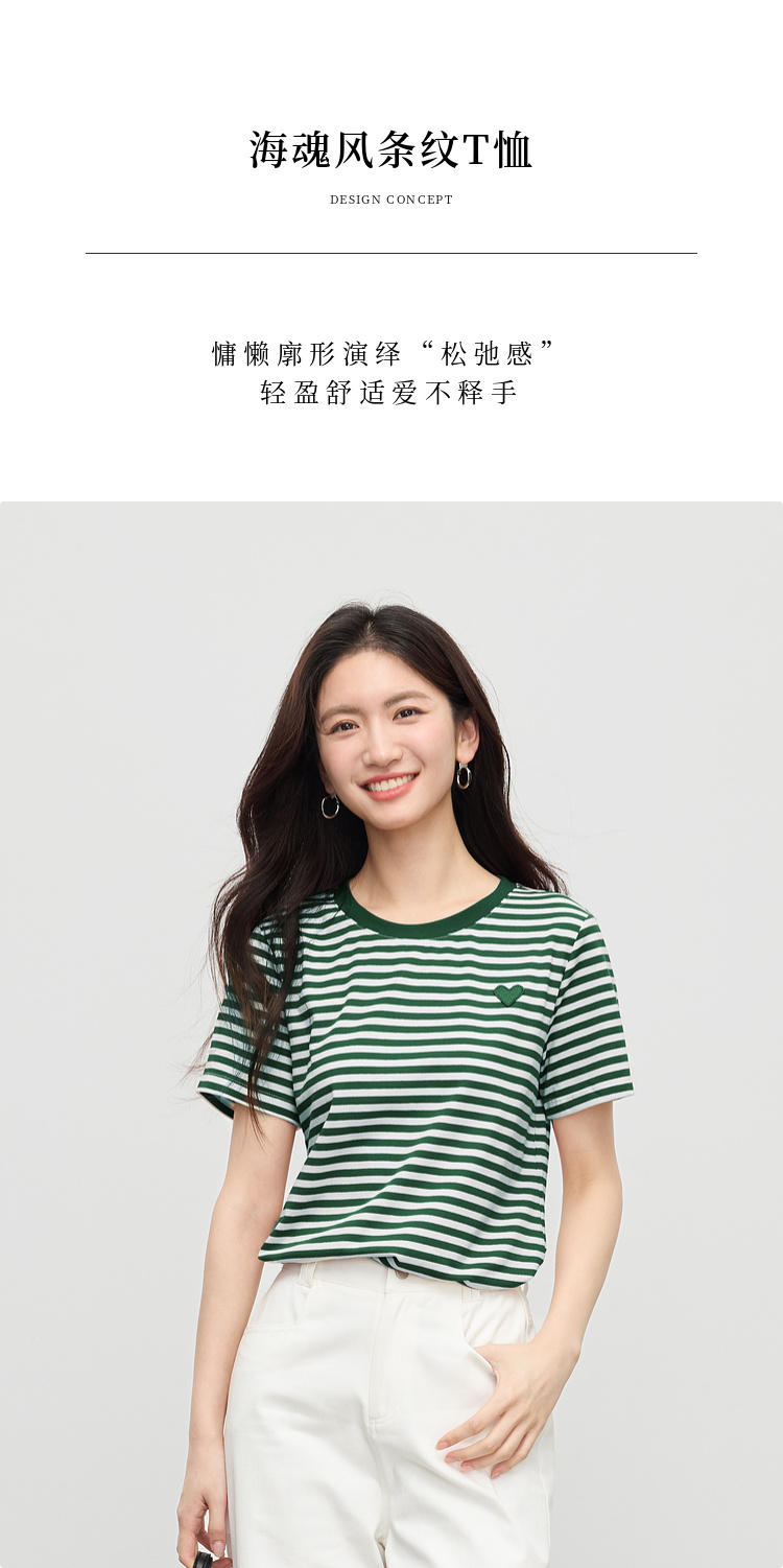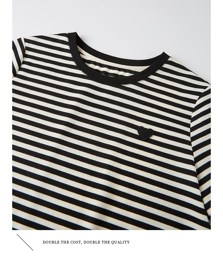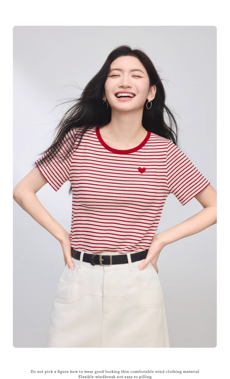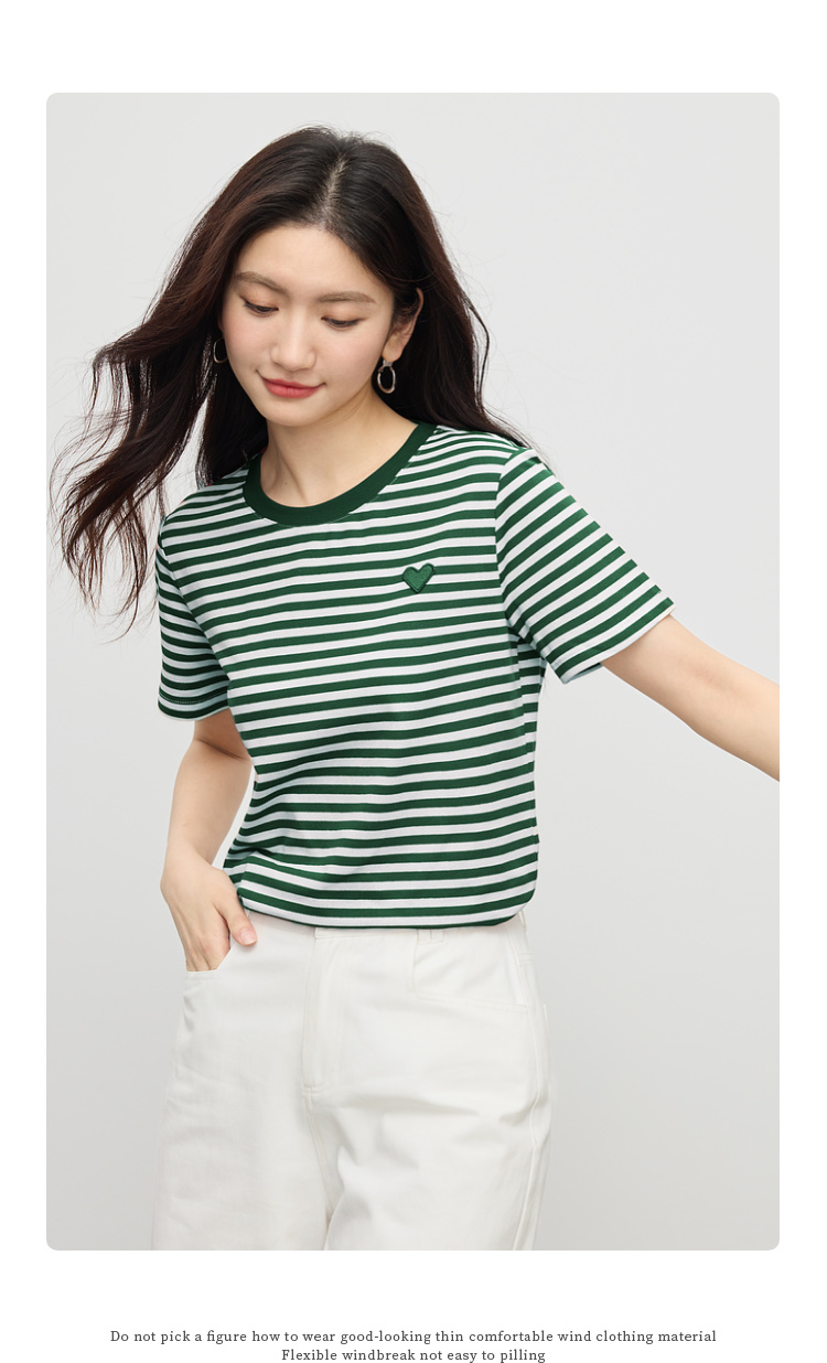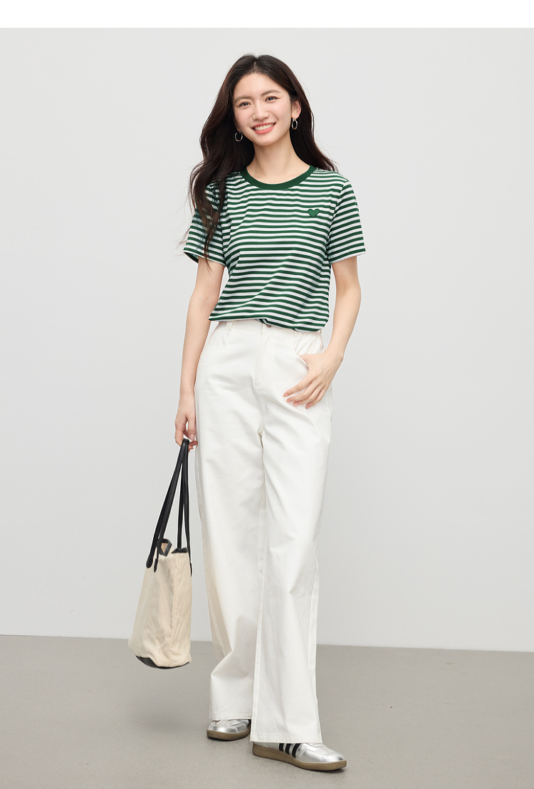 【周四狂欢价】熙世界黑白条纹t恤女短袖2025夏季新款休闲爱心刺绣圆领正肩上衣