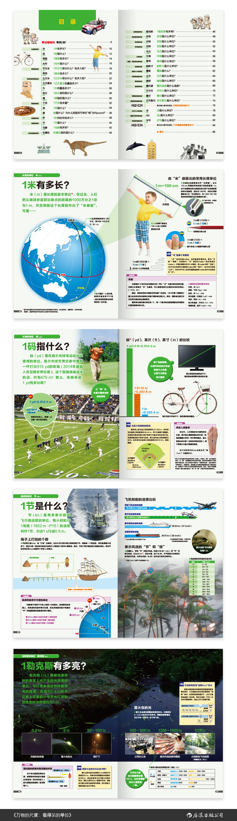 1厘米有多长——成人中指指甲盖的宽度;1千克有多重——4个苹果或者165个一元硬币的重量;1勒克斯有多亮——1只萤火虫发光的亮度;1摩尔有多少——能组成30座富士山的沙粒的数量……用大量照片和图画来解释,让抽象的单位与实物产生联系,一下子就有了具体的感受,数理化课程中的抽象数据不再遥远。