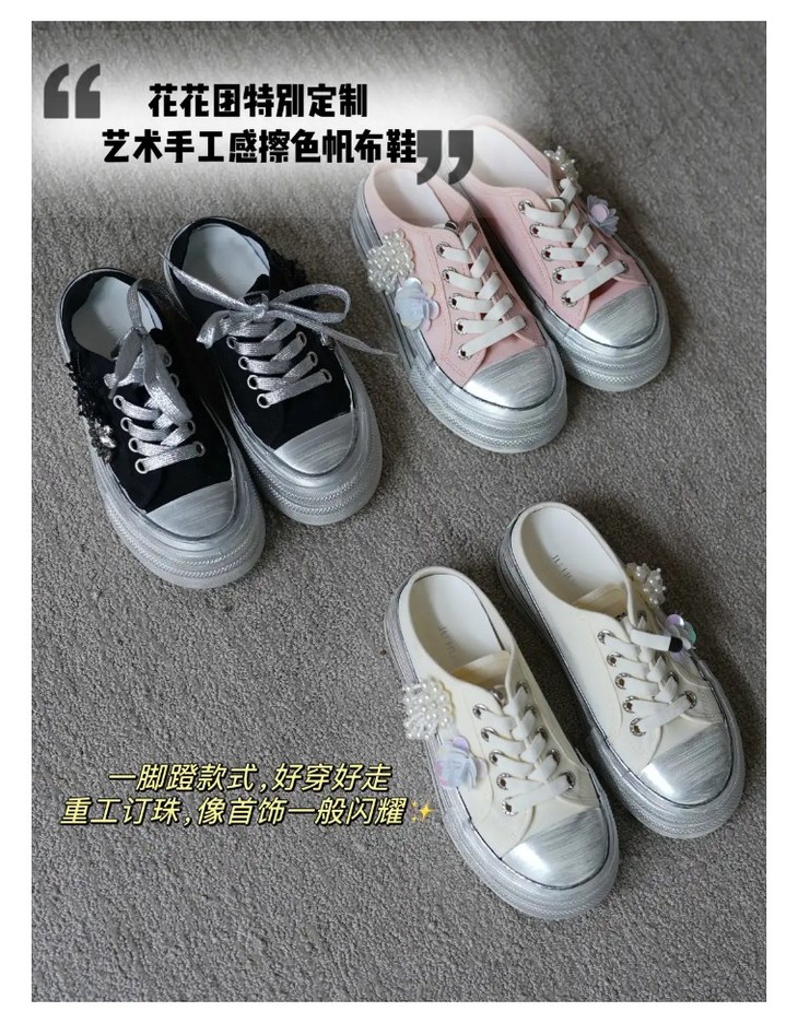 花花团特别定制——艺术手工感擦色一脚蹬帆布拖鞋 重工钉珠工艺精致美观 优雅特别、俏皮灵动 里垫牛皮、柔软加厚脚垫 懒人必备 好穿好走 三色可选、经典穿搭好物