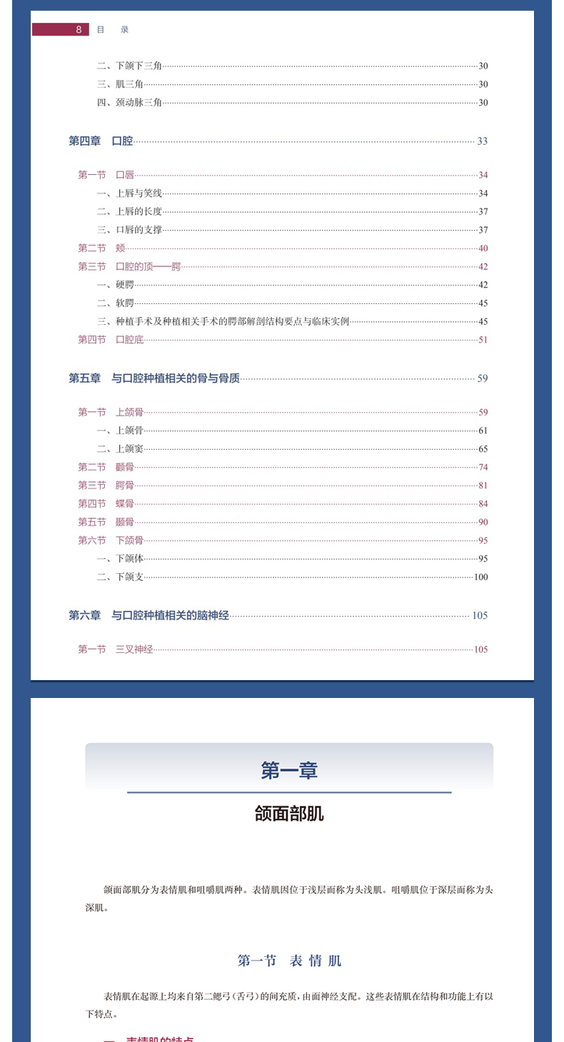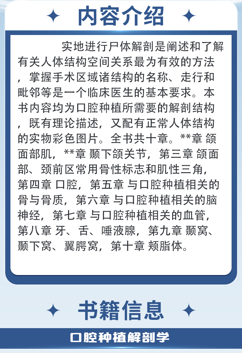 实地进行尸体解剖是阐述和了解有关人体结构空间关系最为有效的方法,掌握手术区域诸结构的名称、走行和毗邻等是一个临床医生的基本要求。本书内容均为口腔种植所需要的解剖结构,既有理论描述,又配有正常人体结构的实物彩色图片。全书共十章。**章 颌面部肌,**章 颞下颌关节,第三章 颌面部、颈前区常用骨性标志和肌性三角,第四章 口腔,第五章 与口腔种植相关的骨与骨质,第六章 与口腔种植相关的脑神经,第七章 与口腔种植相关的血管,第八章 牙、舌、唾液腺,第九章 颞窝、颞下窝、翼腭窝,第十章 颊脂体。
