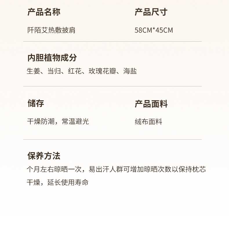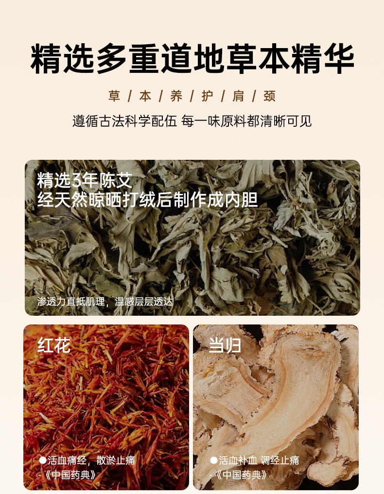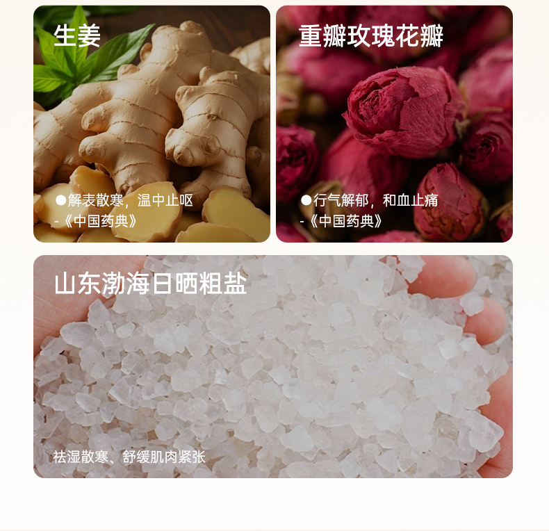 内部填充更是诚意满满,精心搭配生姜、当归、红花、玫瑰与海盐,多种草本成分协同作用,生姜暖身驱寒、当归活血养血、红花通络散瘀、玫瑰舒缓身心,再辅以海盐的温润滋养,为肩颈带来多重呵护。