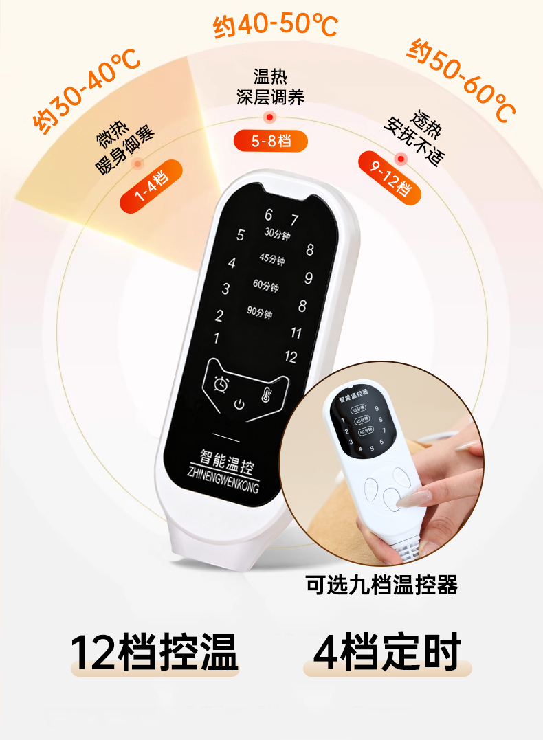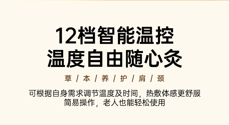 披肩配备 12 档智能温控系统,温度调节范围广泛,从温和暖身到深层热疗,你可根据自身感受与需求,自由选择适宜的温度档位,同时还能灵活调节热敷时间,精准掌控热敷过程。