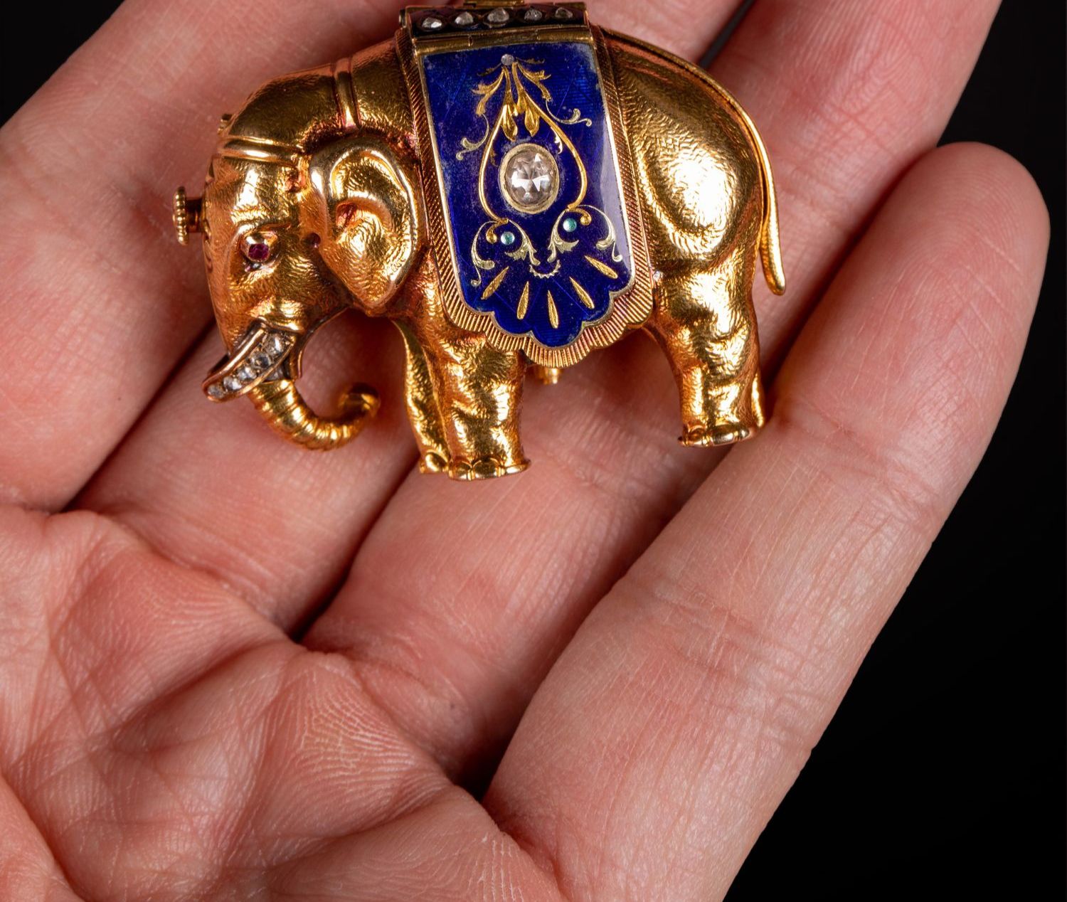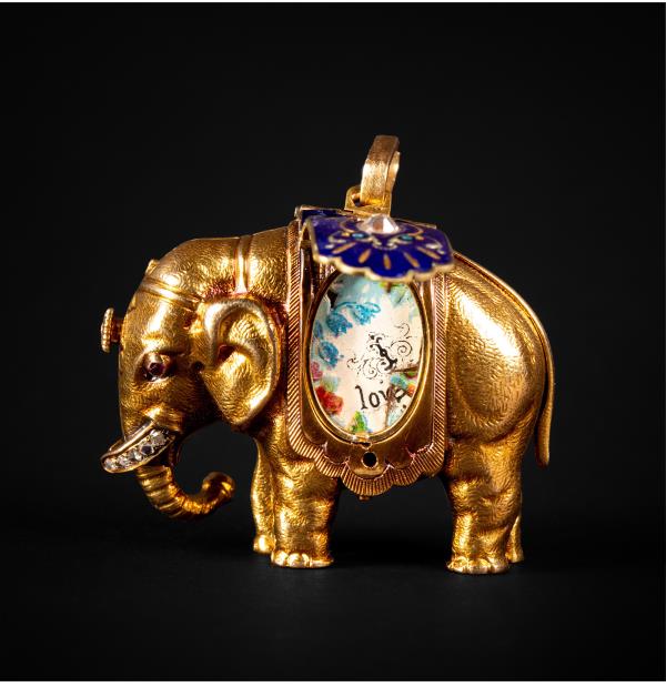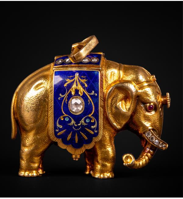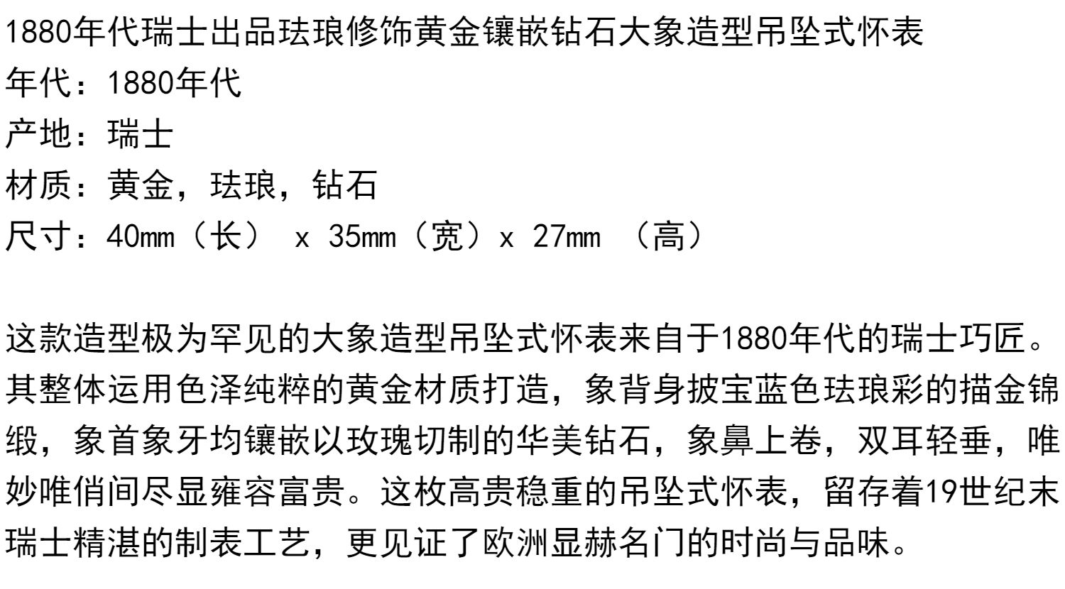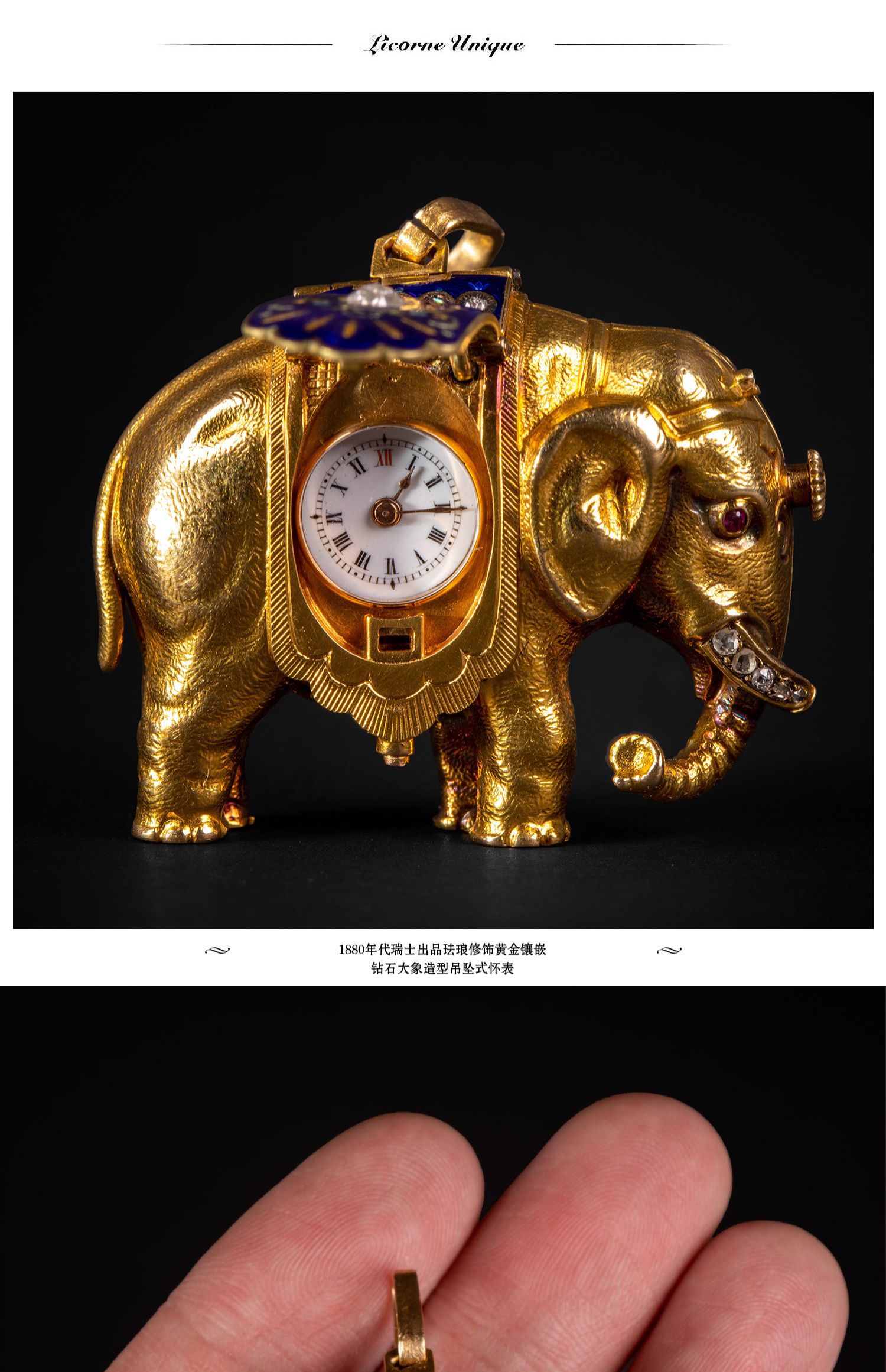独角鹿西洋古董钟表瑞士珐琅饰黄金镶嵌钻石大象造型吊坠式怀表
