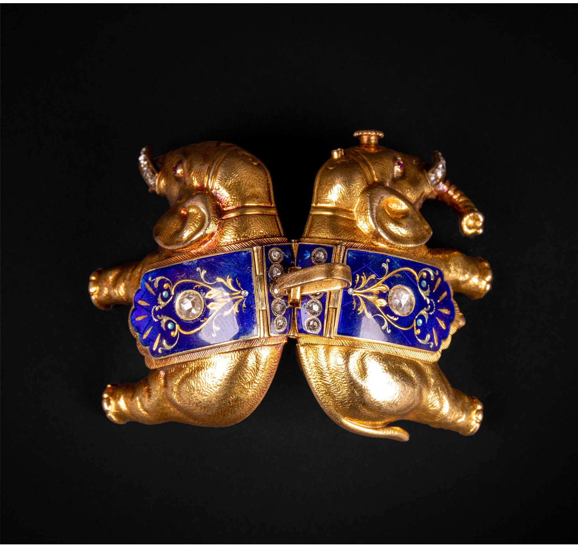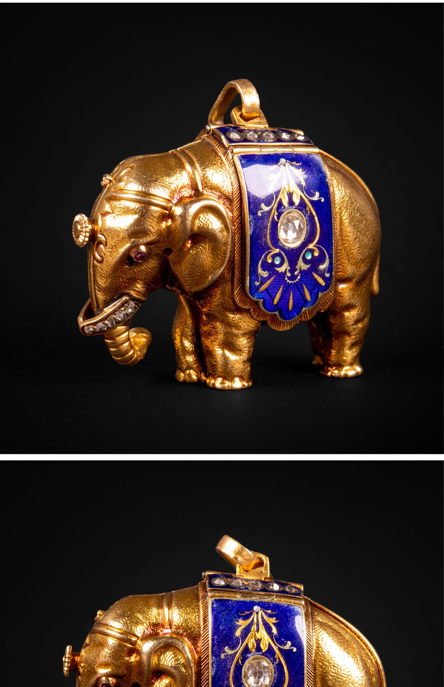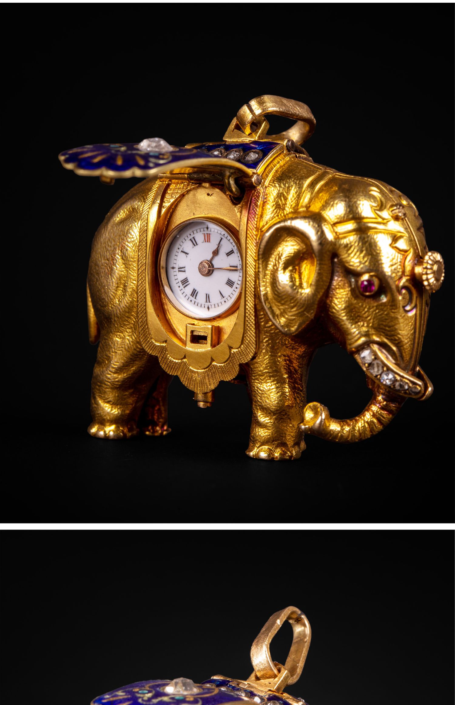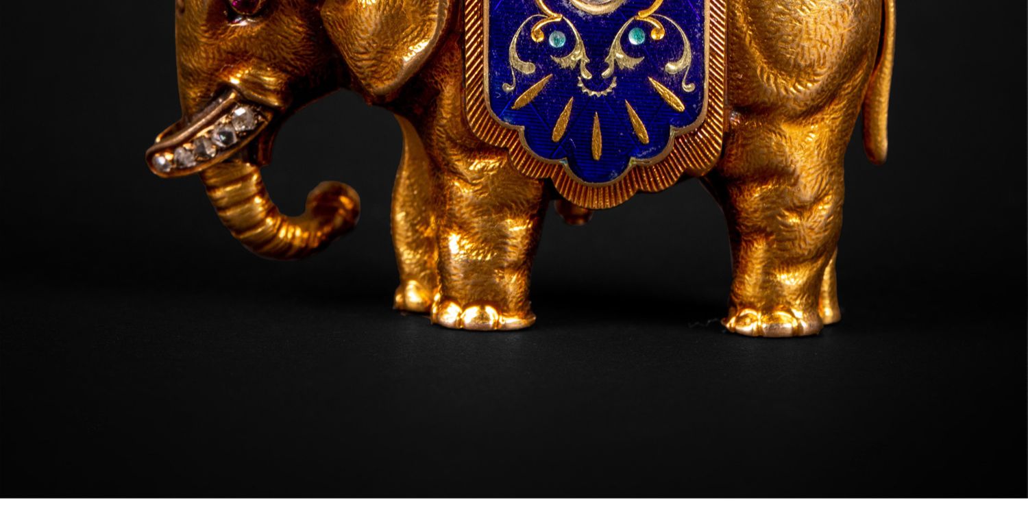独角鹿西洋古董钟表瑞士珐琅饰黄金镶嵌钻石大象造型吊坠式怀表