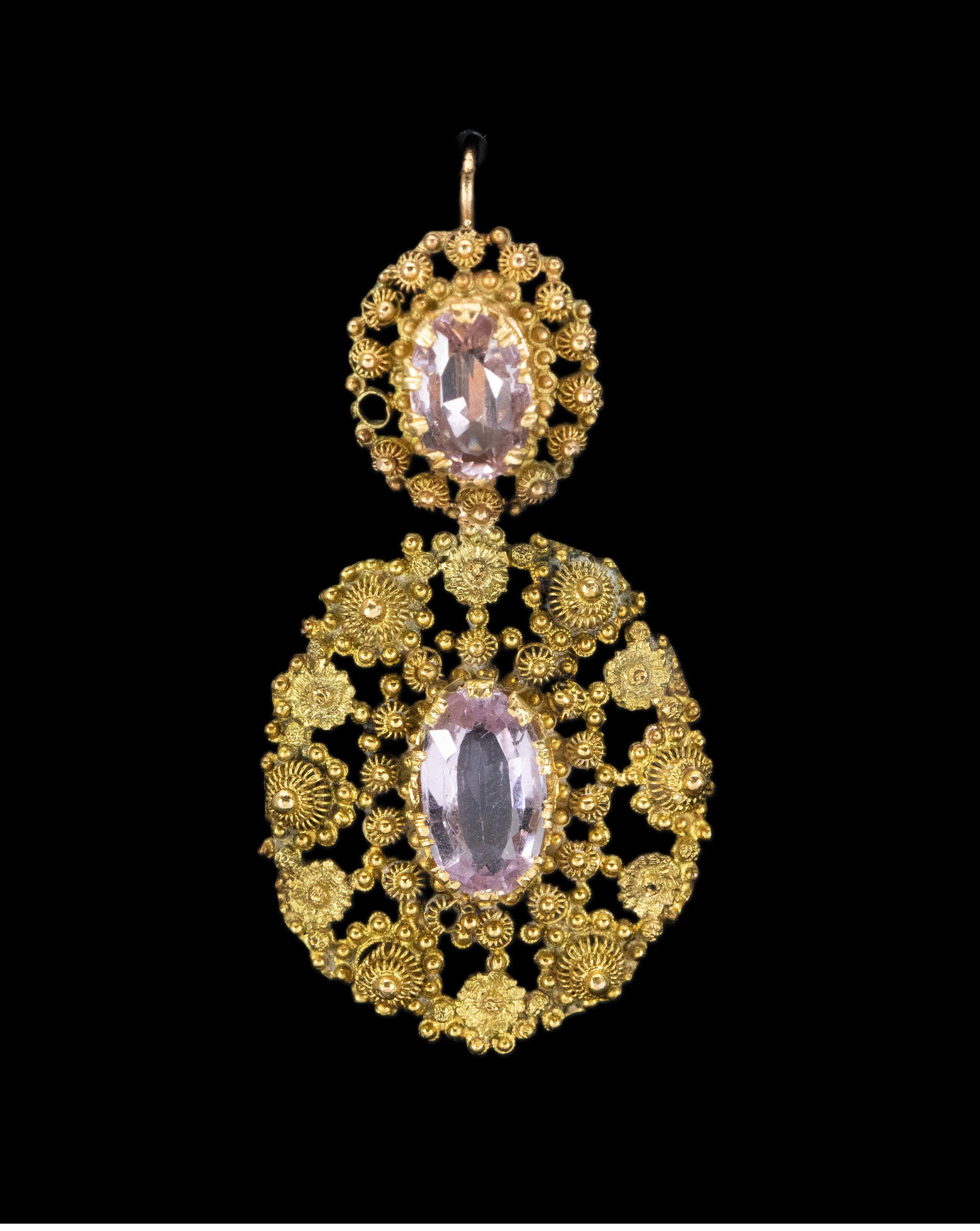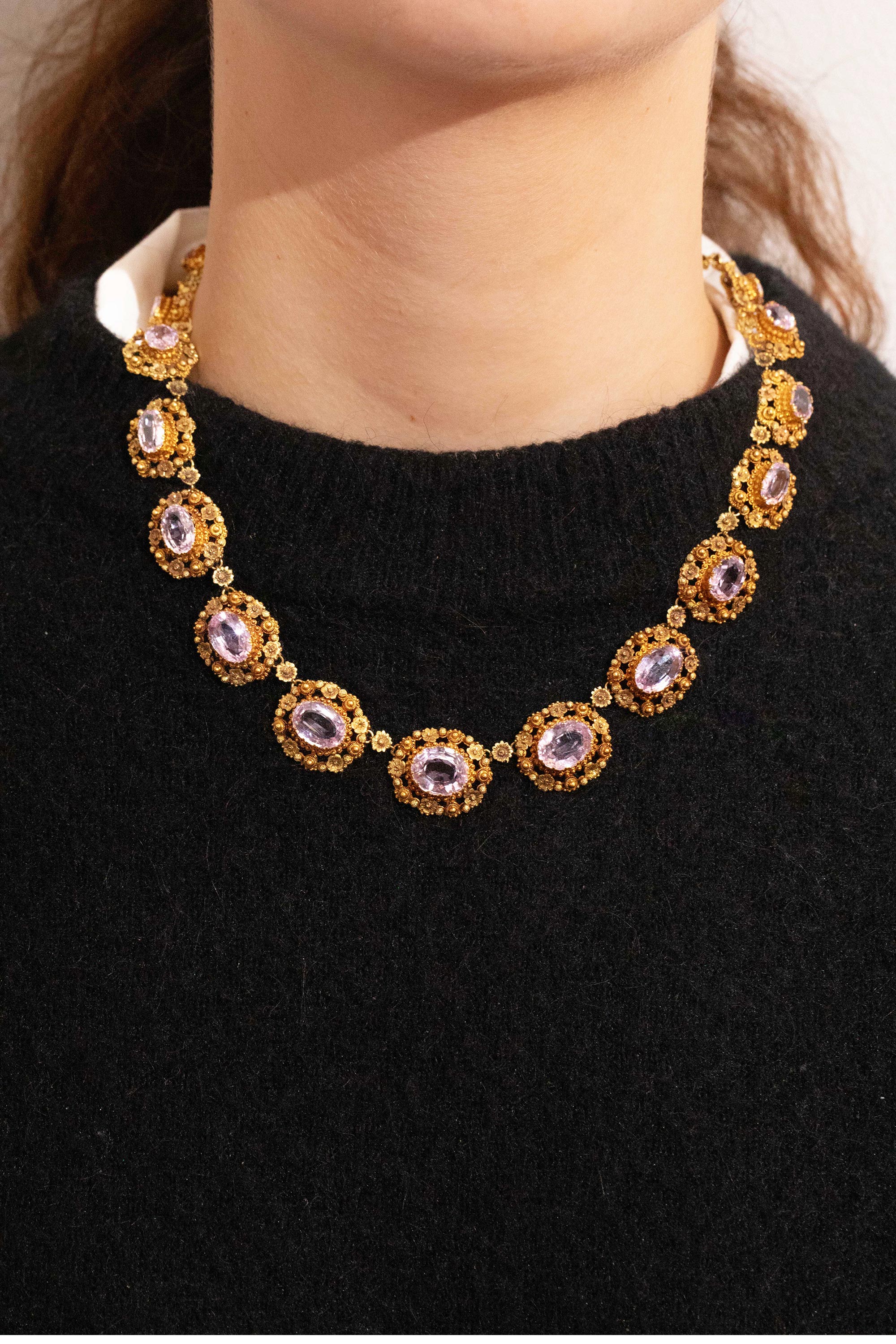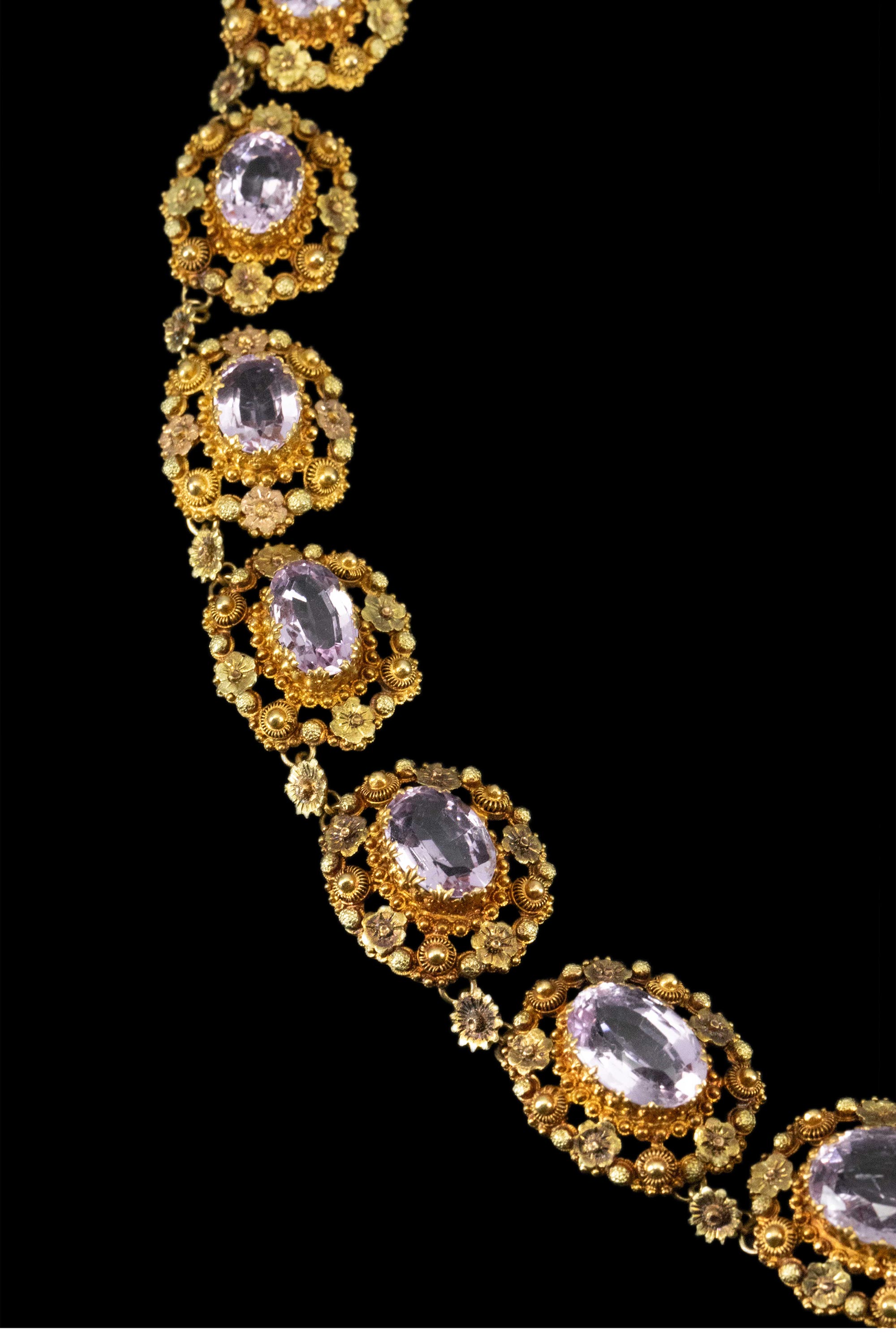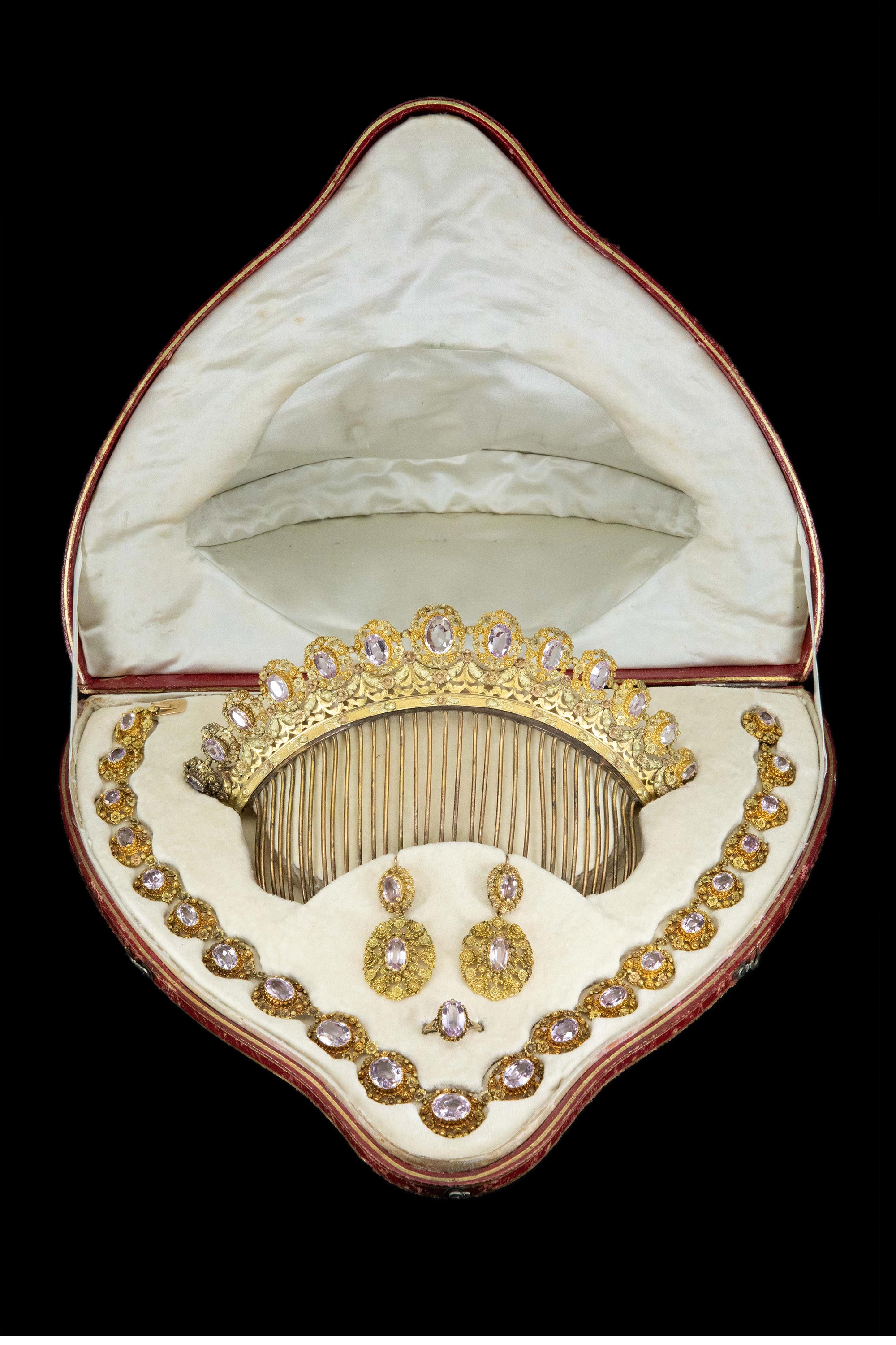 1820年代欧洲出品花卉造型黄金精雕镶嵌粉色托帕石珠宝套件 带原盒