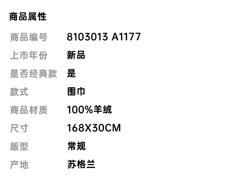 【一】BURBERRY 巴宝莉 男女同款格纹羊绒围巾 格子 8103013 A1177