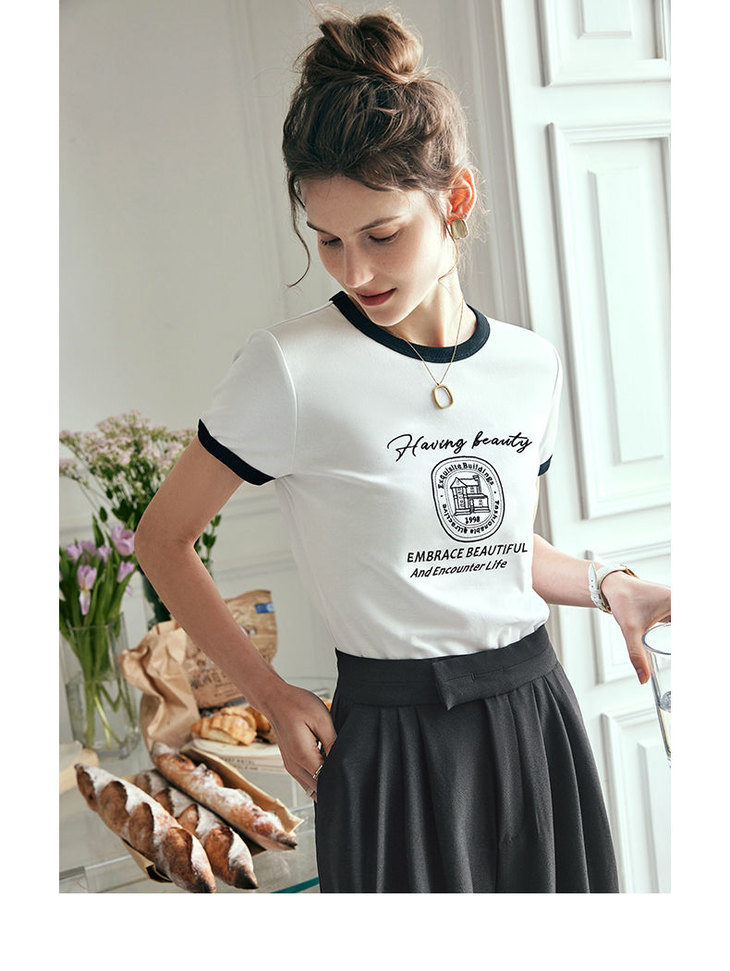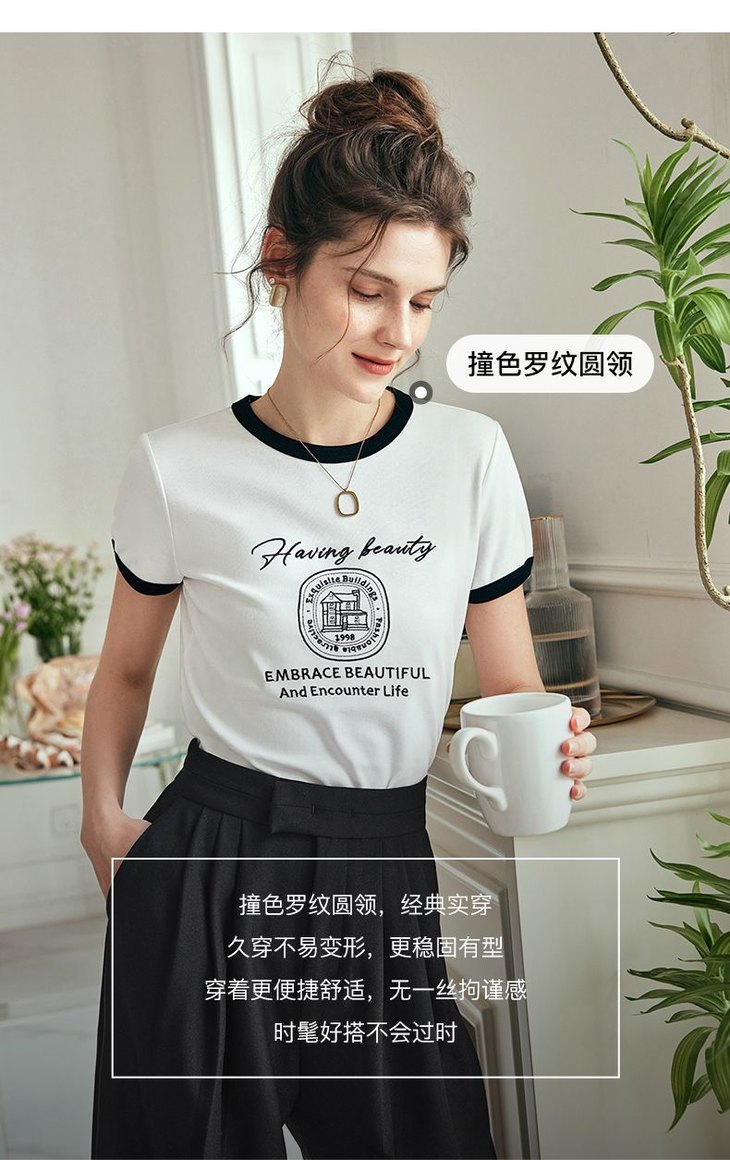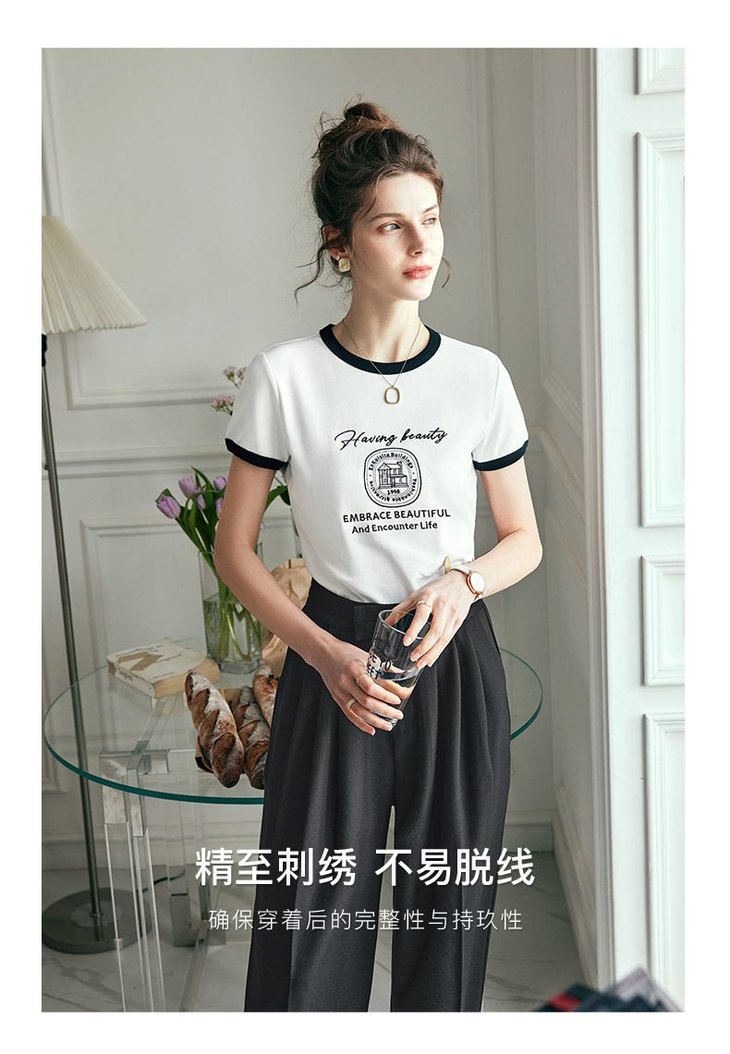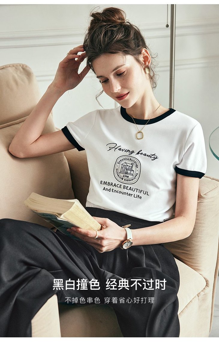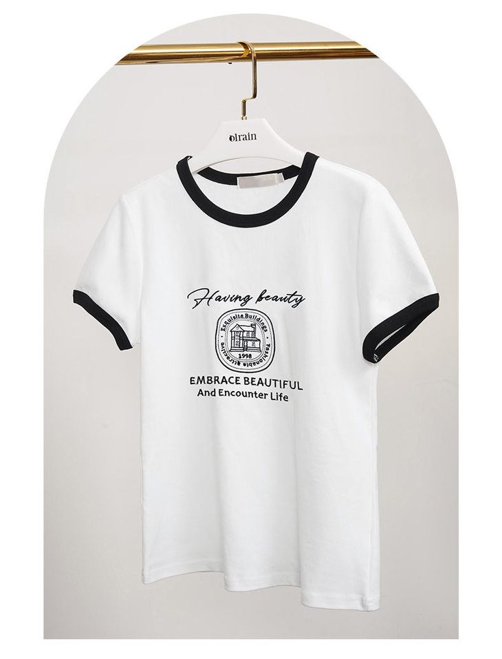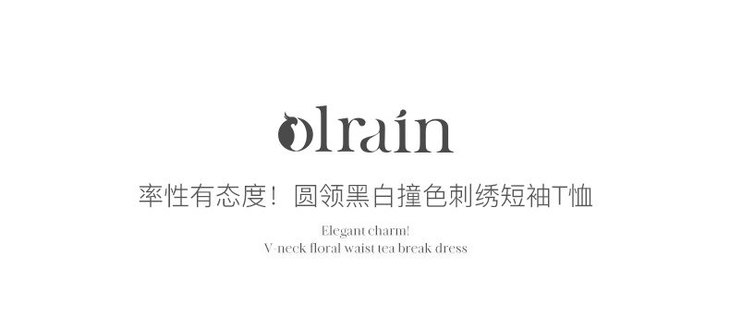 OLrain欧芮儿法式短袖T恤女夏季2023年新款黑白撞色刺绣别致上衣