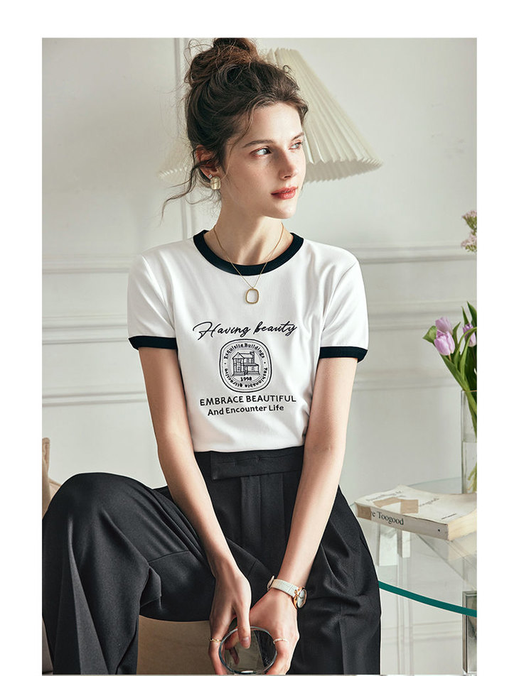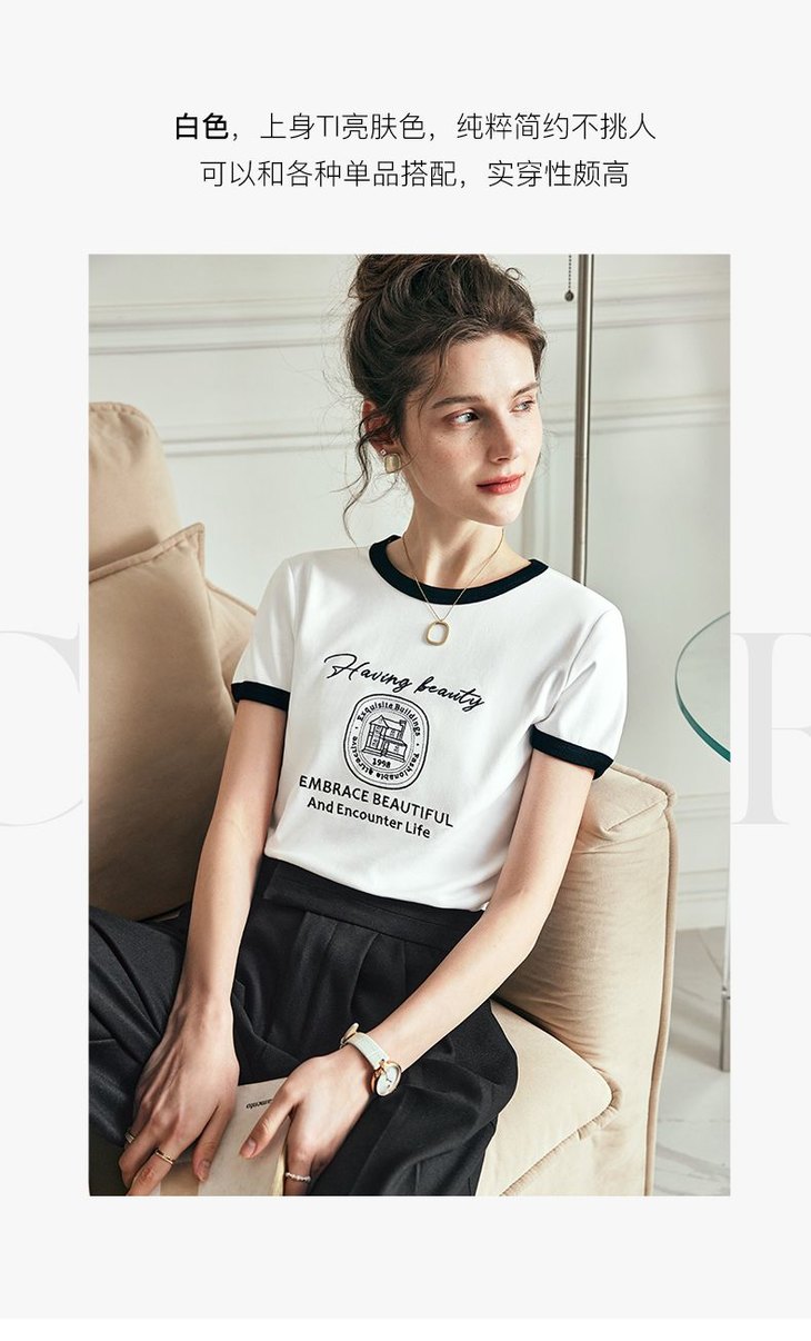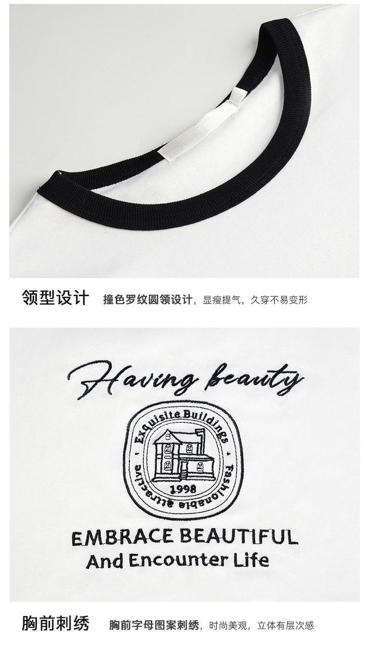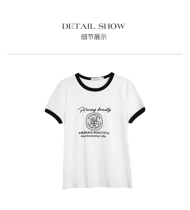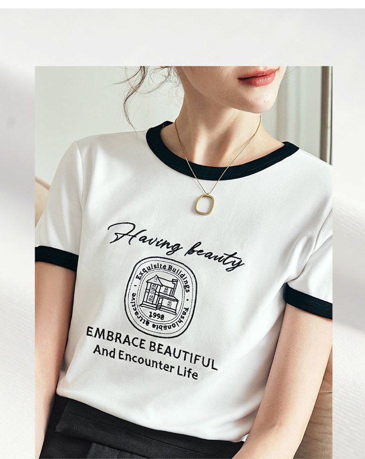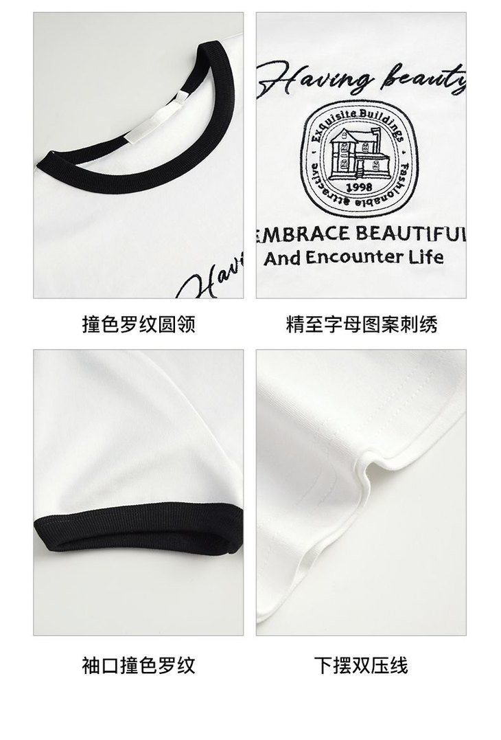 OLrain欧芮儿法式短袖T恤女夏季2023年新款黑白撞色刺绣别致上衣