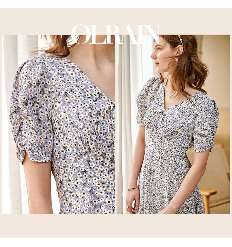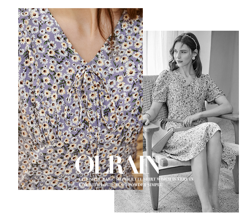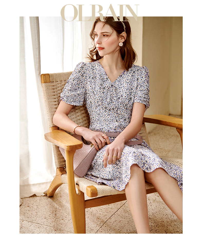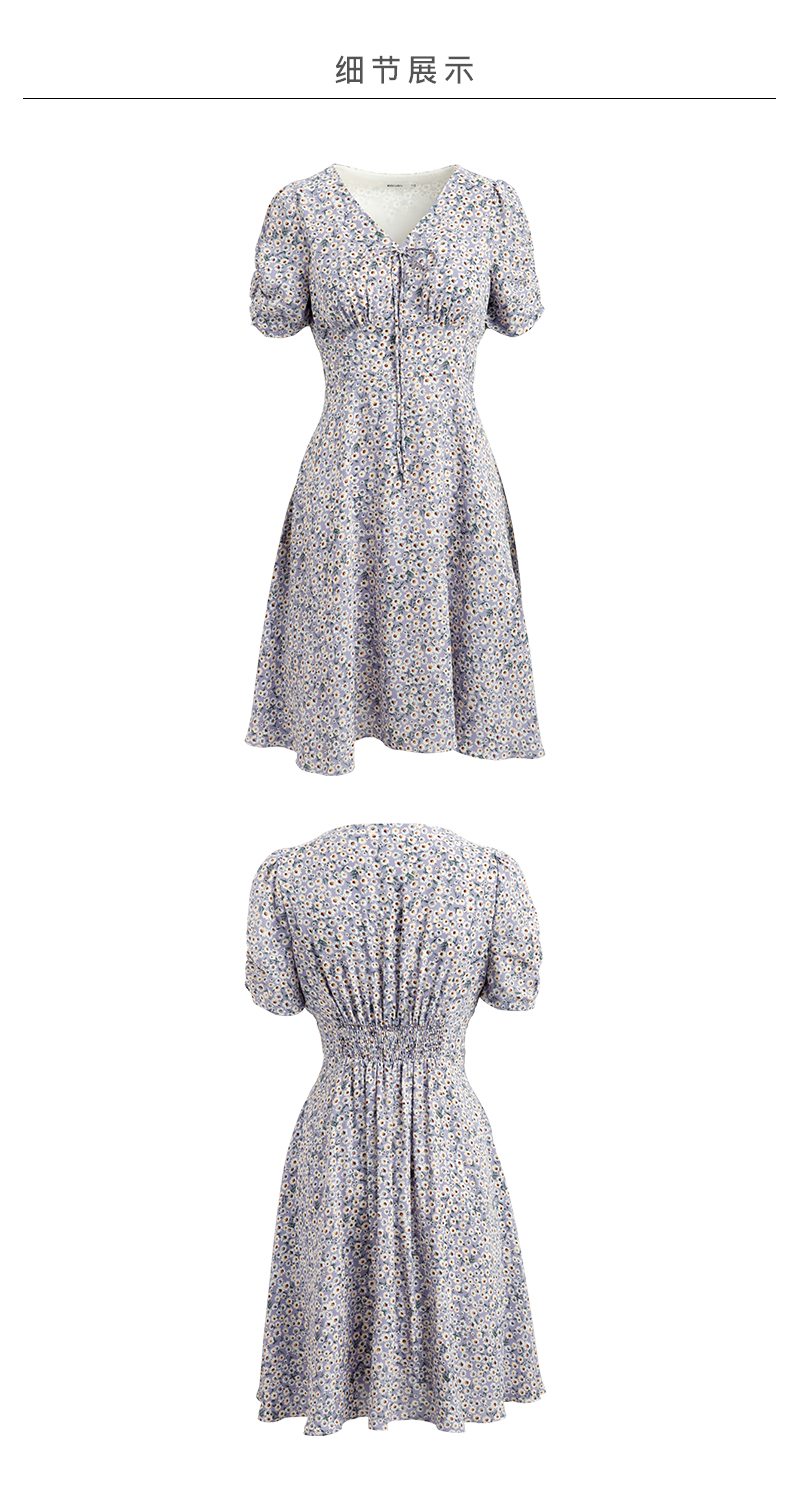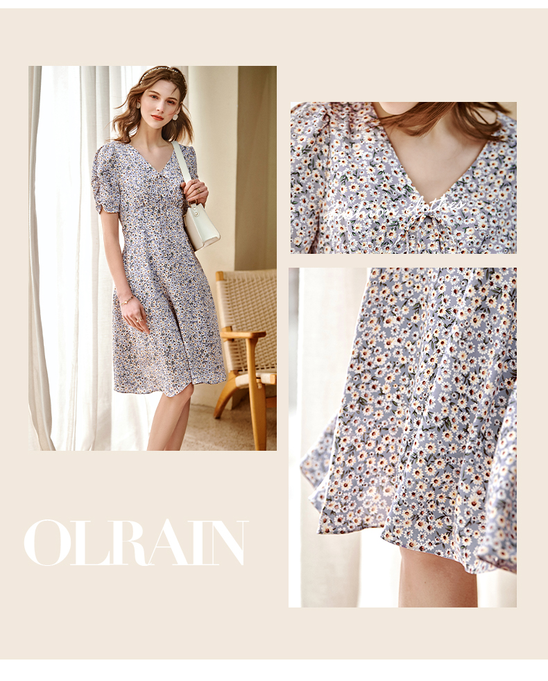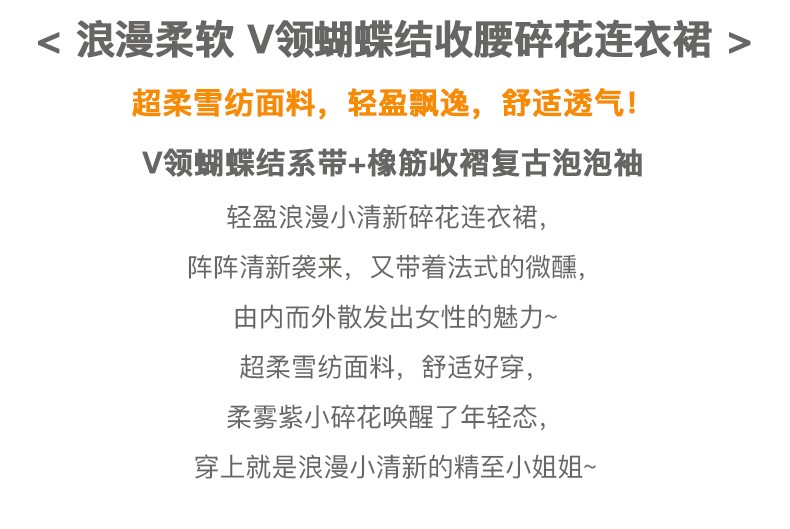 欧芮儿碎花雪纺连衣裙2021春夏收腰显瘦蝴蝶结复古收褶小清新裙子