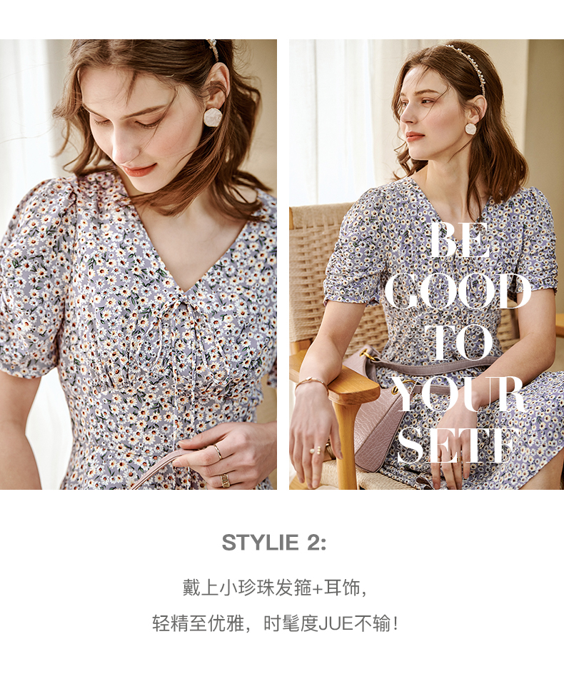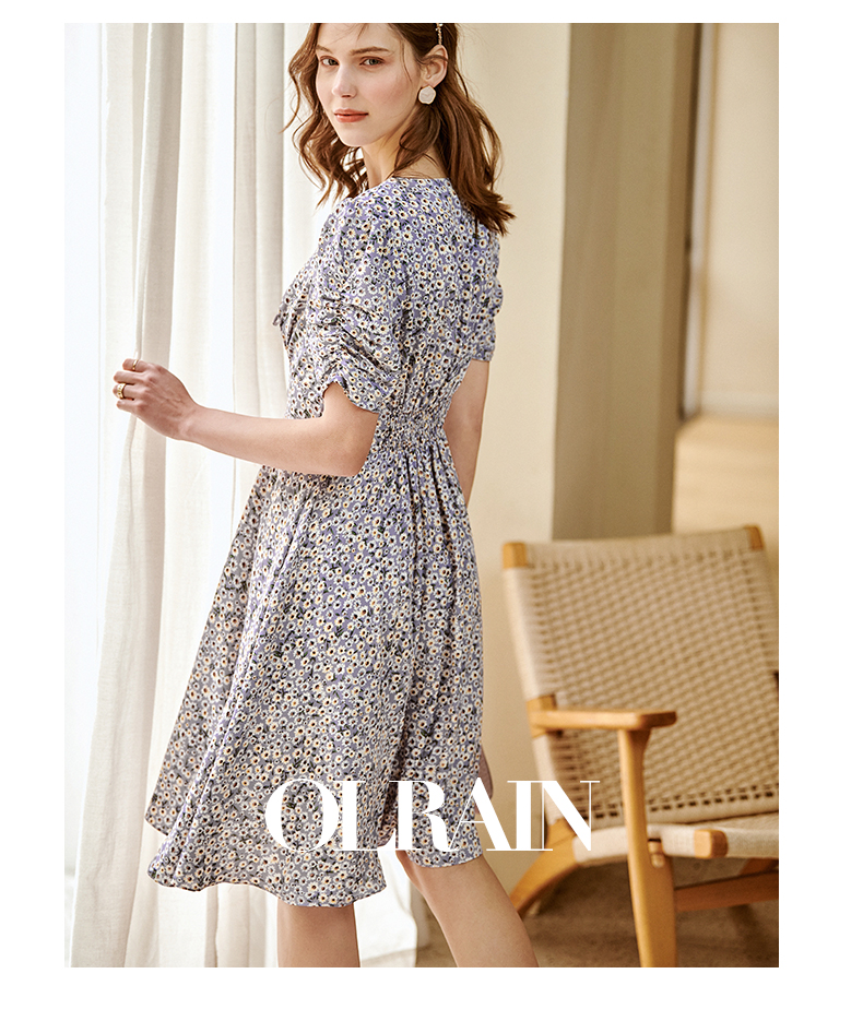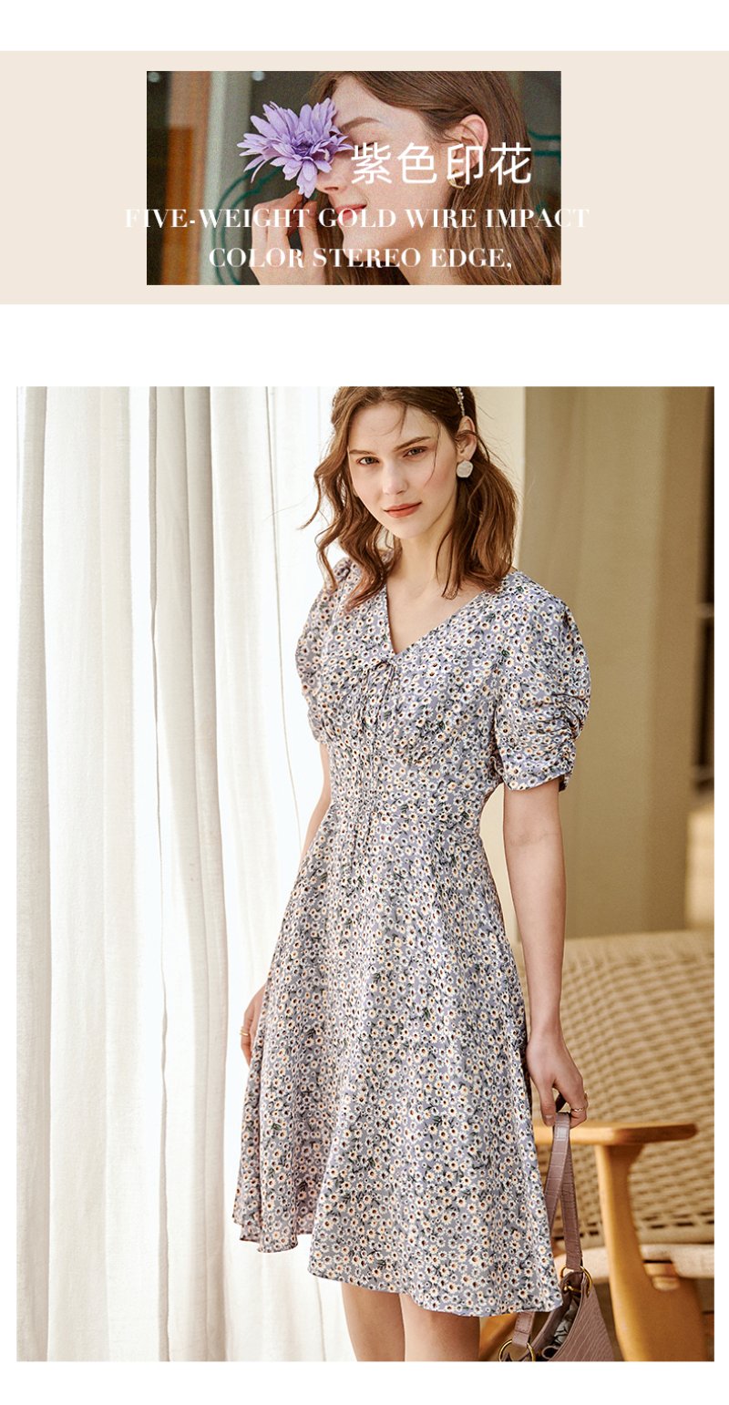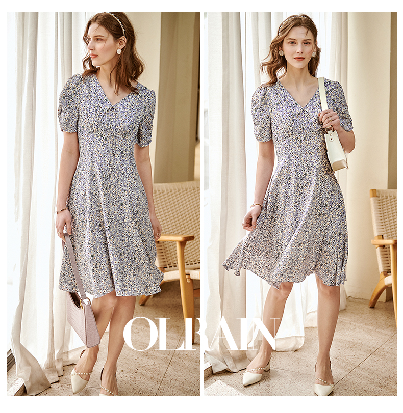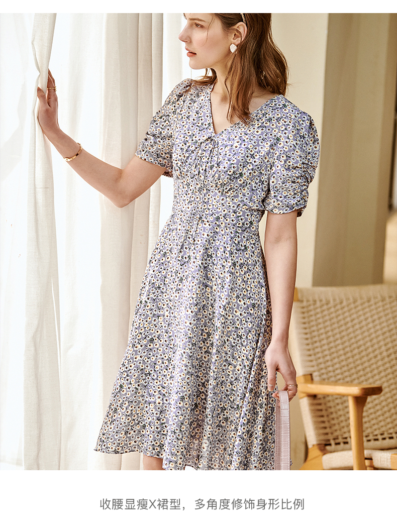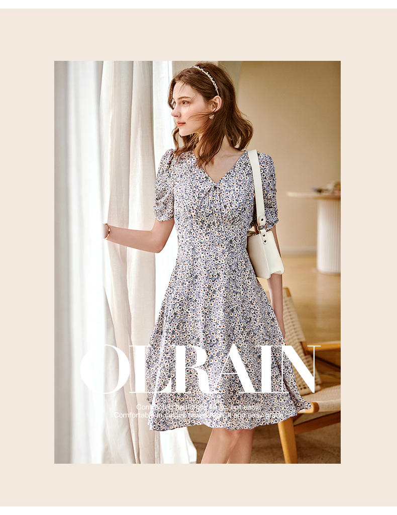 欧芮儿碎花雪纺连衣裙2021春夏收腰显瘦蝴蝶结复古收褶小清新裙子