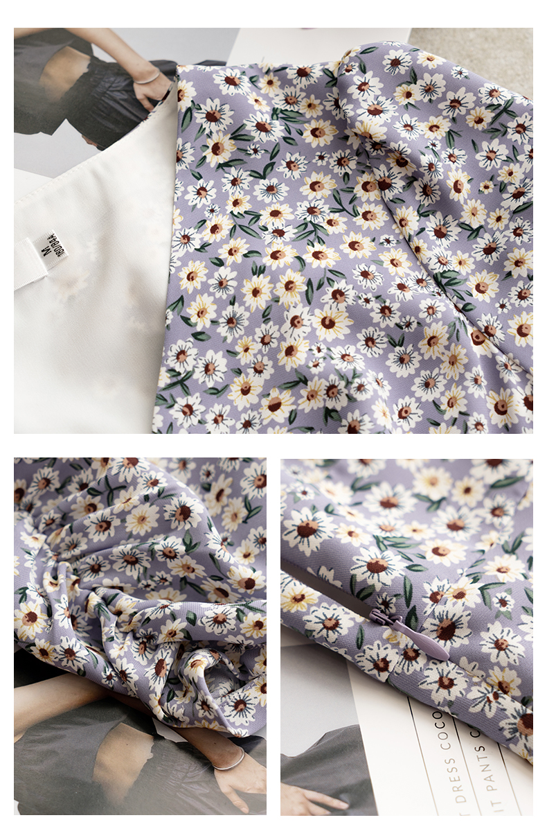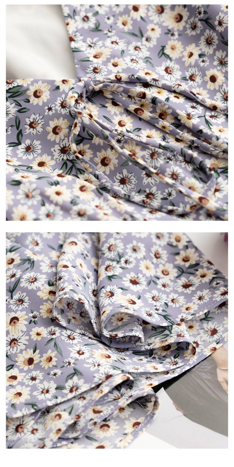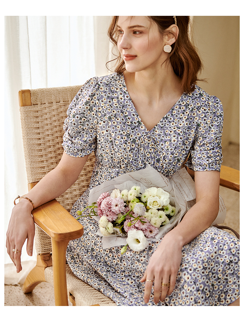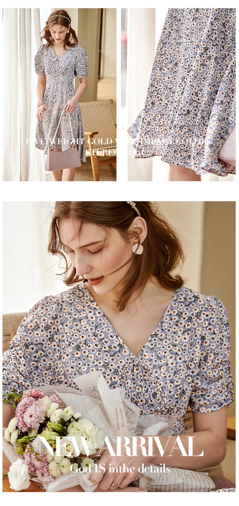 欧芮儿碎花雪纺连衣裙2021春夏收腰显瘦蝴蝶结复古收褶小清新裙子