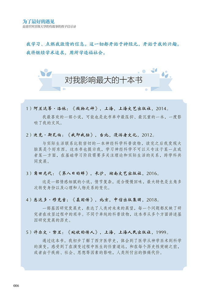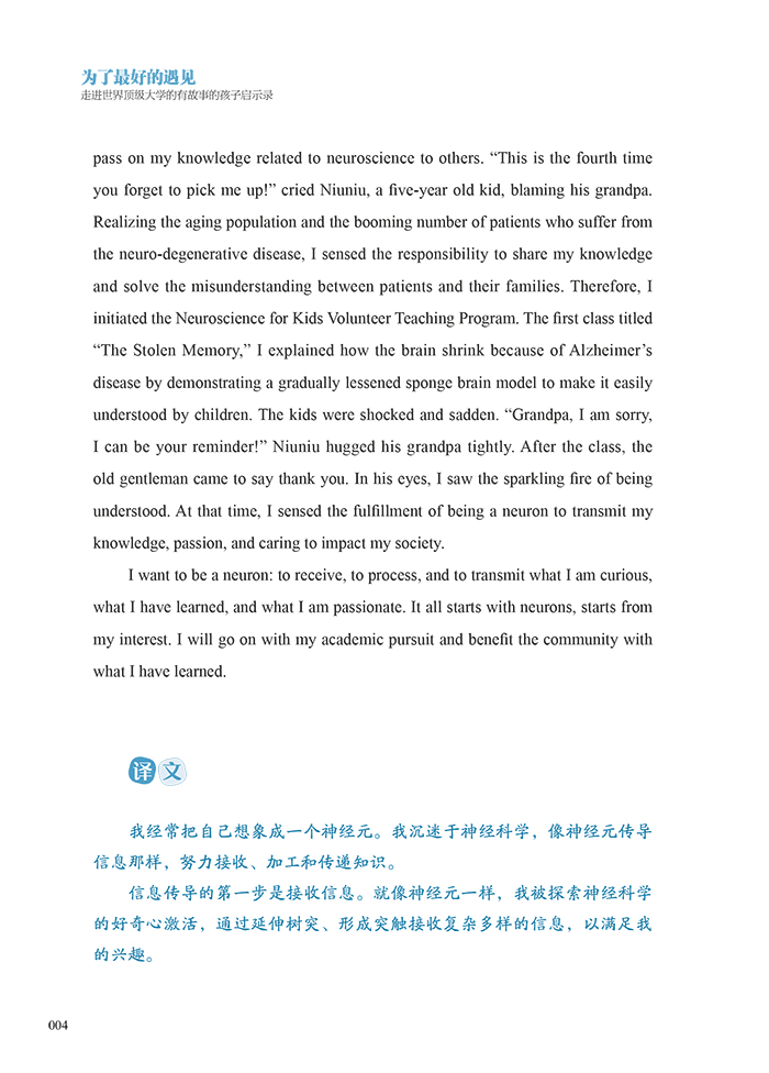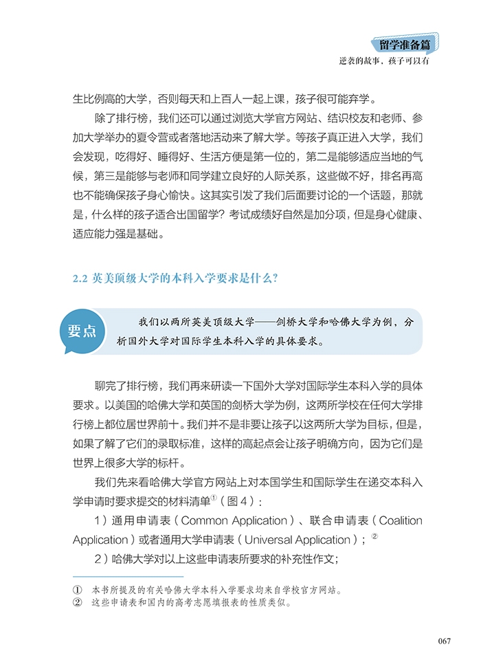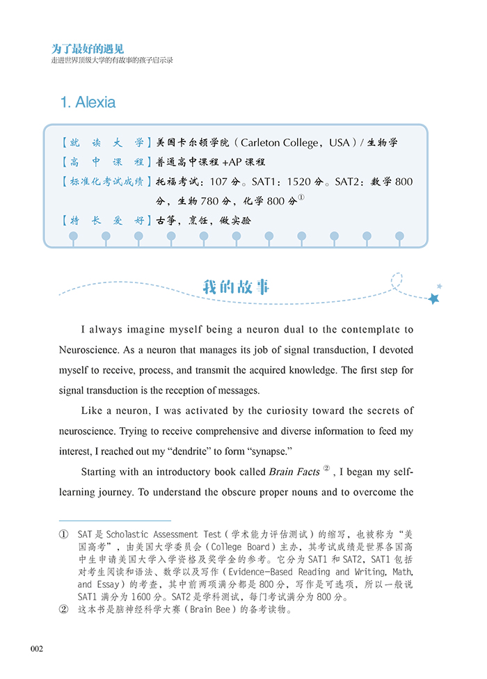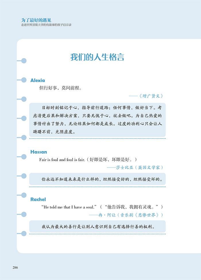 在《为了*好的遇见——走进世界*大学的有故事的孩子启示录》这本书中,我们将与八个孩子相遇,他们有着共同点:在国内完成了高中学业,选择出国读大学,进入了世界*大学,具有接近母语的英语水平。他们也有着不同点:高中课程不同,留学国家不同,专业不同……这些共同点和不同点都源于他们既有共性又充满个性的成长经历,从决定出国留学,到选择高中课程、提升英语素养、在课外活动中出彩、在大学申请中历练,有故事的他们*终走进了自己梦想中的大学。