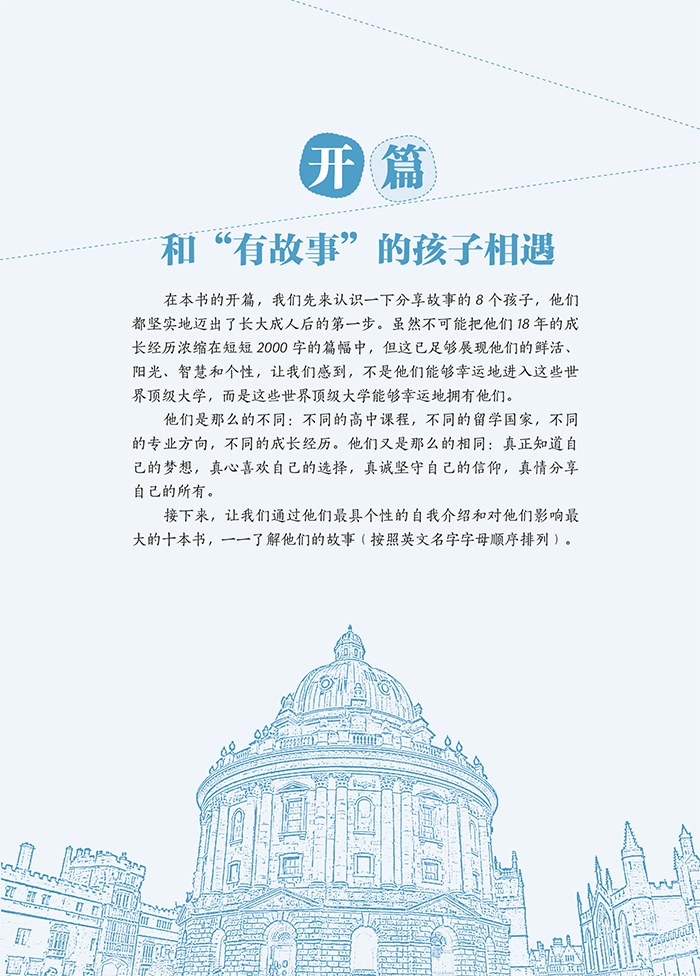 开篇——和“有故事”的孩子相遇留学准备篇——逆袭的故事,孩子可以有国际课程篇——大学的选择在高中标准化考试篇——真功夫不在应试课外活动篇——精彩胜出项大学申请篇——心动的才是好的祝福篇——“有故事”的孩子才有精彩未来