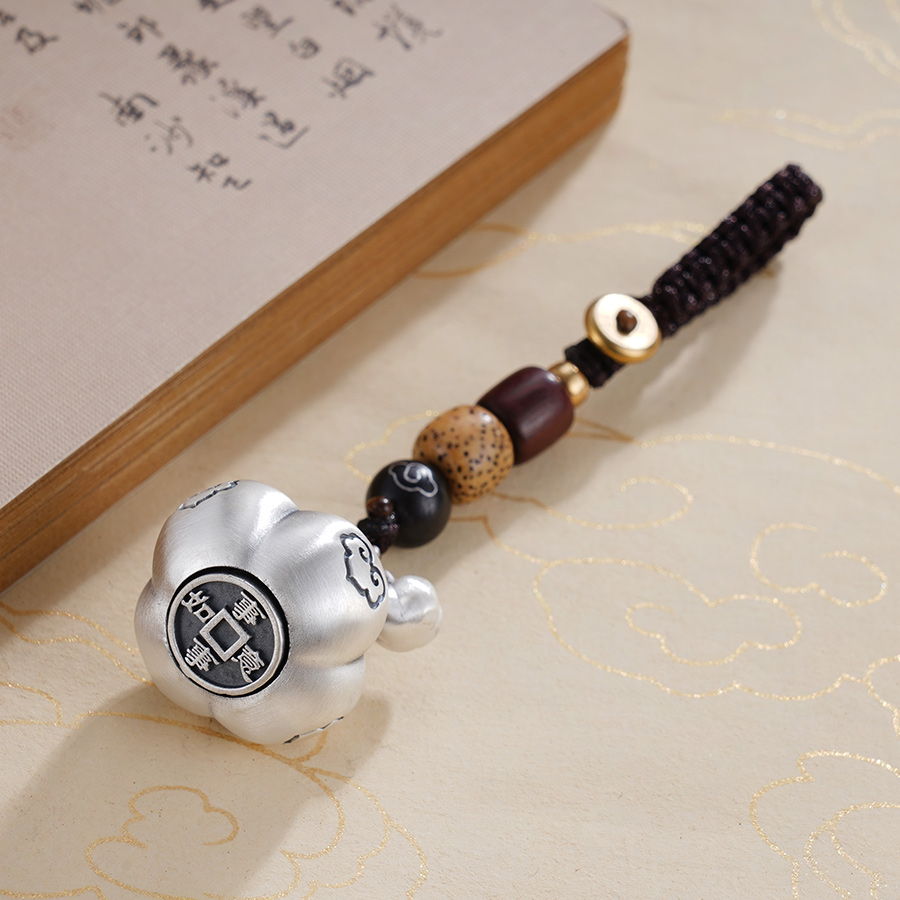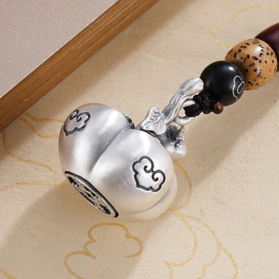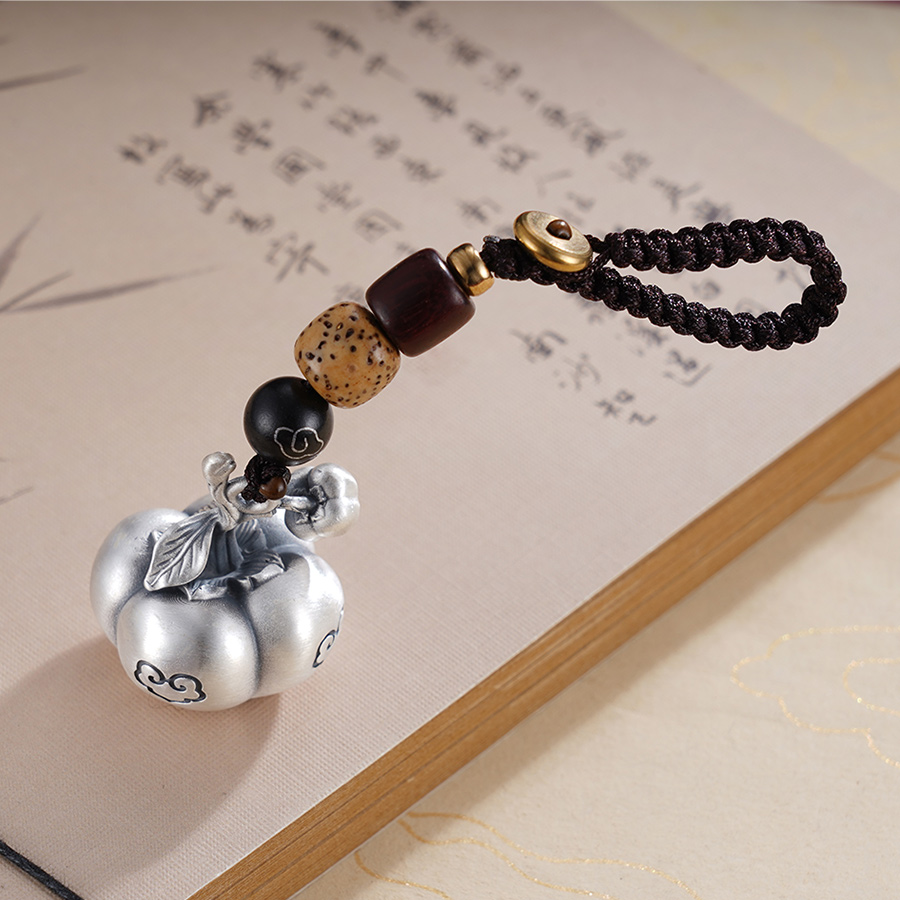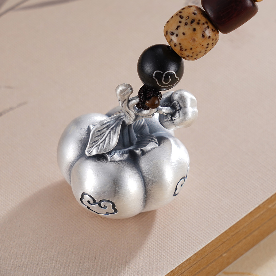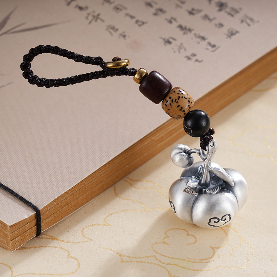【寓意】:足银材质手把件,立体感十足,外侧錾刻如意,底部镶嵌铜钱。整体造型饱满可爱,寓意万事顺心,万“柿”如意。