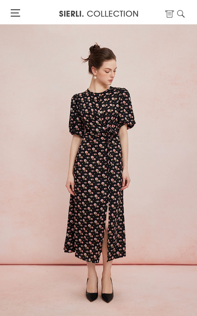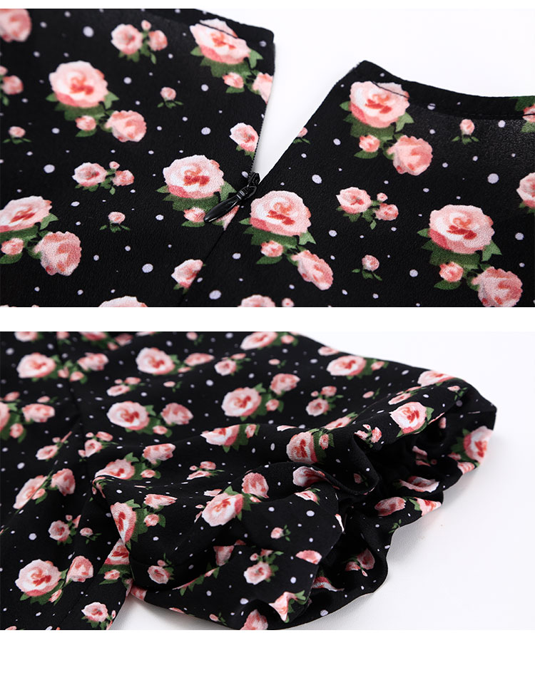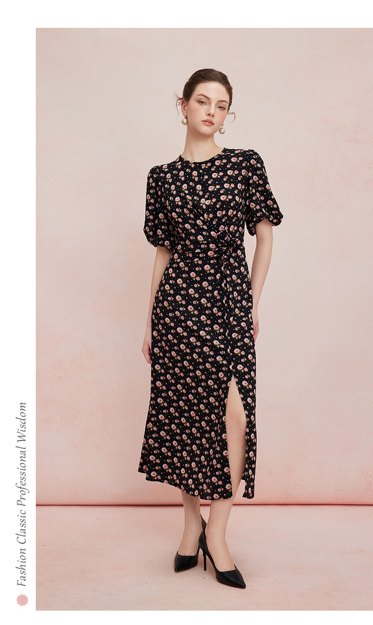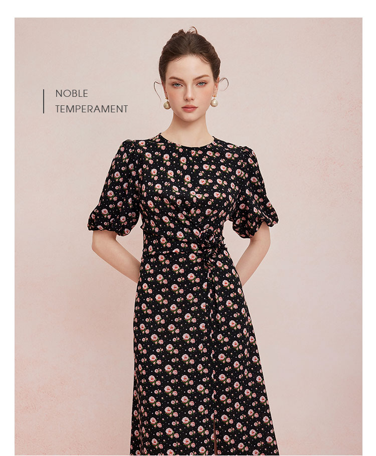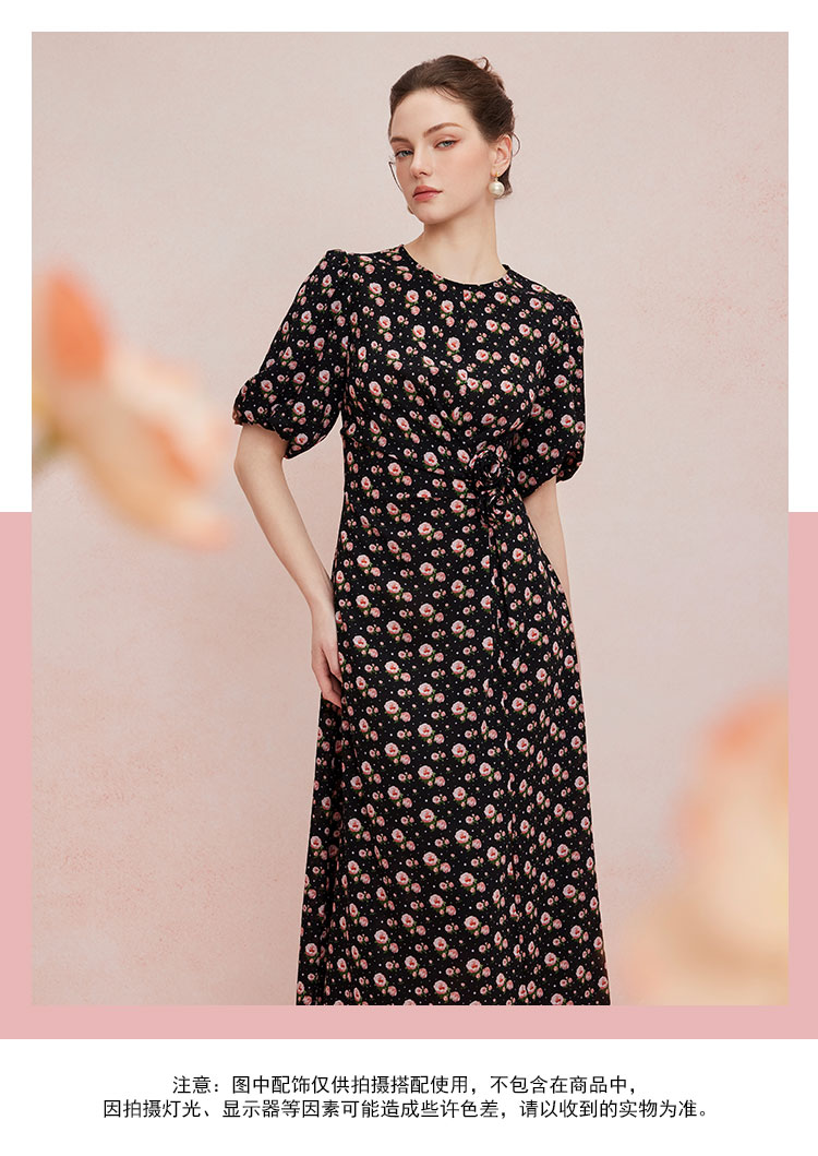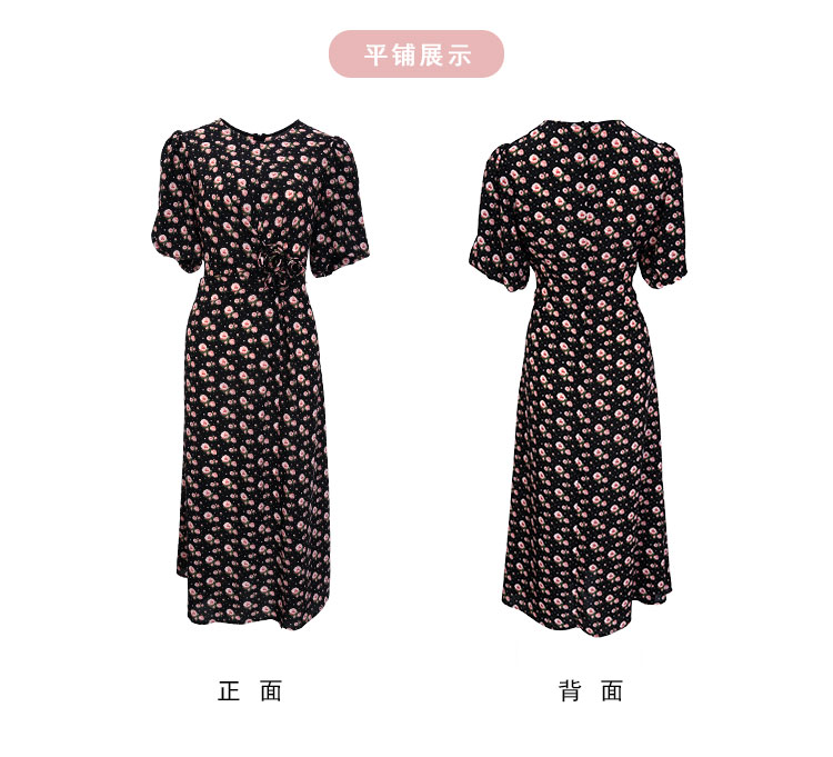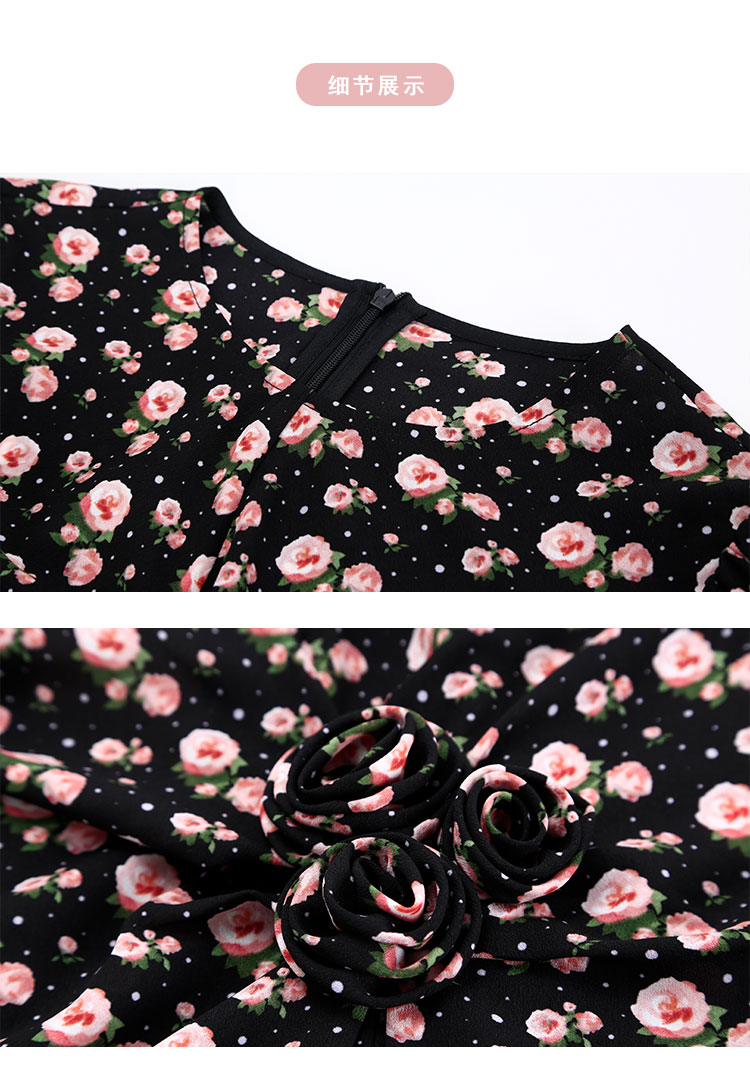 QF863斯尔丽2025夏季新款法式浪漫立体手工盘花腰间收褶显瘦碎花连衣裙