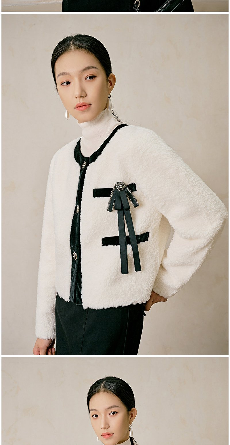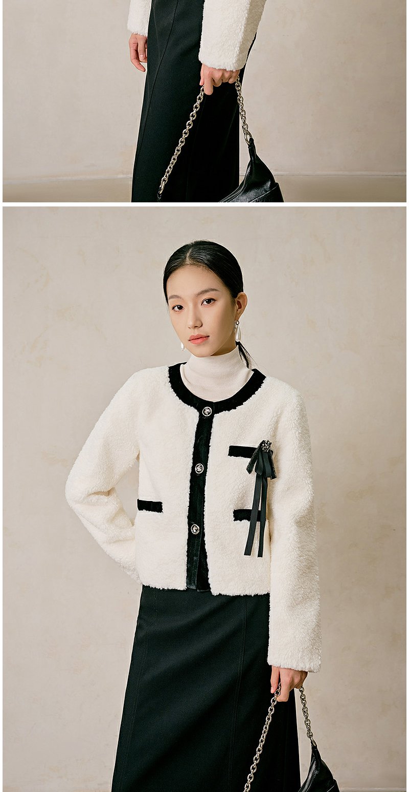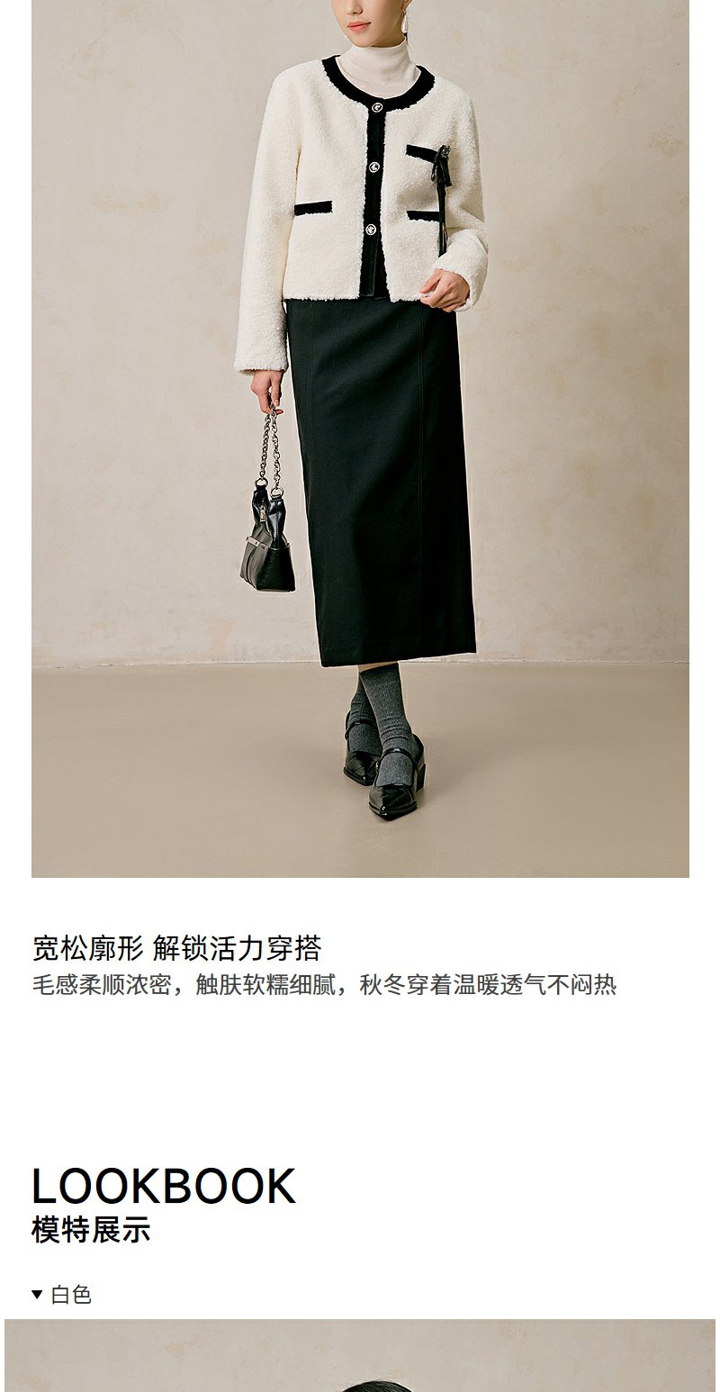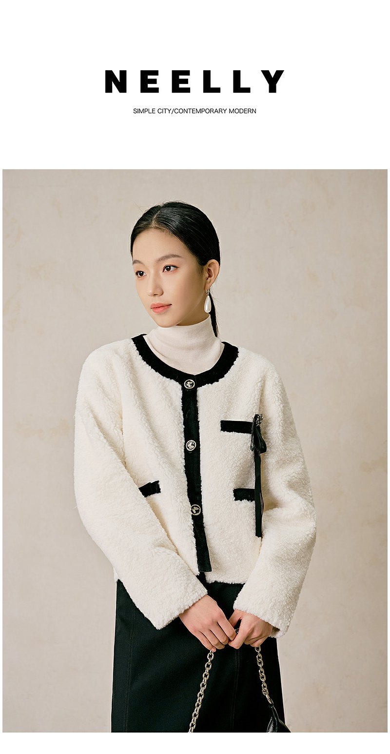 NEELLY纳俪商场同款冬季新款法式小香风黑白撞色毛绒感短外套女N23104C06607
