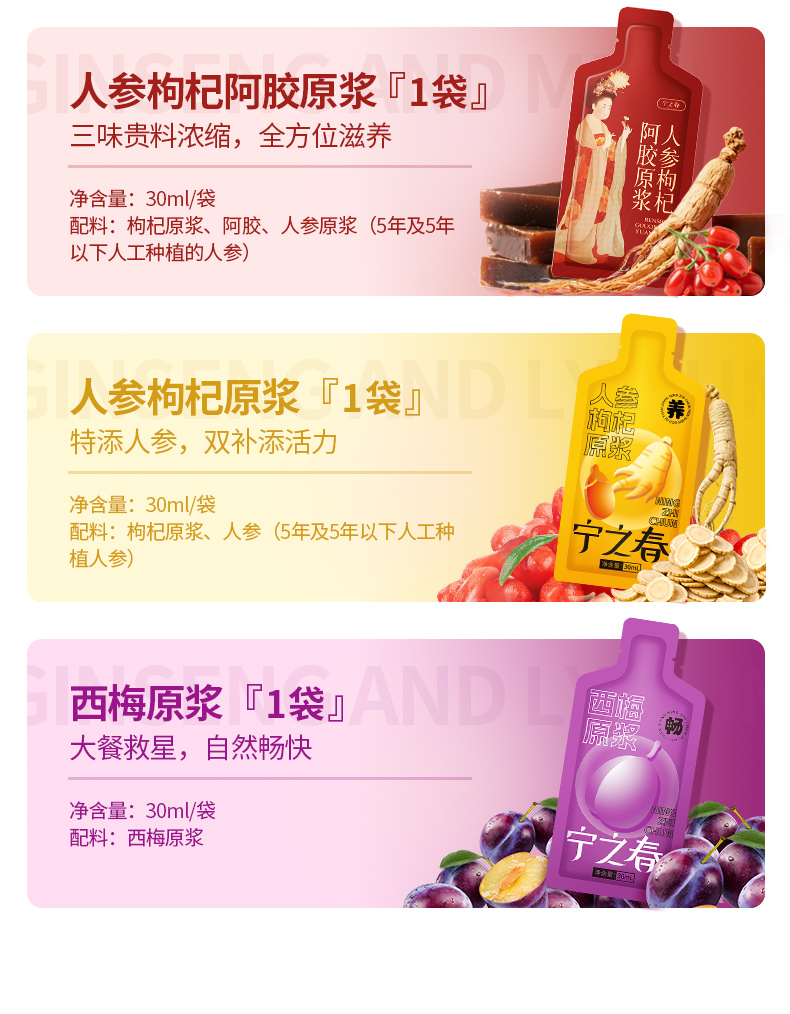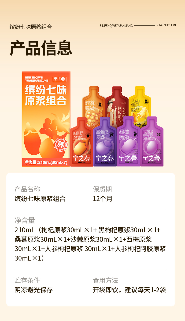 宁之春 缤纷七味原浆组合 30mlx7袋 红枸杞 、黑枸杞、桑葚、沙棘、西梅等......七种原浆
