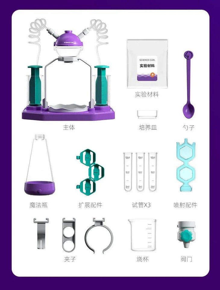 适合6岁以上孩子,只需要很简单倒、按、推这些动作就能完成操作,这种亲手DIY的快乐,要比直接玩玩具带来的快乐多很多~上面展示的还只是其中的一小部分,一套包含了18种主实验和80个扩展实验,娃一天玩一个,整个假期都不带重样的!