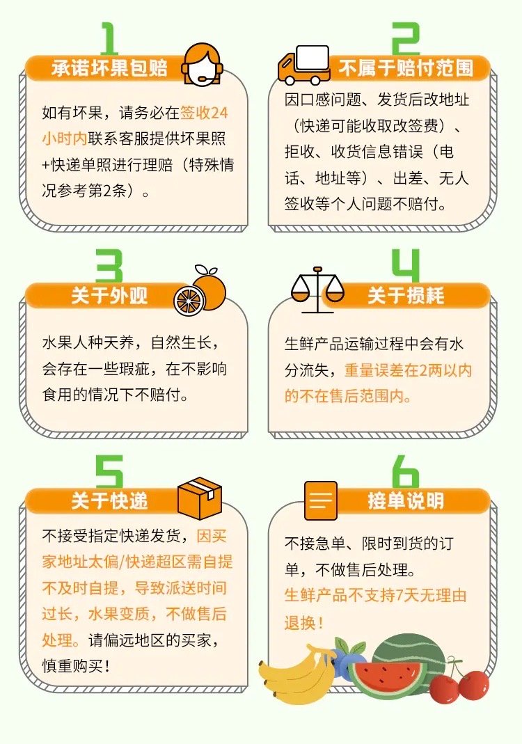 5. 产品外包装轻微破损及果实轻微碰伤不影响食用,部分带有果疤/斑点属于正常现象不售后。因未及时拆箱导致产品损坏不赔付。因买家地址电话错误,地址偏僻/需要自提的不及时自取,导致派送时间过长,商品变质,不予理赔。