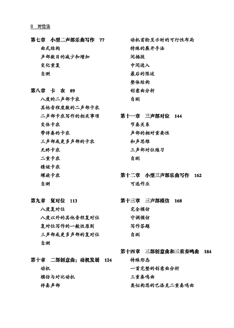 本书是音乐理论家肯特·惠勒·凯南创作的一本音乐教材。作者在书中通过对17、18世纪的音乐进行分析和创作,介绍了对位法的基本理论,在音乐史料中还原了这一技法从诞生到成熟的过程,帮助学生更好的理解和学习对位法这一作曲技法。通过分析可以获得对位技法的了解是有限的,但通过对位例子的实际写作可以更深入地把握这些技法。同时,通过将对位的研究与对应时期的音乐联系起来,为学生提供了清晰的模仿模式,为学生作品的批评提供了明确的依据。