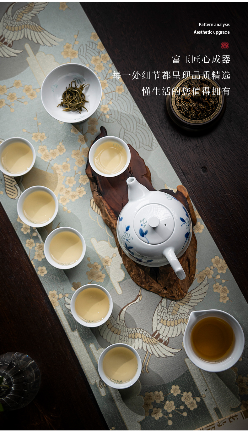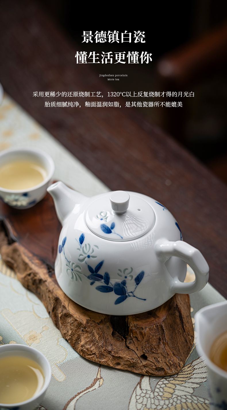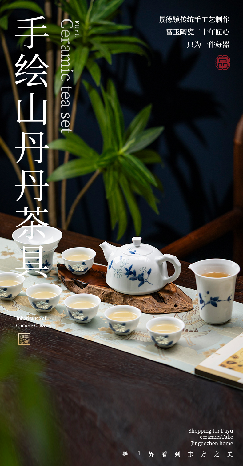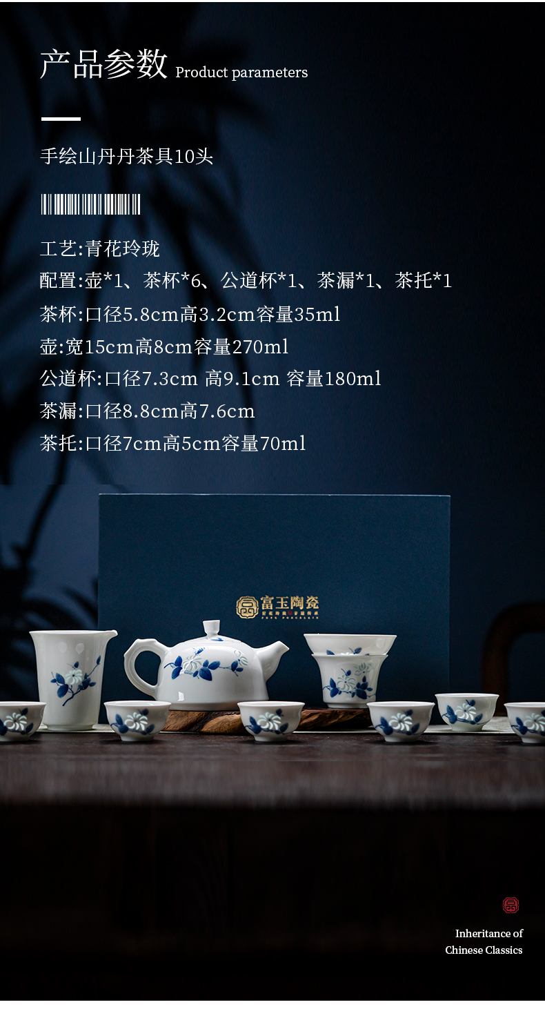 景德镇富玉手绘山丹丹青花玲珑陶瓷功夫茶具套装白瓷家用泡茶壶茶杯