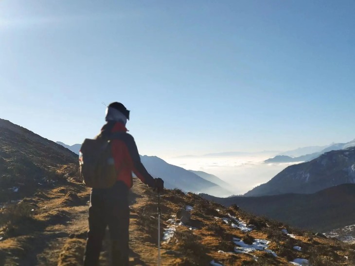 这里可以眺望海拔7556米的贡嘎雪山,在晨光中,站里在山脊上,远方山峦的轮廓逐渐清晰,被染成金色