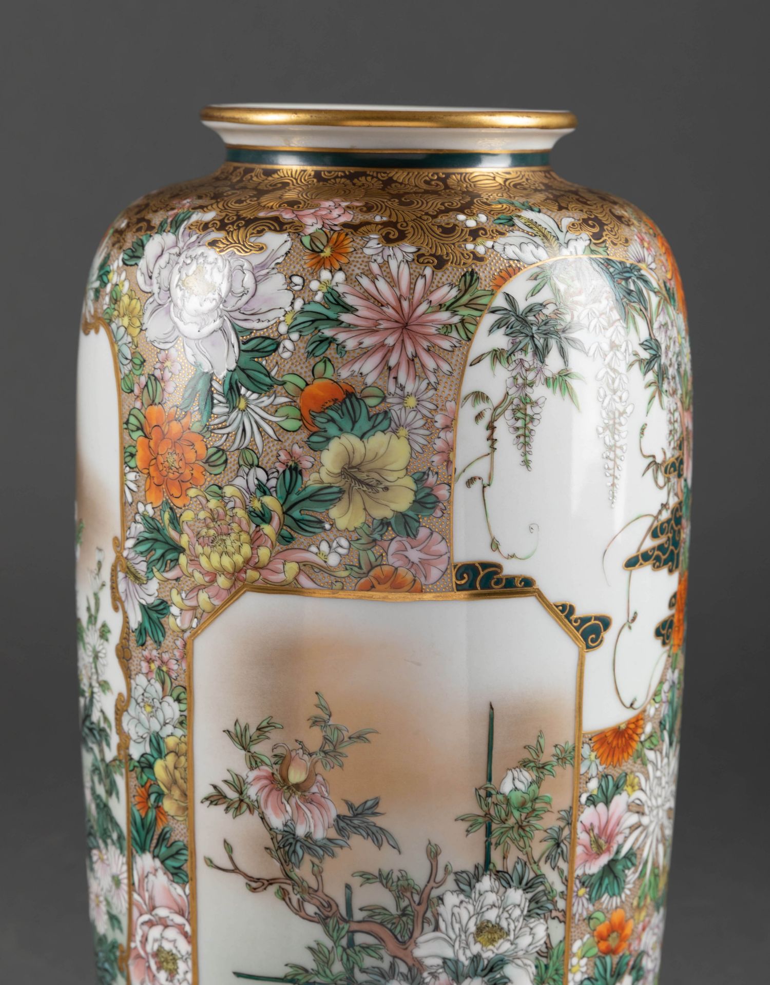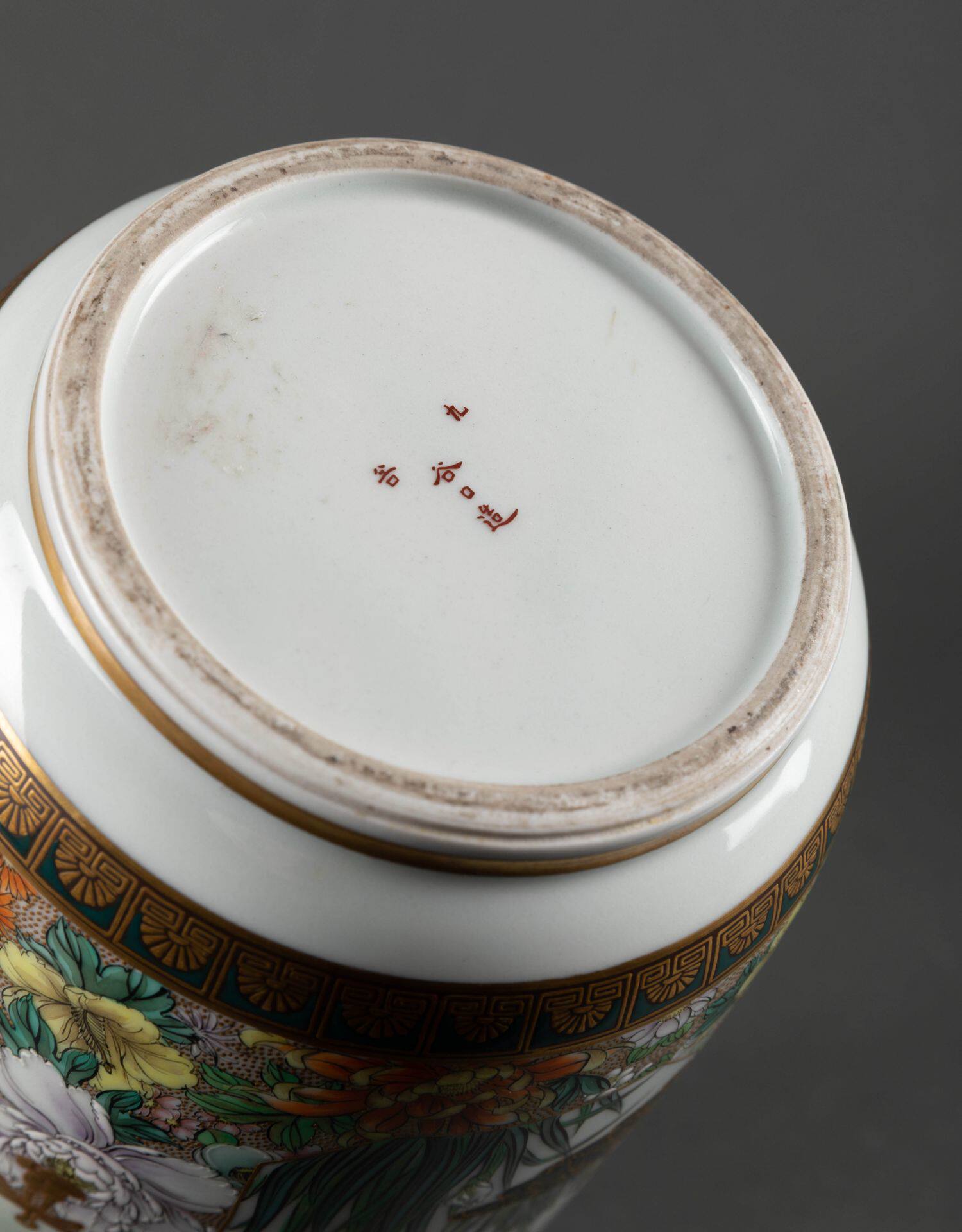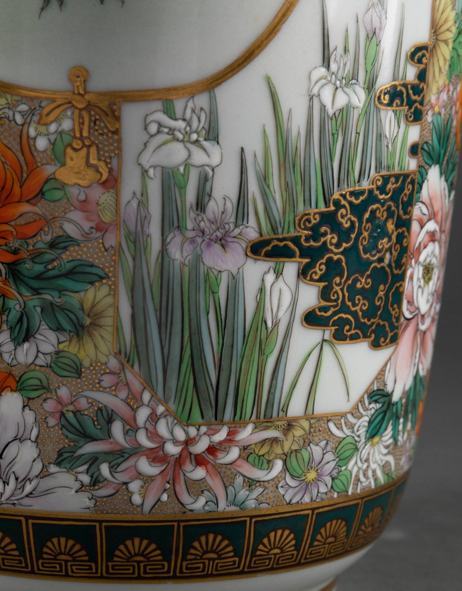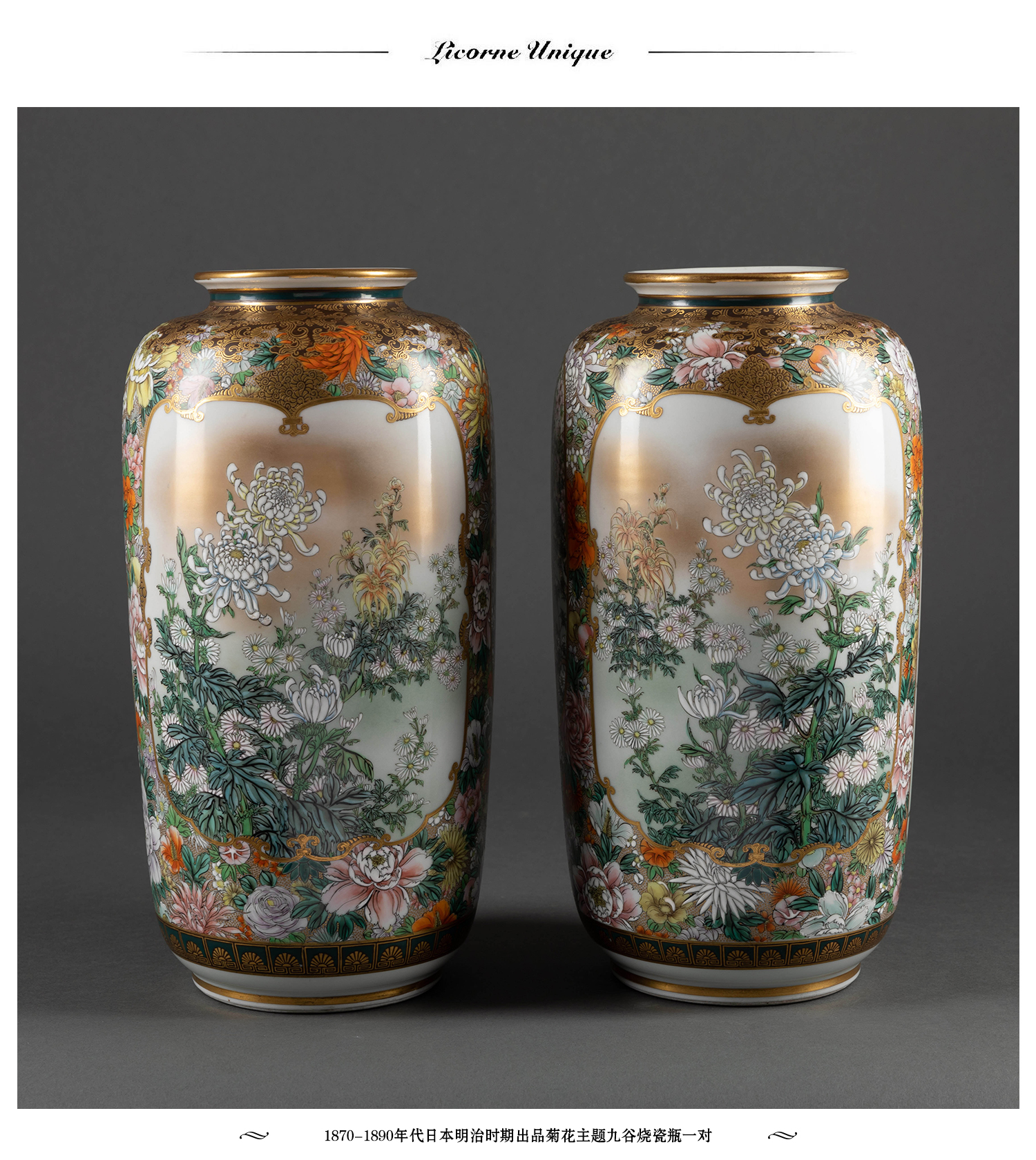 独角鹿西洋古董日本明治时期菊花主题九谷烧瓷瓶陶瓷摆件一对