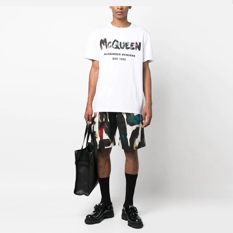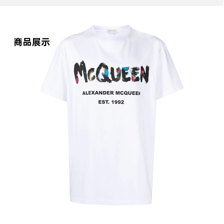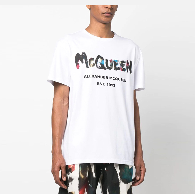 ALEXANDER MCQUEEN 亚历山大.麦昆 男士棉质字母涂鸦徽标印花圆领短袖T恤 白色 727285 QUZ22 0900