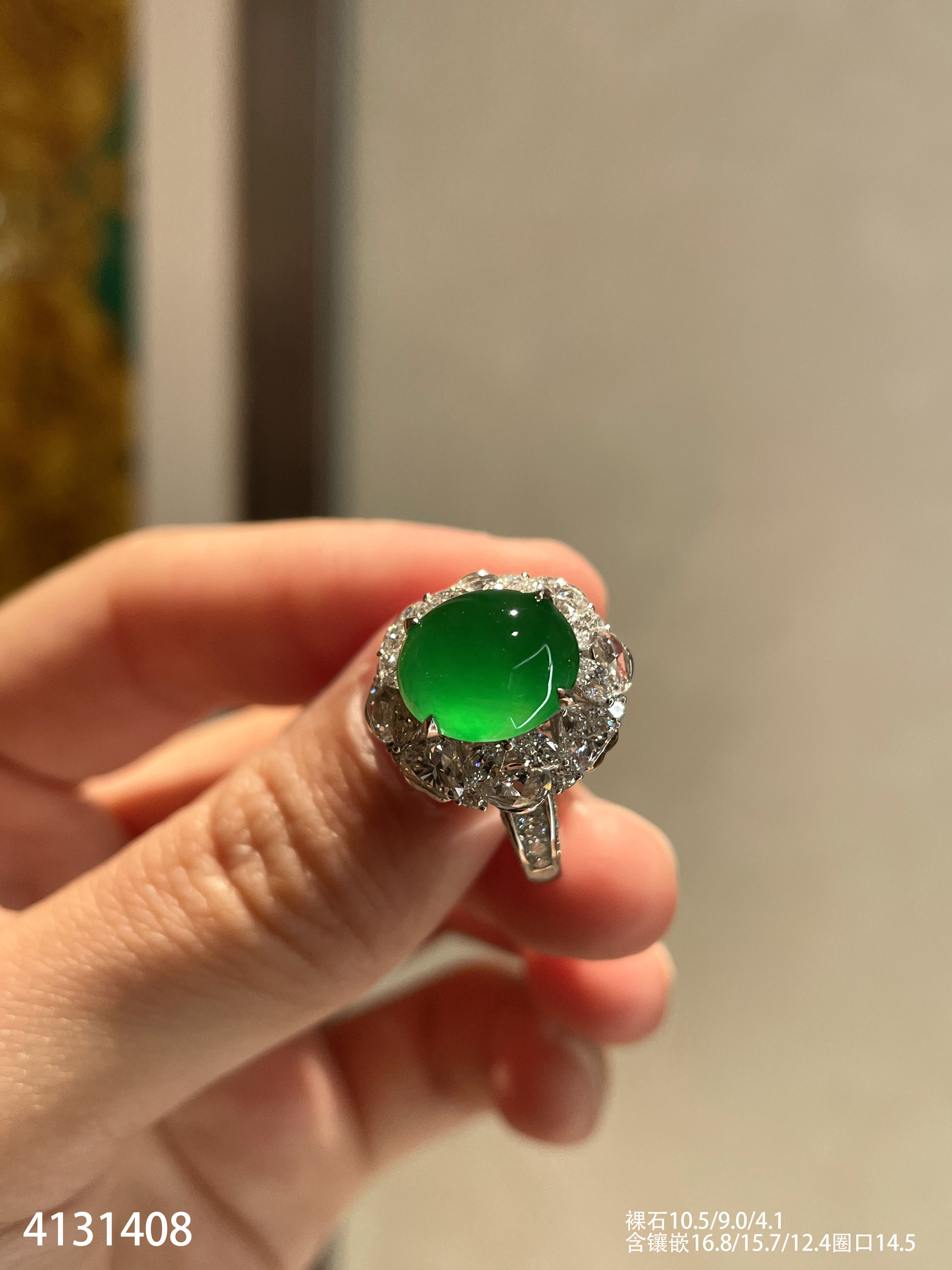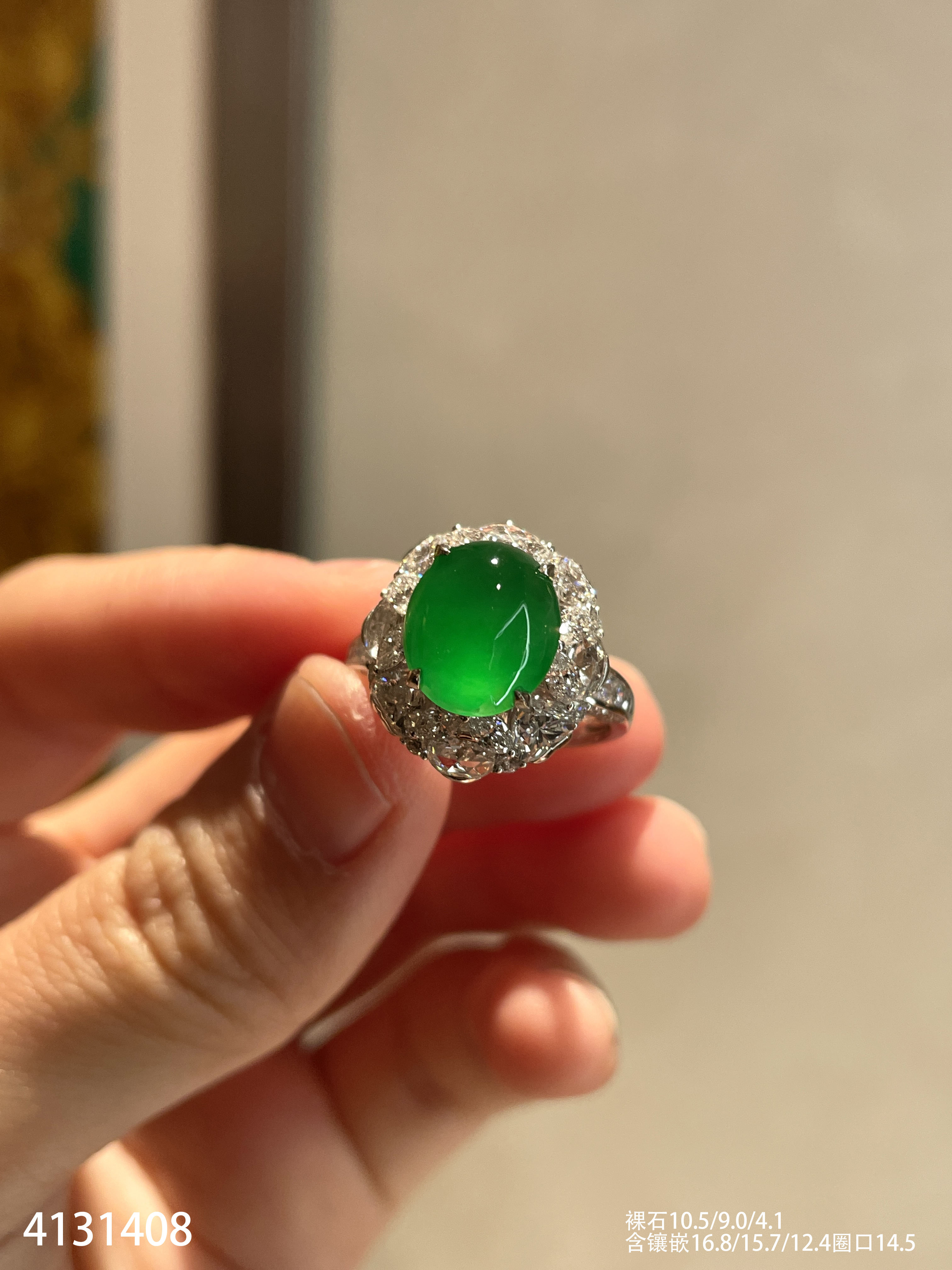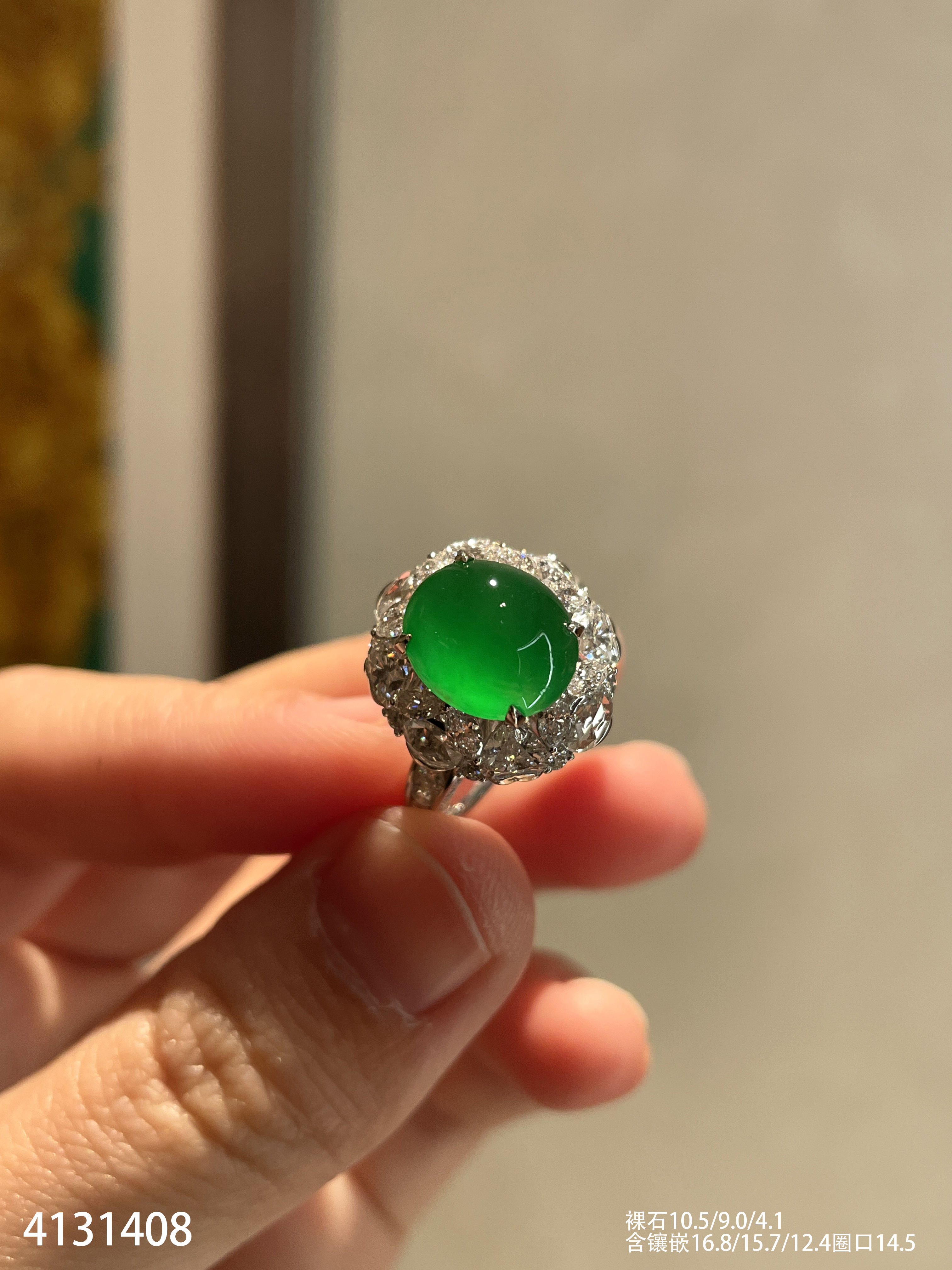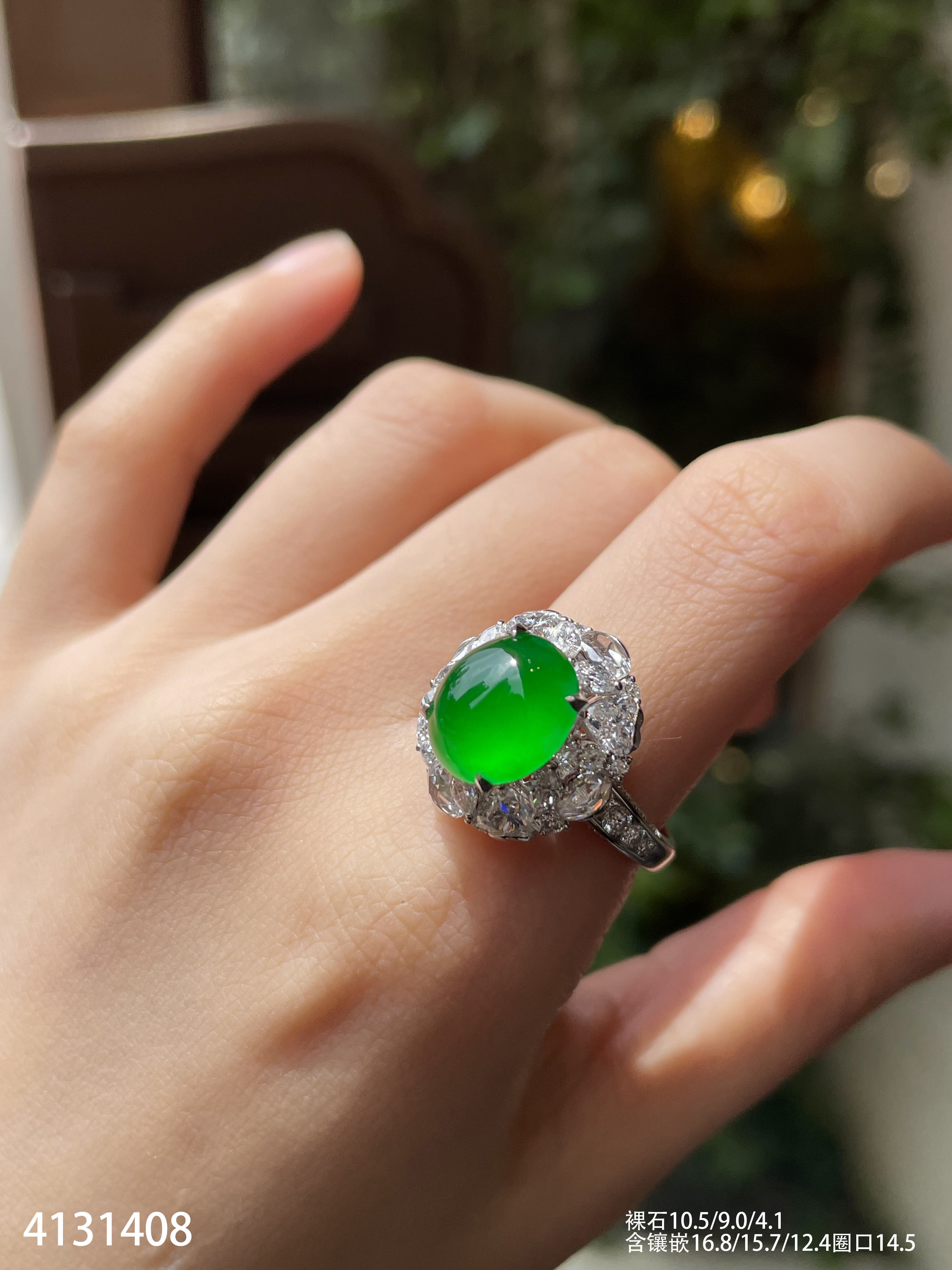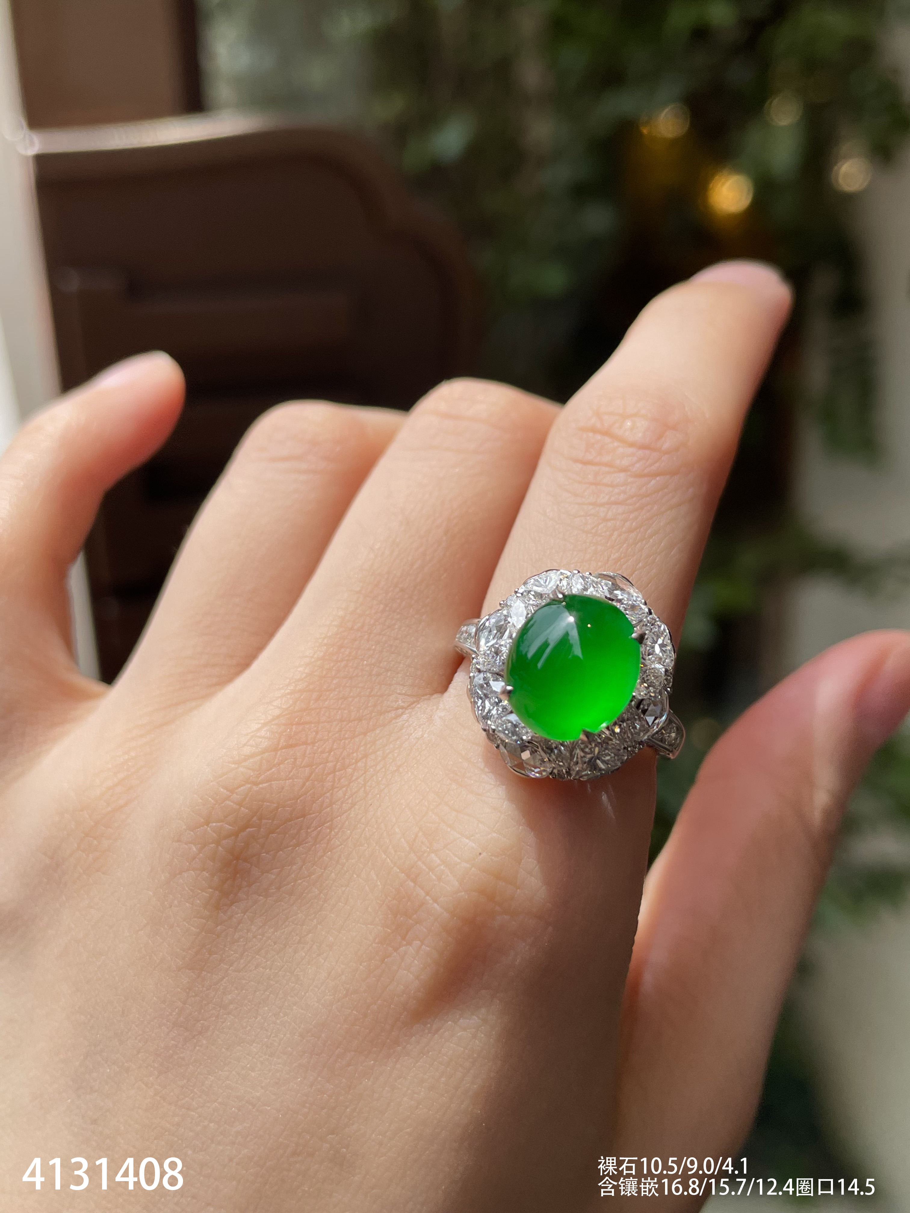 120-1232908,玻璃种木那艳绿蛋面戒指,具体价格微信咨询