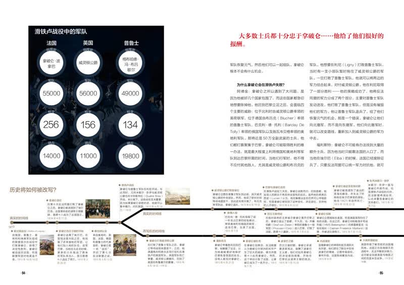 阿德金:拿破仑之所以遇到了大问题,是 因为他被好几个国家包围了,而这些国家都急切 地想要除掉他。他回到巴黎立足之后,会面临四 个主要的威胁:位于比利时由威灵顿公爵率领的 英荷联军、位于德国由布吕克(Blucher)率领 的普鲁士军队、巴克利.德.托利(Barclay De Tolly)率领的俄国军队以及施瓦岑贝格率领的奥 地利军队。那将近是 50 万全副武装的士兵,他 们都打算聚集于巴黎。拿破仑可能取得胜利的唯 一办法,就是最大程度上利用俄国和奥地利等军 队到达巴黎所需的时间。当他们行军时,他不得不应付其他敌人,尤其是威灵顿公爵和布吕克的 军队。他想要在利尼(Ligny)打败普鲁士军队, 当时有一支小部队暂时拖住了威灵顿公爵的军 队。一旦打败了普鲁士军队,他就可以将两边的 军力结合起来,对付威灵顿公爵。他在利尼取得 了一部分胜利 —— 他的策略成功了,他将反法 同盟的军力分成了两个部分,主要对普鲁士军队 发动进攻。他打败了普鲁士军队,但是没有摧毁 他们的军力。他让普鲁士军队退兵了,给了他们 恢复元气的机会。那是一个错误。拿破仑让他们 向北撤军,而不是向东撤军。他们向北撤军时, 就可以改变路线,重新加入到威灵顿公爵的军力中去。