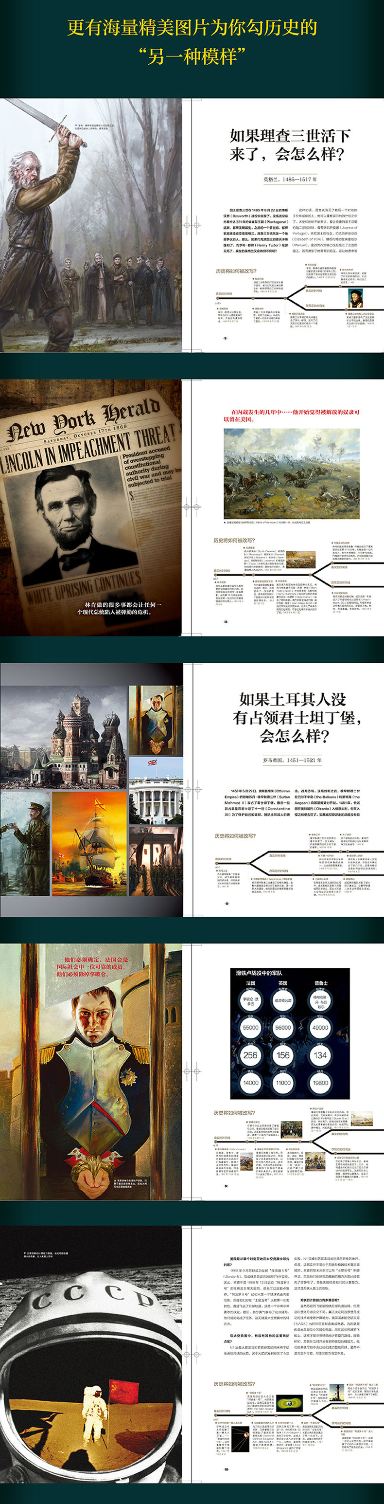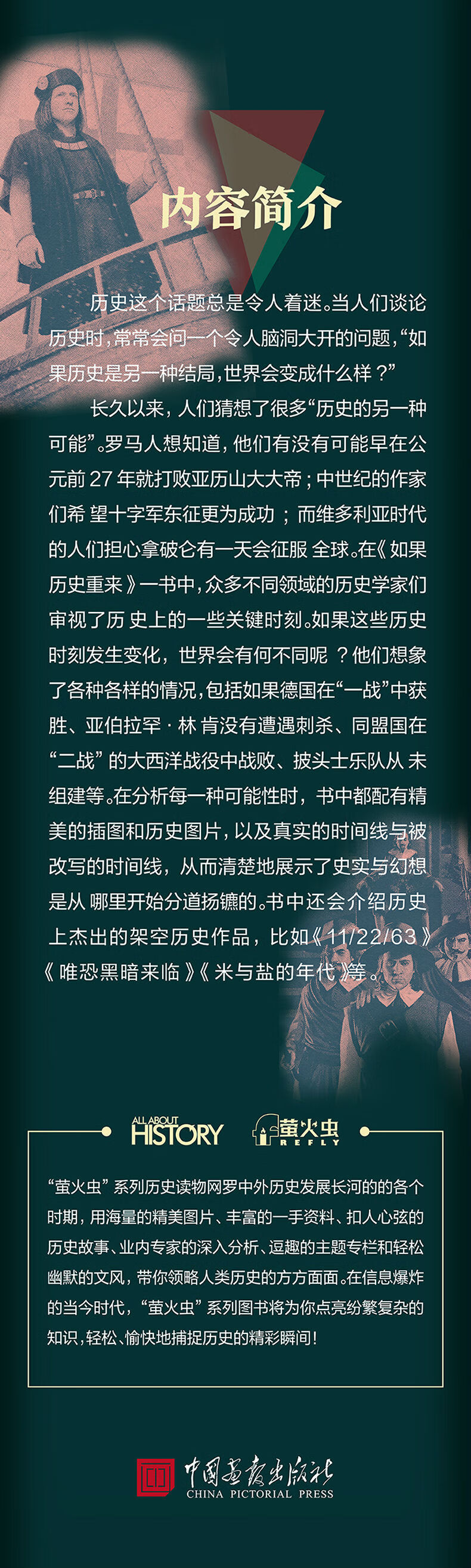 长久以来,人们猜想了很多“历史的另一种可能”。罗马人想知道, 他们有没有可能早在公元前 27 年就打败亚历山大大帝;中世纪的作家们希 望十字军东征更为成功;而维多利亚时代的人们担心拿破仑有一天会征服 全球。在《如果历史重来》一书中,众多不同领域的历史学家们审视了历 史上的一些关键时刻。如果这些历史时刻发生变化,世界会有何不同呢? 他们想象了各种各样的情况,包括如果德国在“一战”中获胜、亚伯拉罕.林 肯没有遭遇刺杀、同盟国在“二战”的大西洋战役中战败、披头士乐队从 未组建等。在分析每一种可能性时,书中都配有精美的插图和历史图片, 以及真实的时间线与被改写的时间线,从而清楚地展示了史实与幻想是从 哪里开始分道扬镳的。书中还会介绍历史上杰出的架空历史作品,比如 《11/22/63》《唯恐黑暗来临》《米与盐的年代》等。