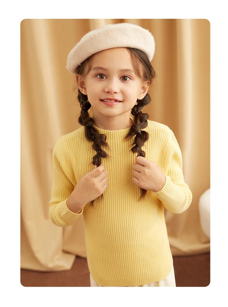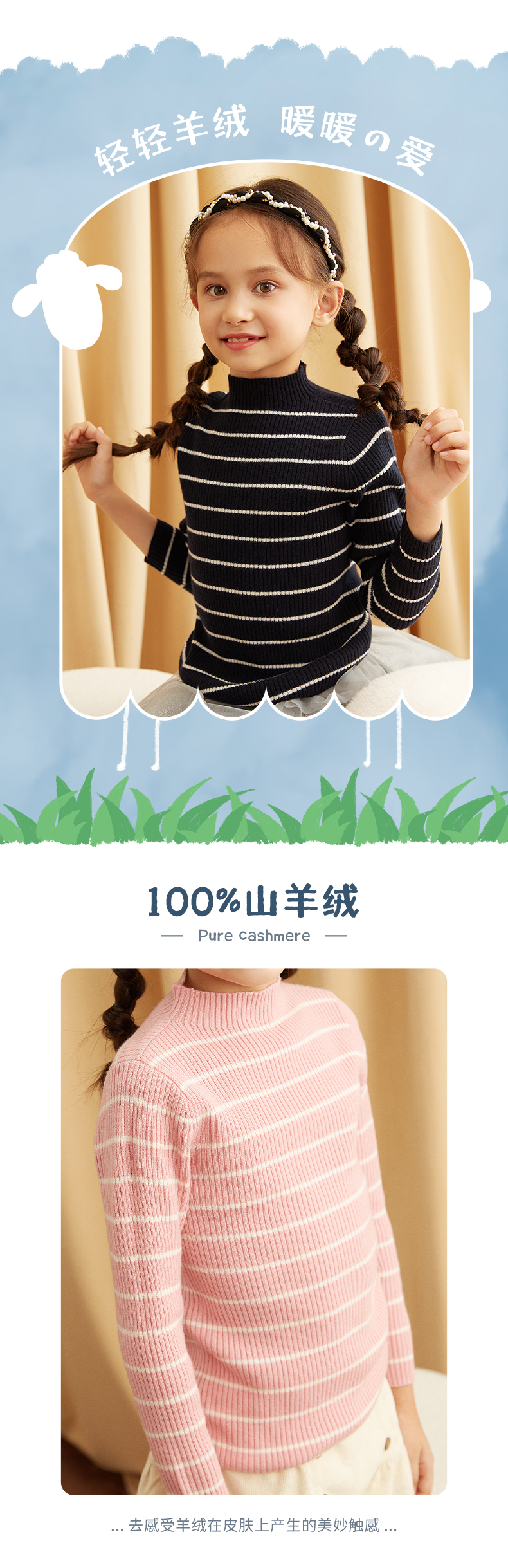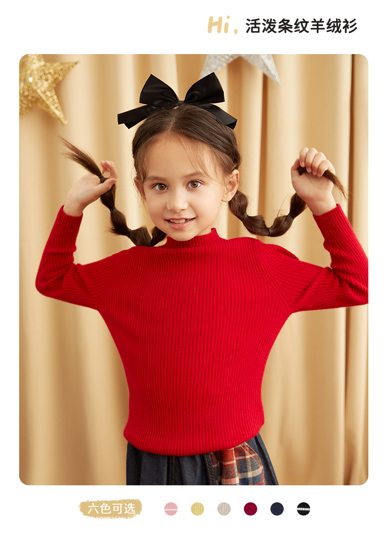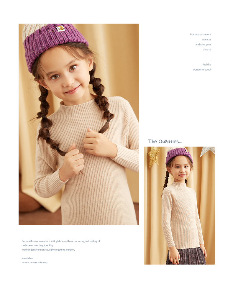 METTE羊绒世家女童中大童100%山羊绒衫时尚半高领坑条纹弹力保暖毛衣