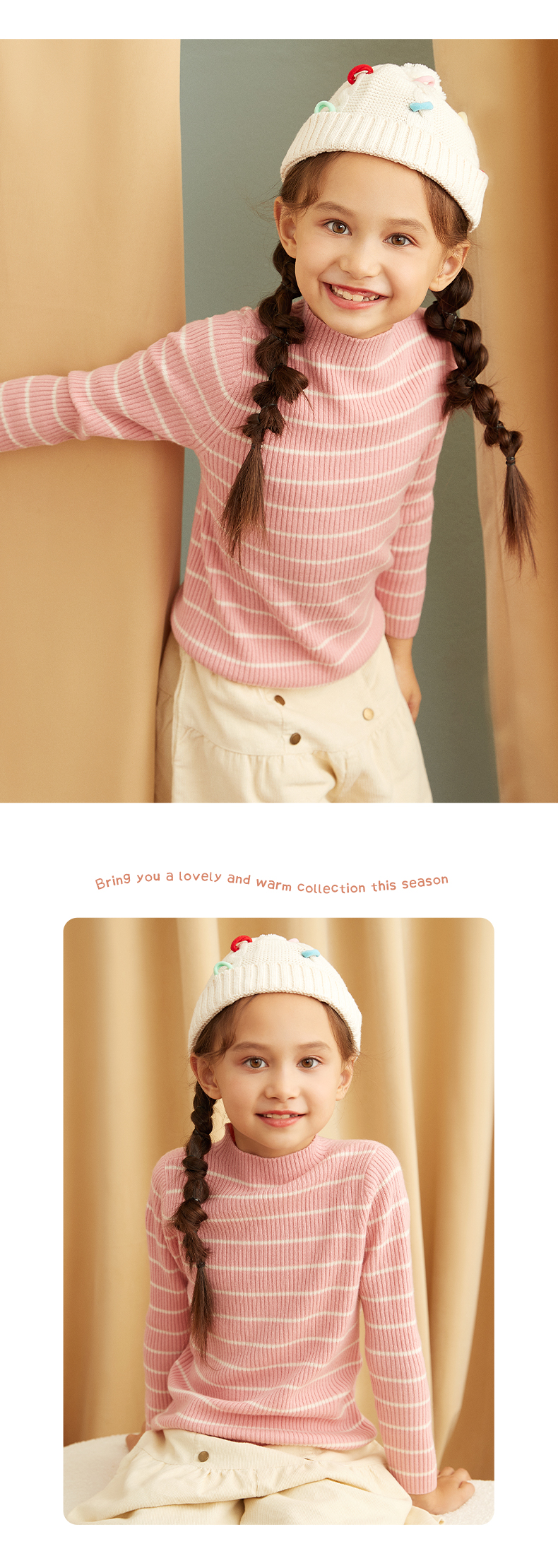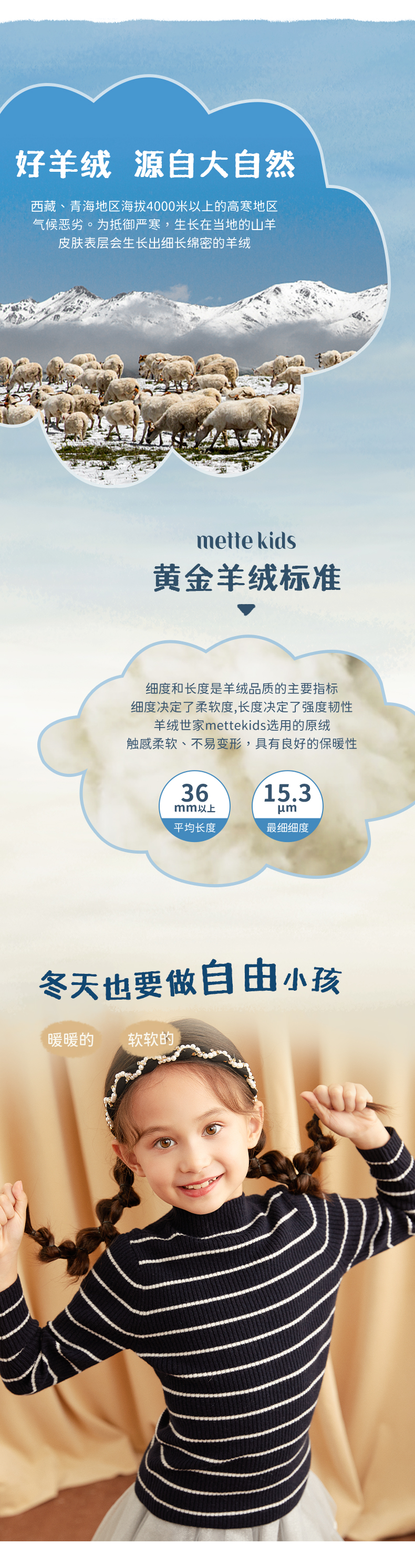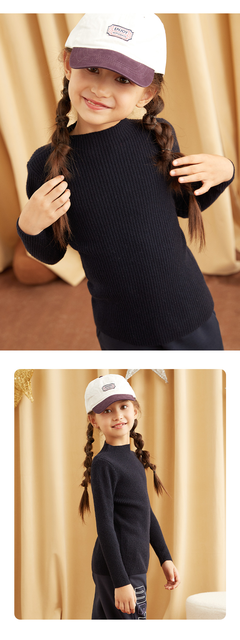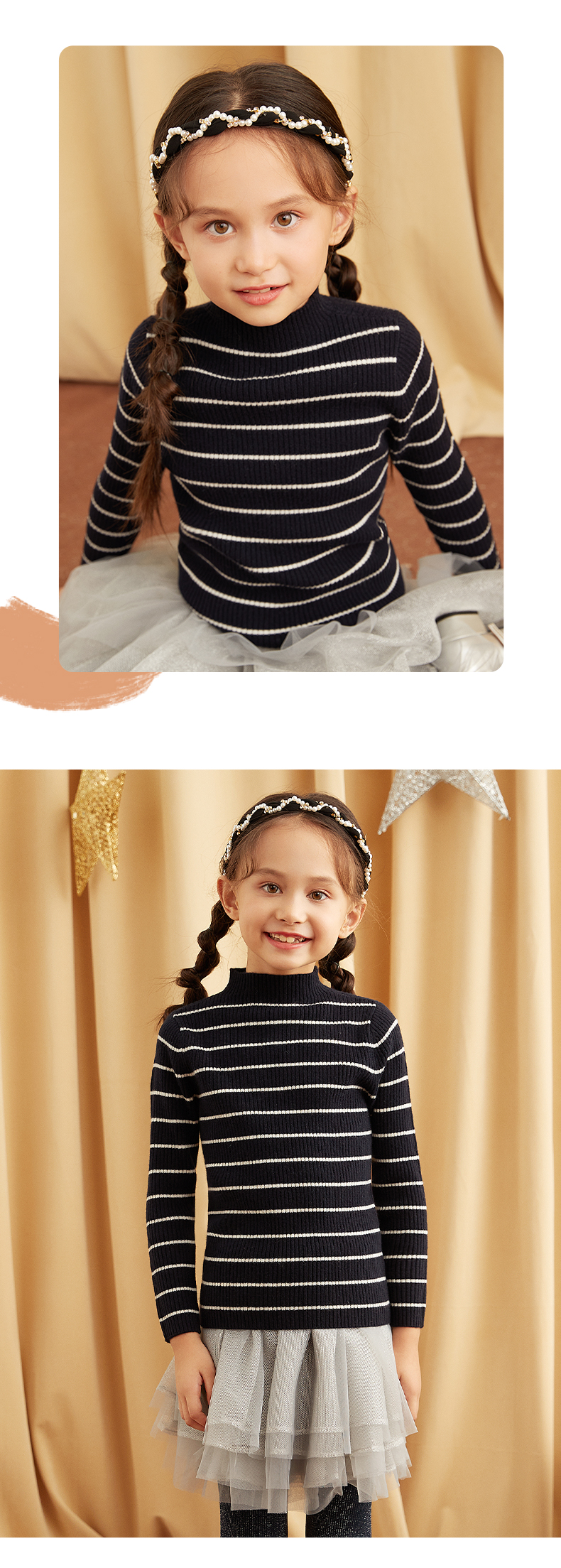 METTE羊绒世家女童中大童100%山羊绒衫时尚半高领坑条纹弹力保暖毛衣