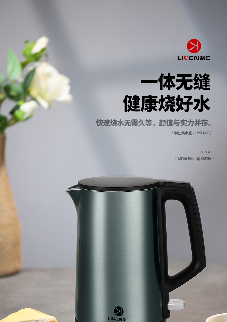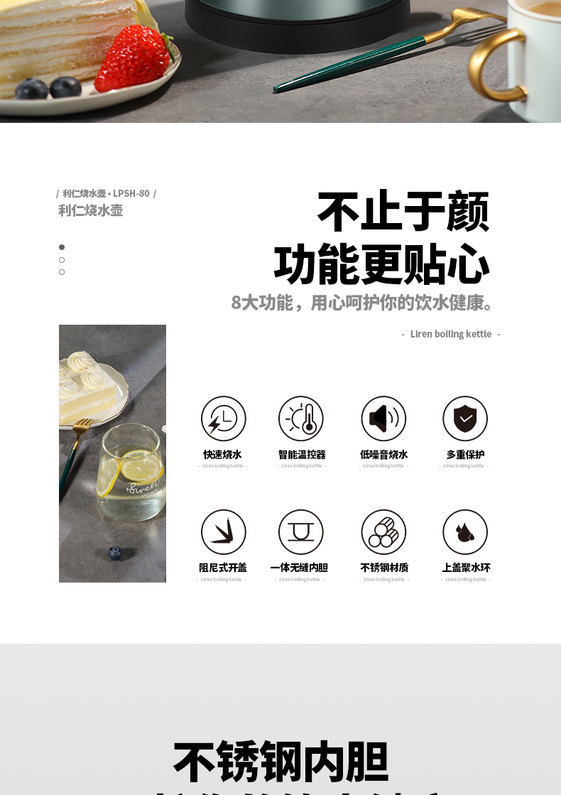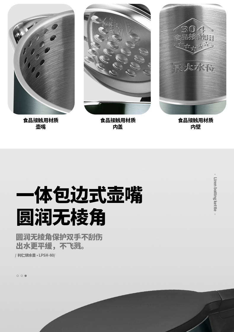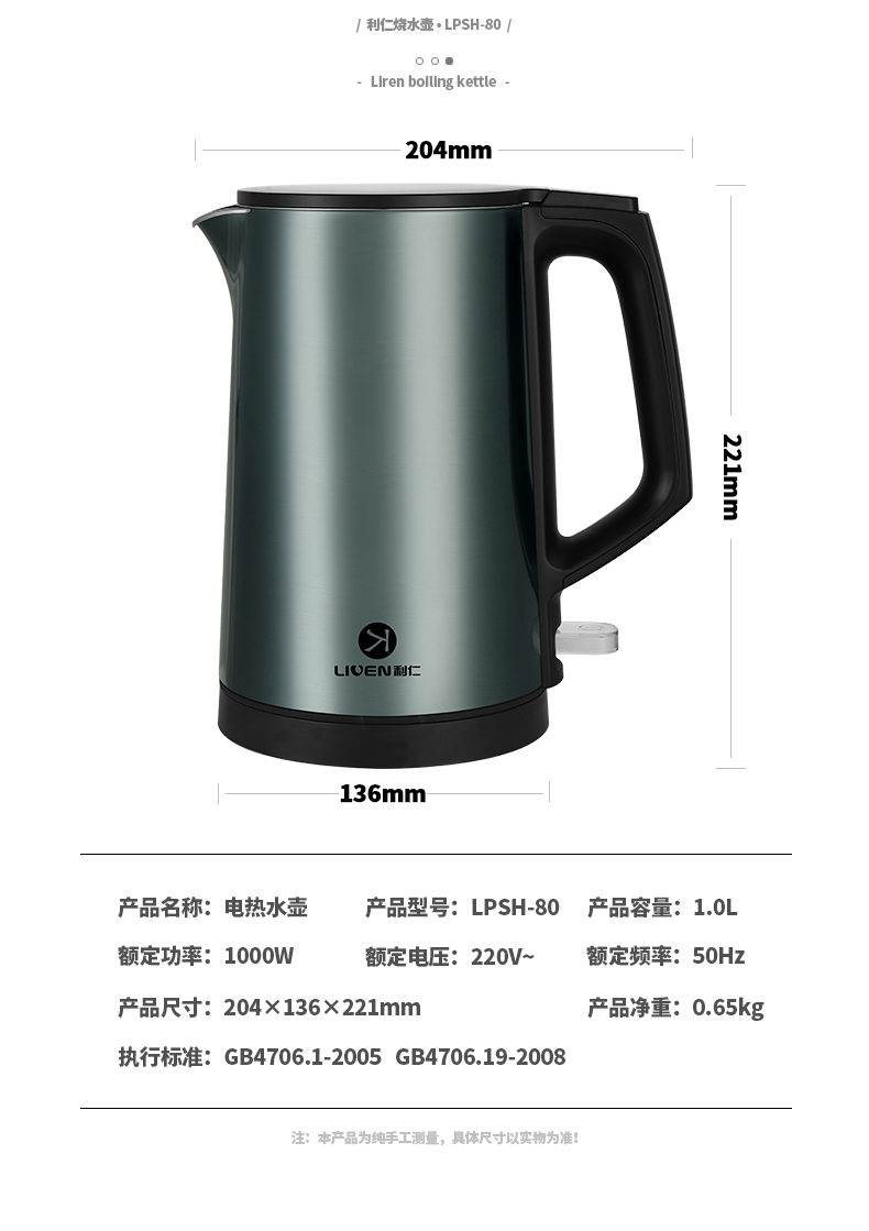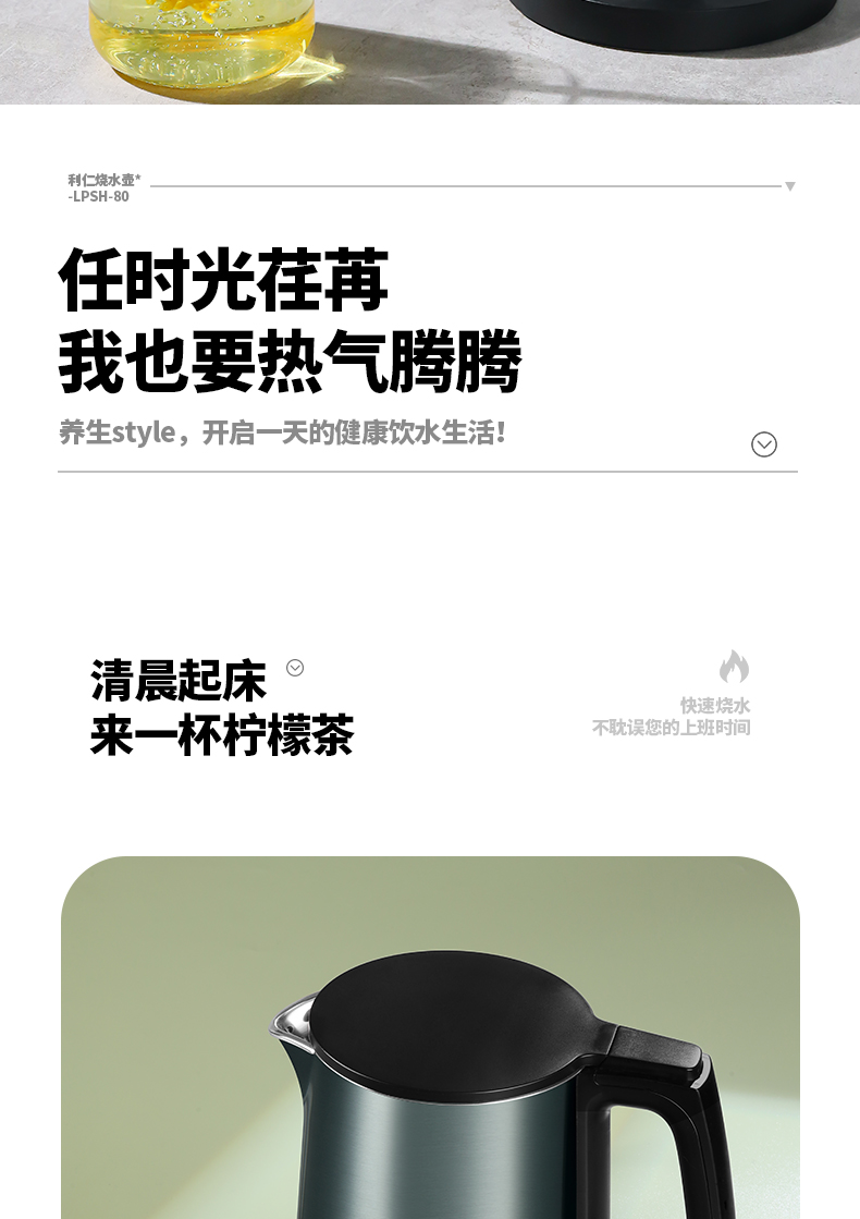 利仁电水壶热水壶烧水壶1.0L黄金容量双层防烫304不锈钢无缝全钢智能断电LPSH-80 电水壶