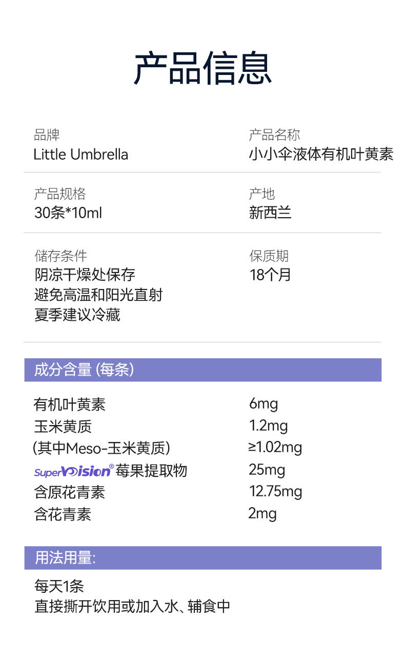 新版LittleUmbrella小小伞有机叶黄素10ml /30条盒