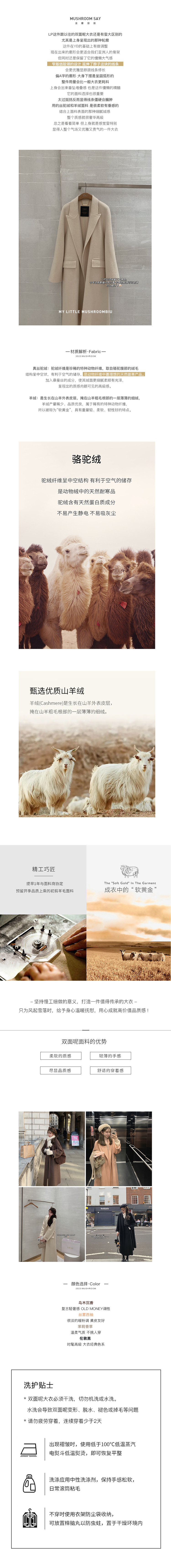 | 面料:米色: 10蚕丝 10骆驼绒 80羊毛 可可全铁: 10驼绒 10蚕丝 80羊毛 三文鱼枯: 10驼绒 10蚕丝 80羊毛: 黑色:10羊绒 90美利奴羊毛 |