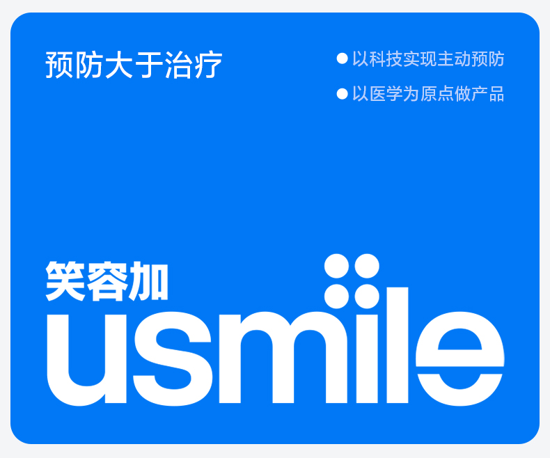 usmile笑容加,创立于2015年,致力成为全球用户首选的专业口腔护理品牌,以提升全球用户口腔健康水平为使命,见证和守护每一位用户的健康笑容。