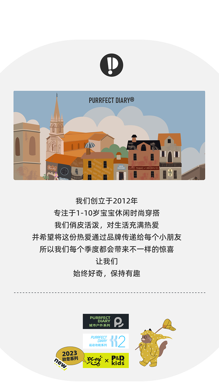 Purrfect-Diary专注于贴近自然随性的穿着概念,轻奢平价的童装文化传播,在产品设计上更加注重婴童穿着的舒适性、安全性、更出众的国际化品牌,将欧美的育婴文化在中国进行深入的传播与推广。