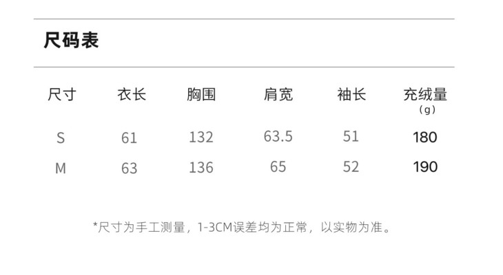 【尺码】S(90-135斤,充绒量180g),M(135-170斤,充绒量190克)