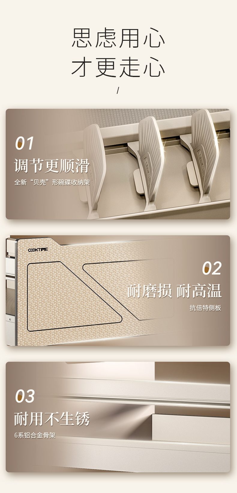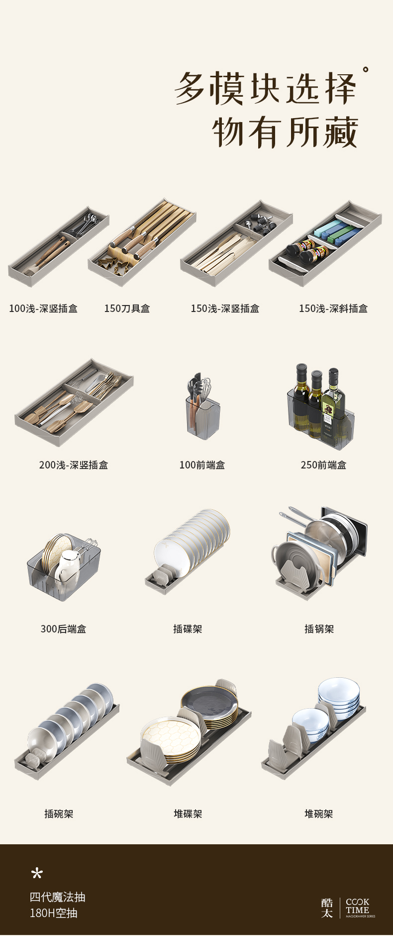 - 酷太坚持8年自主研发,已获得专利证书130项,拥有一套领先市场的厨房收纳系统,为千万中国家庭解决厨房脏乱差,缔造厨房新生活。