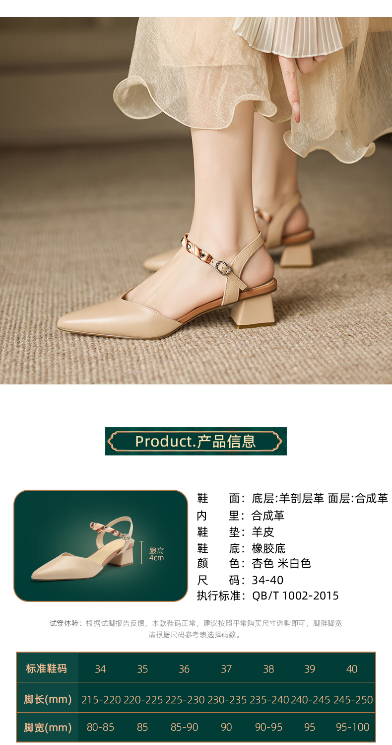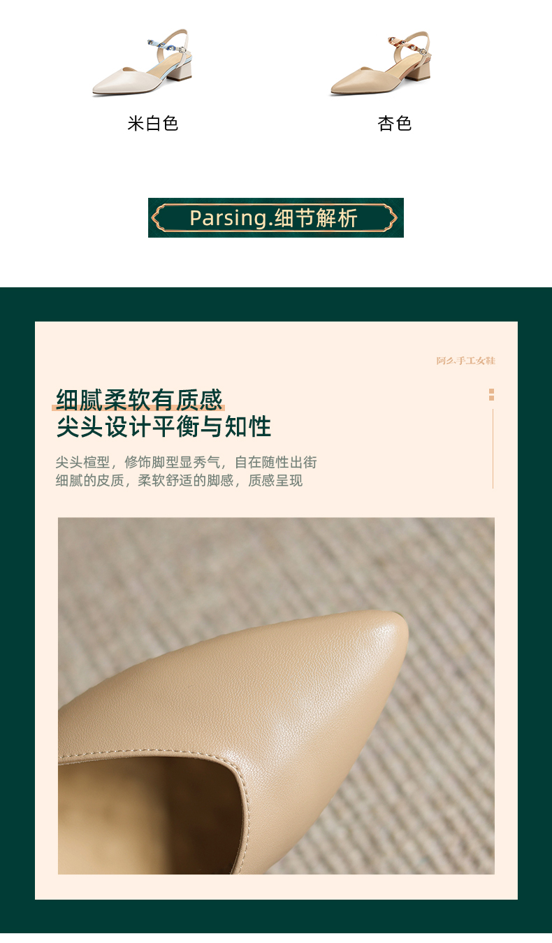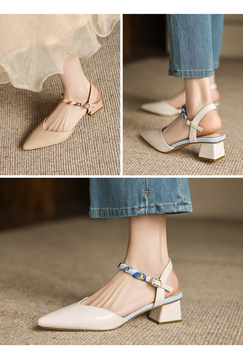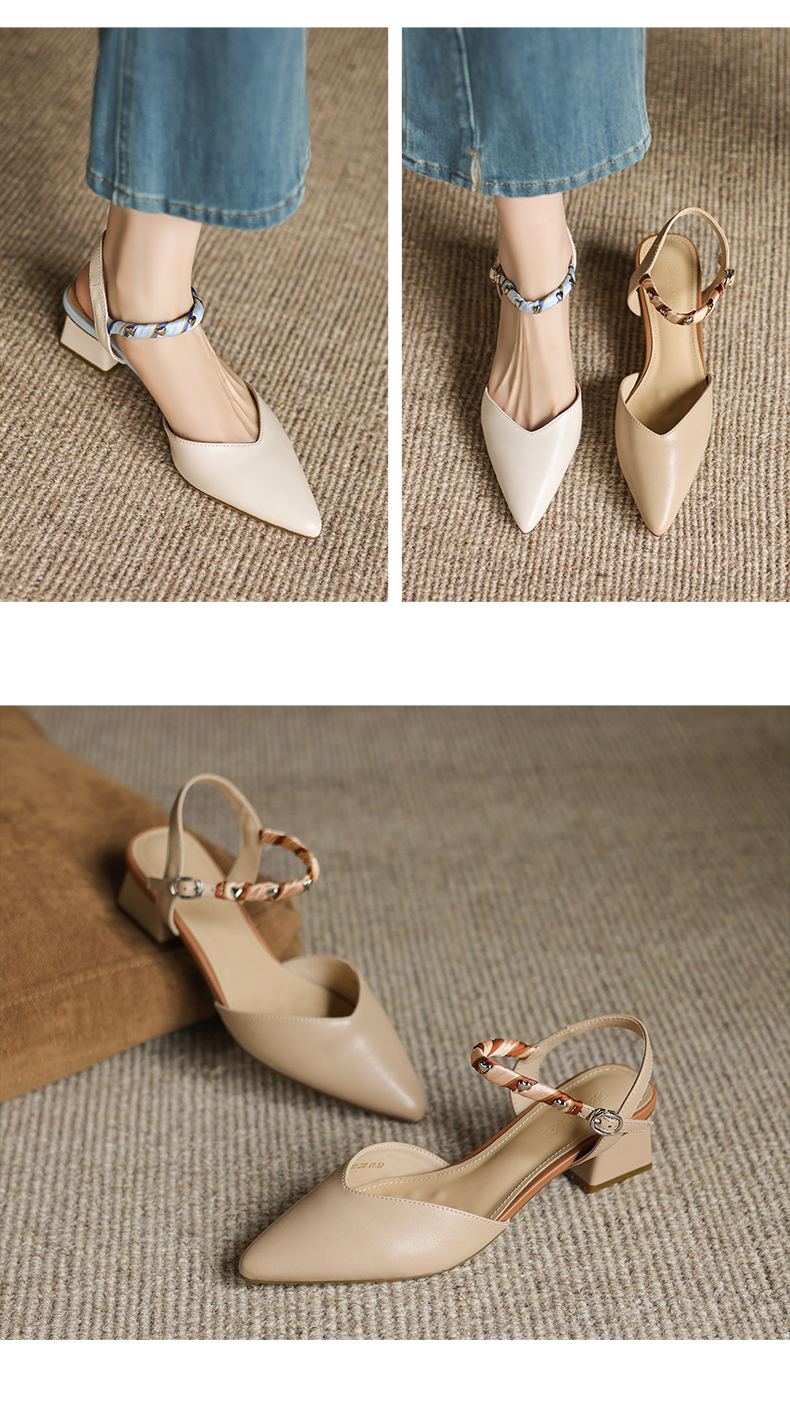 阿么手工女鞋一字带真皮凉鞋夏粗跟2025新款丝带尖头中跟鞋女4CM