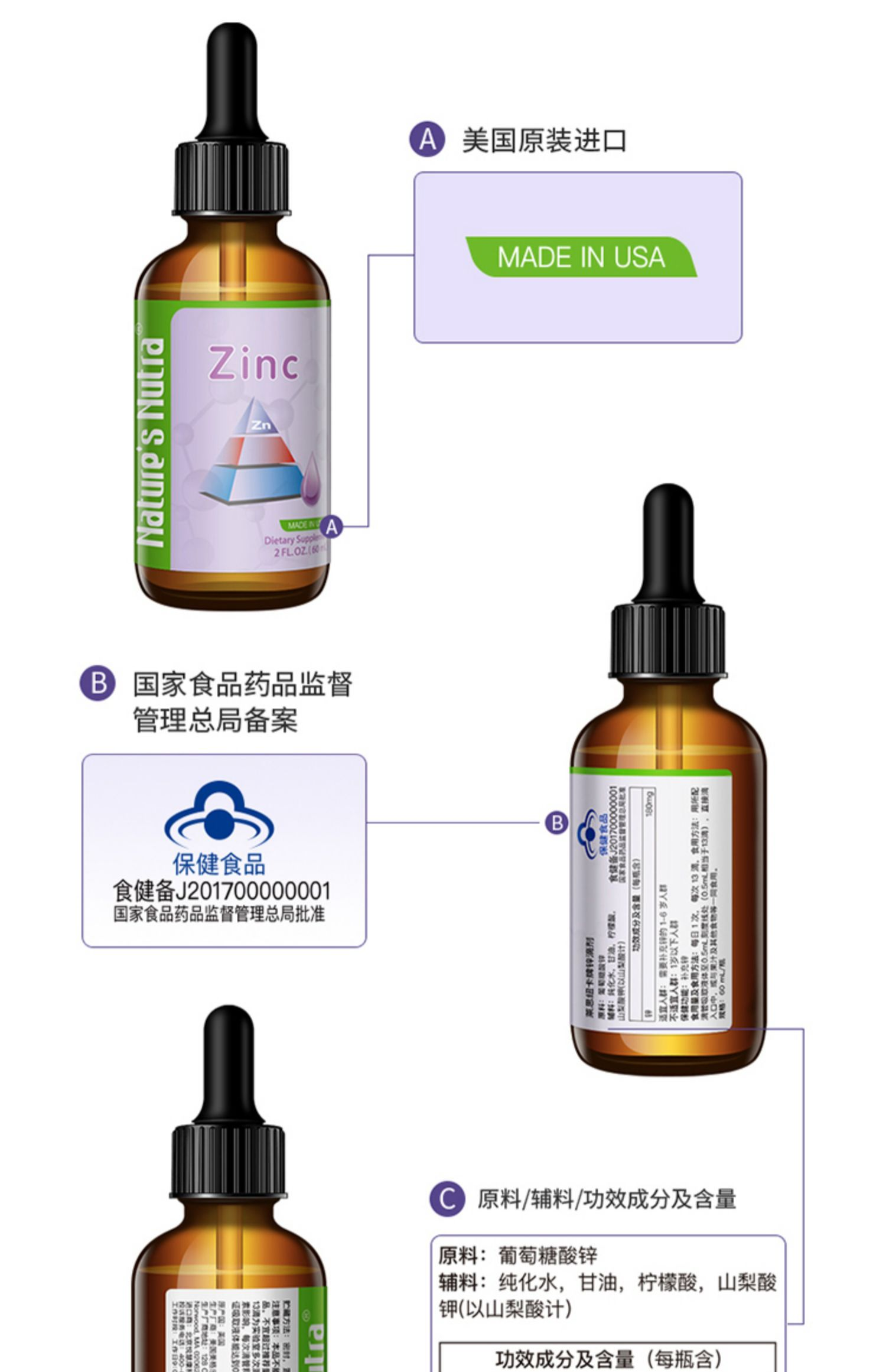 【金字塔版】莱思纽卡 Nature's Nutra美国进口宝宝液体锌儿童锌 葡萄糖酸锌滴剂60ml