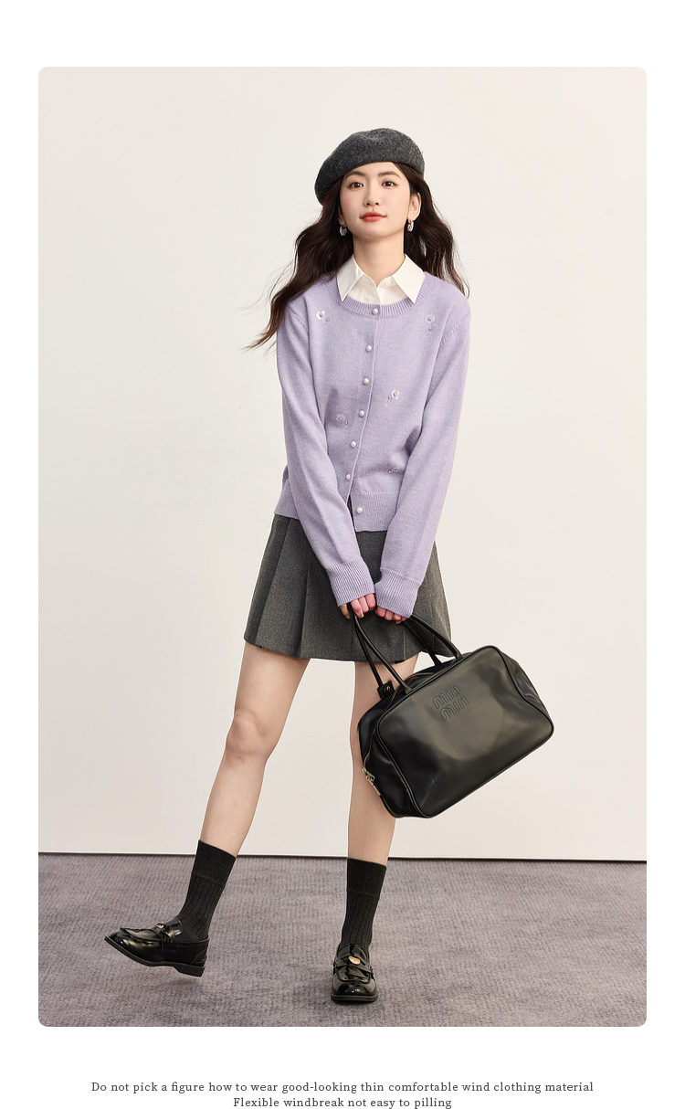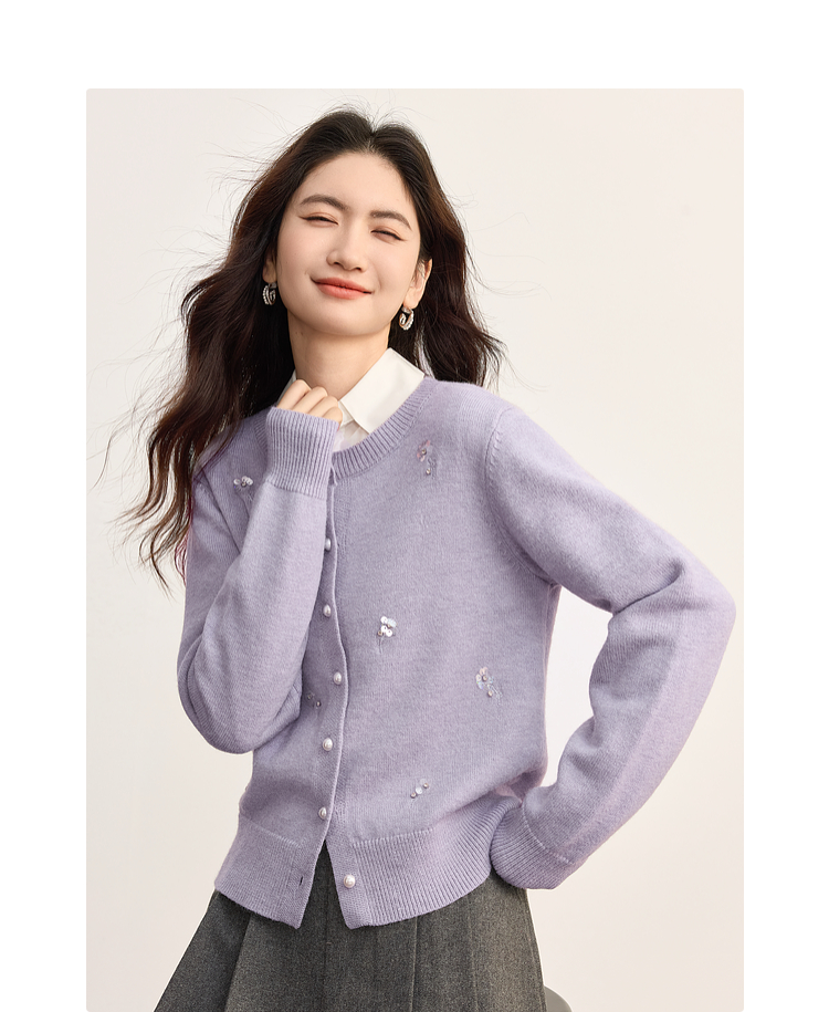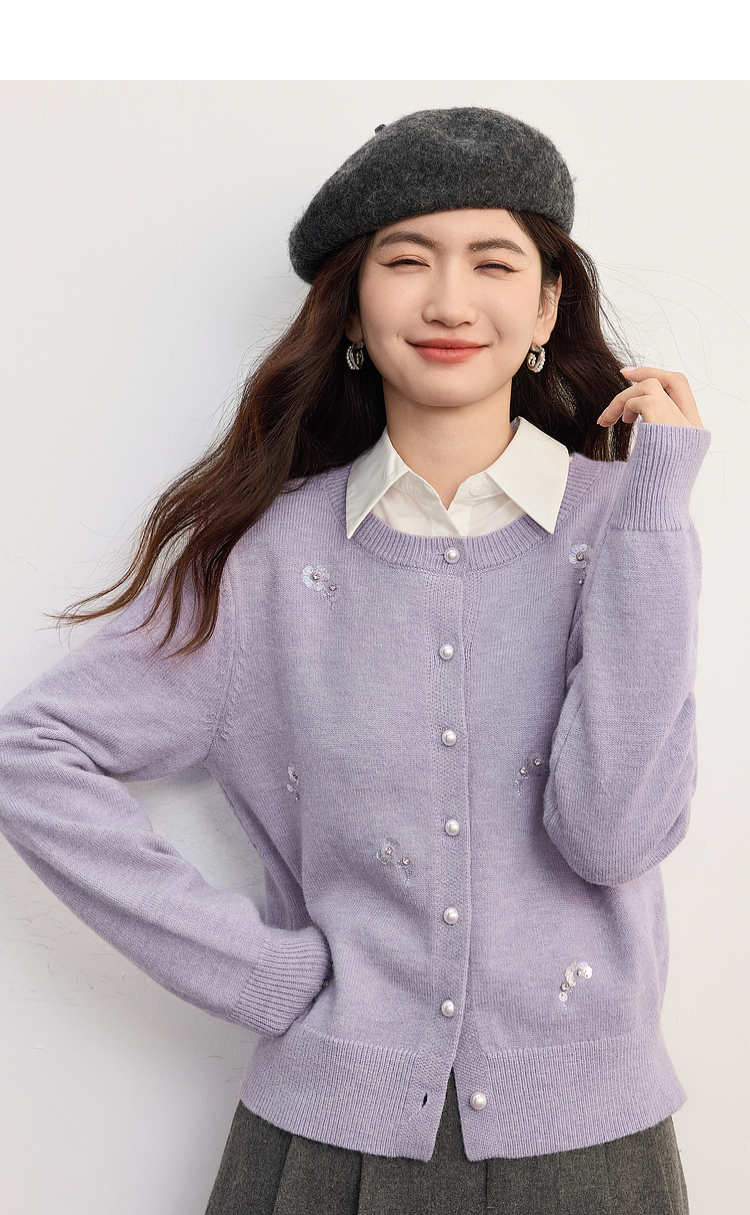 【09/10新品】熙世界珠片绣珍珠扣针织开衫女2025秋冬季新款紫色圆领毛衣短外套