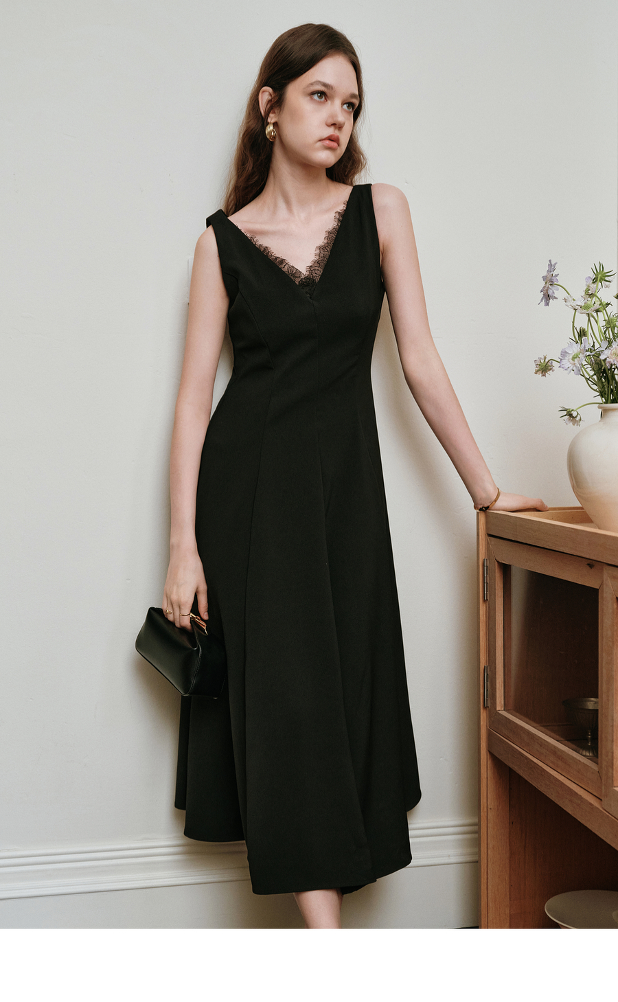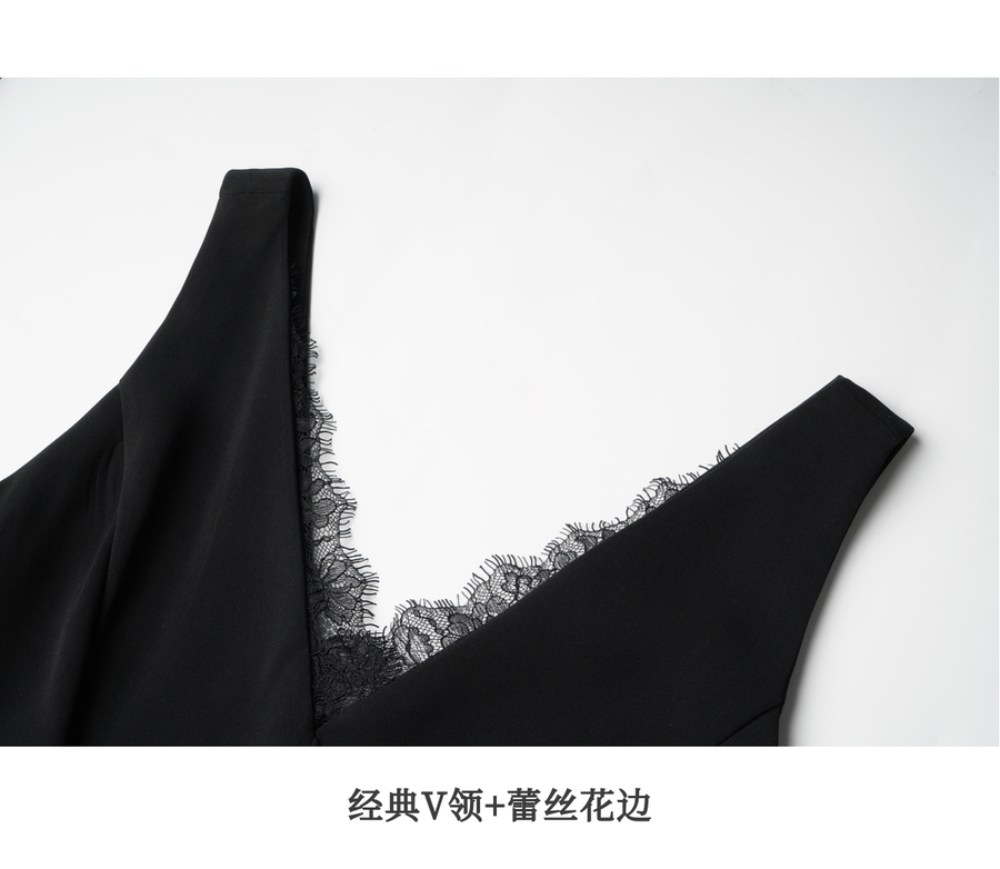 OLrain欧芮儿黑色赫本风蕾丝花边V领2025夏季新款收腰显瘦连衣裙