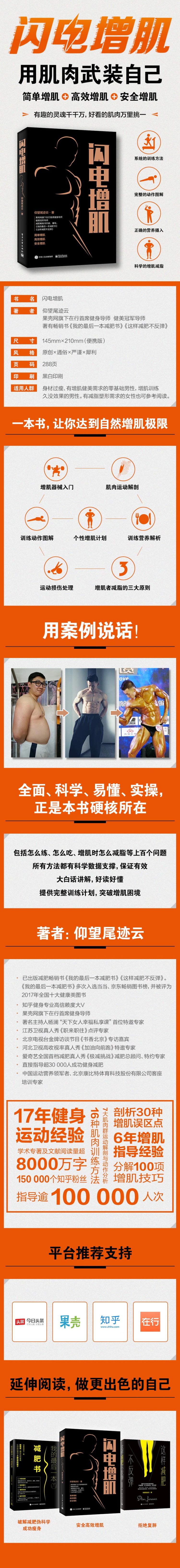 《闪电增肌》是仰望老师推出的第三本书。2017年和2018年仰望老师分别出版了减肥畅销书《我的*后一本减肥书》《这样减肥不反弹》,收获了读者的一致好评,重印数十刷,《我的*后一本减肥书》更是多次入选当当、*畅销图书榜,并被评为2017年全国十大健康类图书。