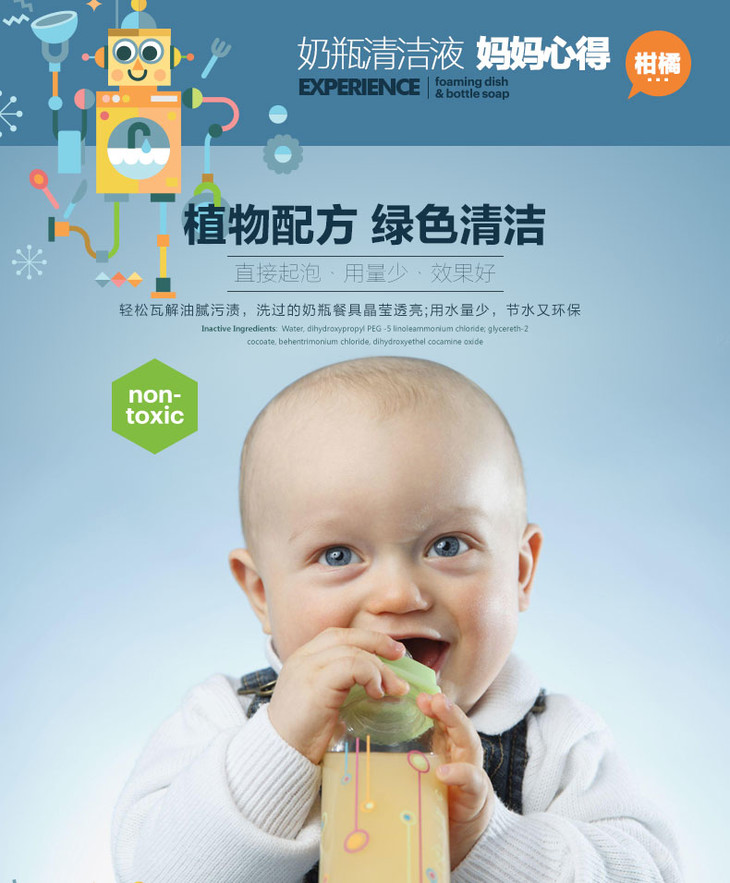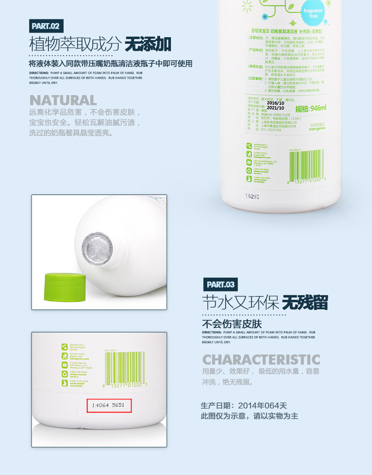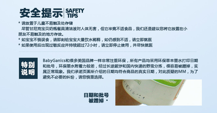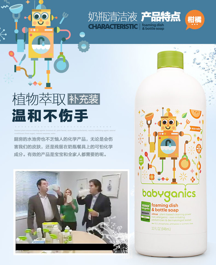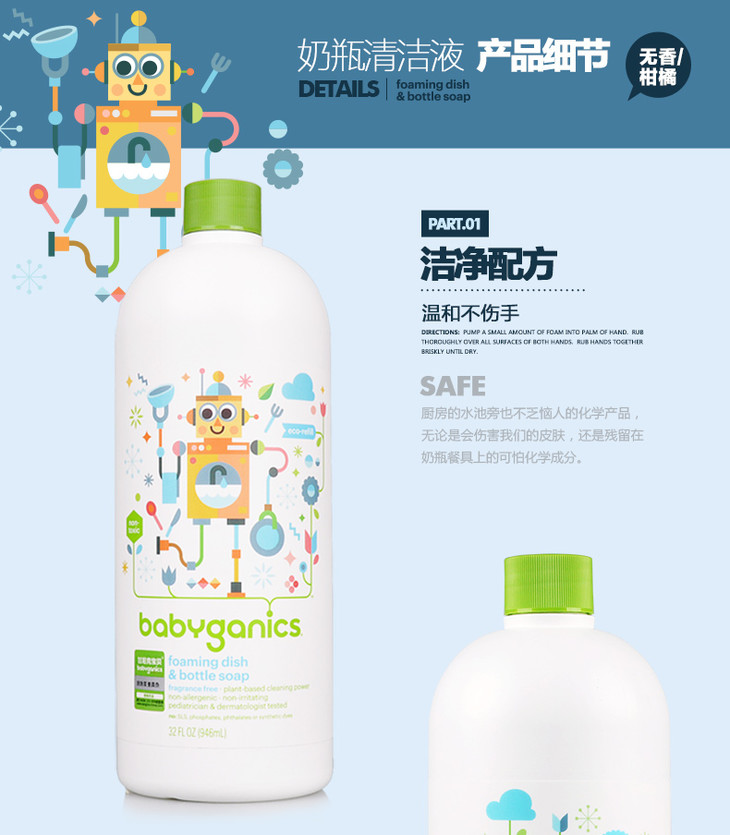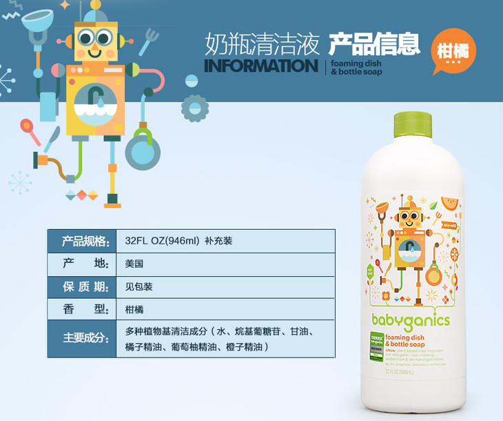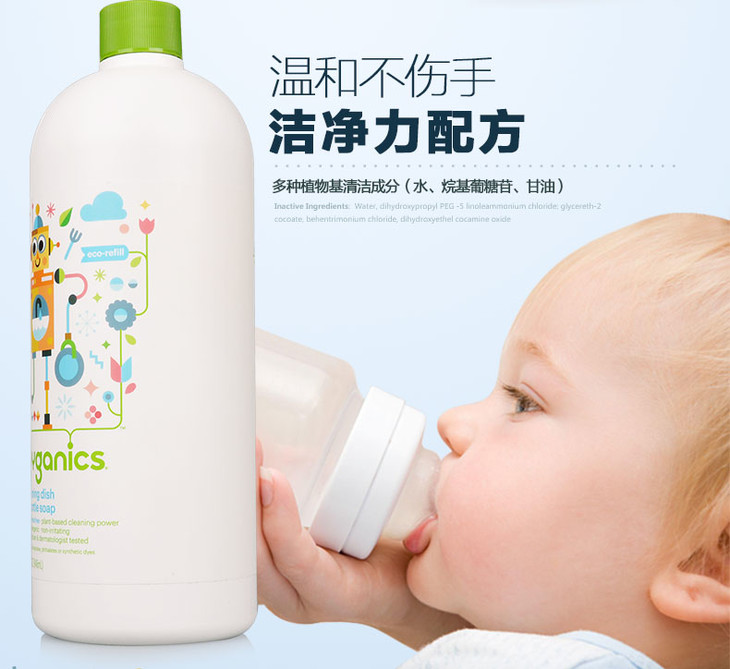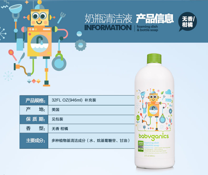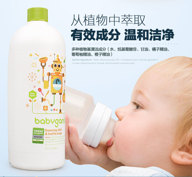 甘尼克宝贝BabyGanics天然奶瓶清洁液餐具果蔬清洗液补充装柑橘、无香946ml