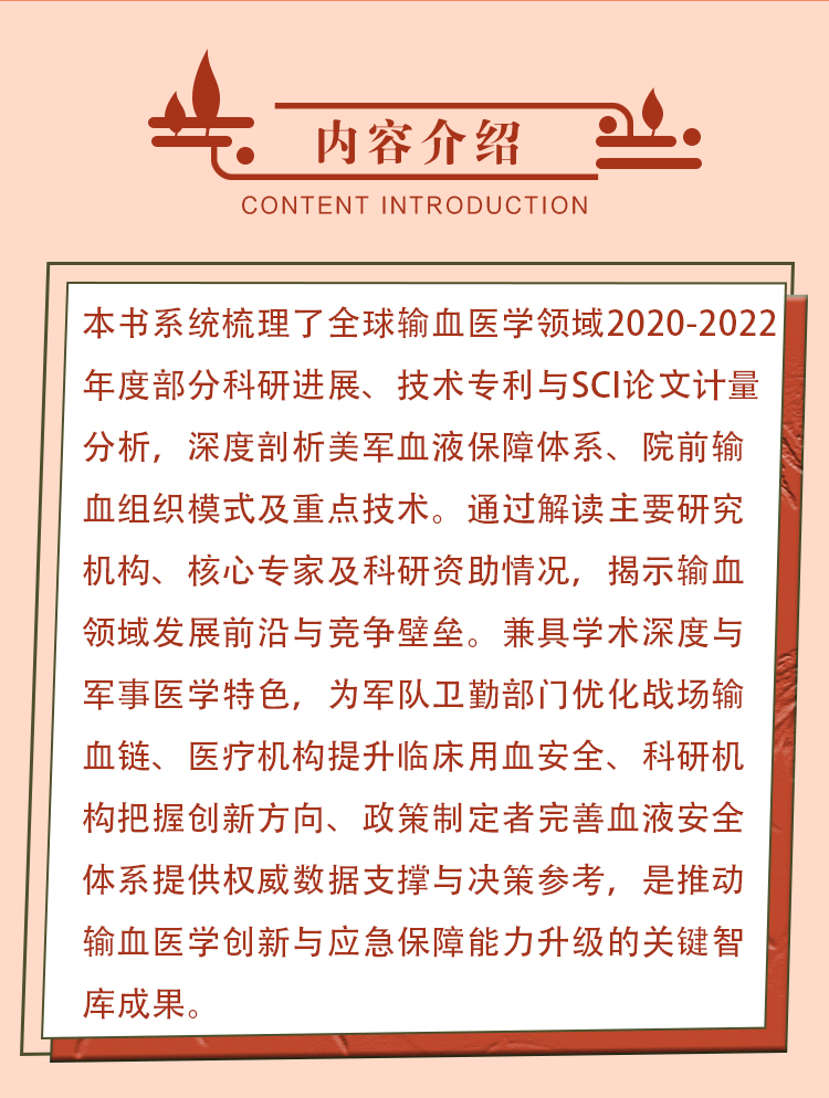本书系统梳理了全球输血医学领域2020-2022年度部分科研进展、技术专利与SCI论文计量分析,深度剖析美军血液保障体系、院前输血组织模式及重点技术。通过解读主要研究机构、核心专家及科研资助情况,揭示输血领域发展前沿与竞争壁垒。兼具学术深度与军事医学特色,为军队卫勤部门优化战场输血链、医疗机构提升临床用血安全、科研机构把握创新方向、政策制定者完善血液安全体系提供权威数据支撑与决策参考,是推动输血医学创新与应急保障能力升级的关键智库成果。